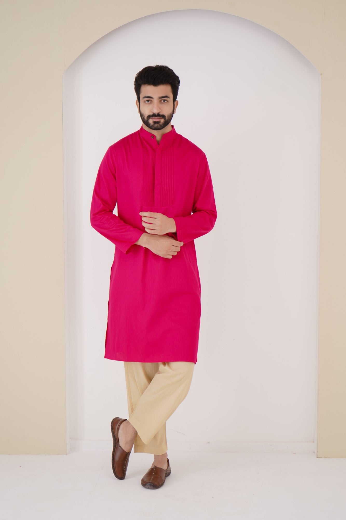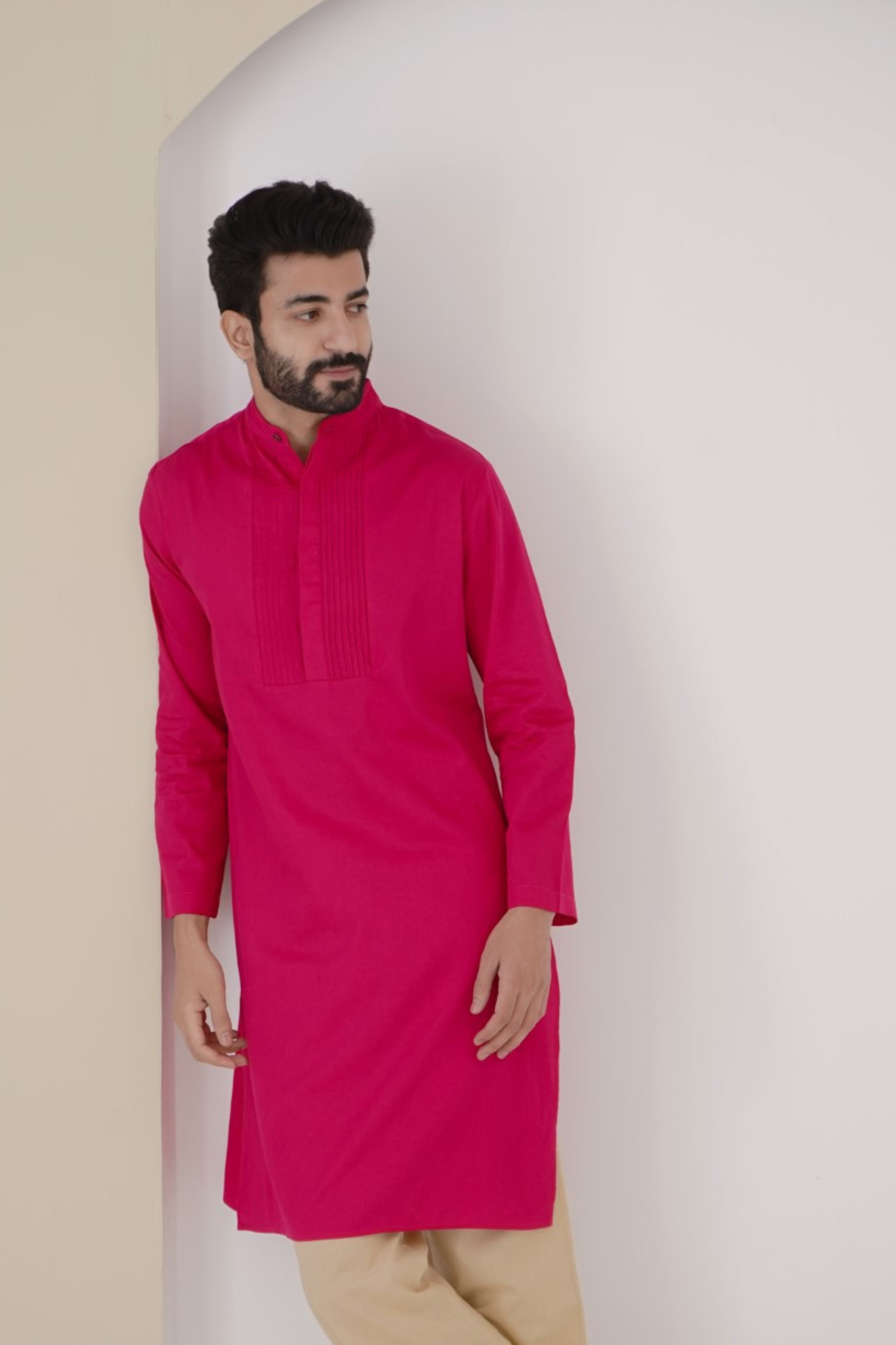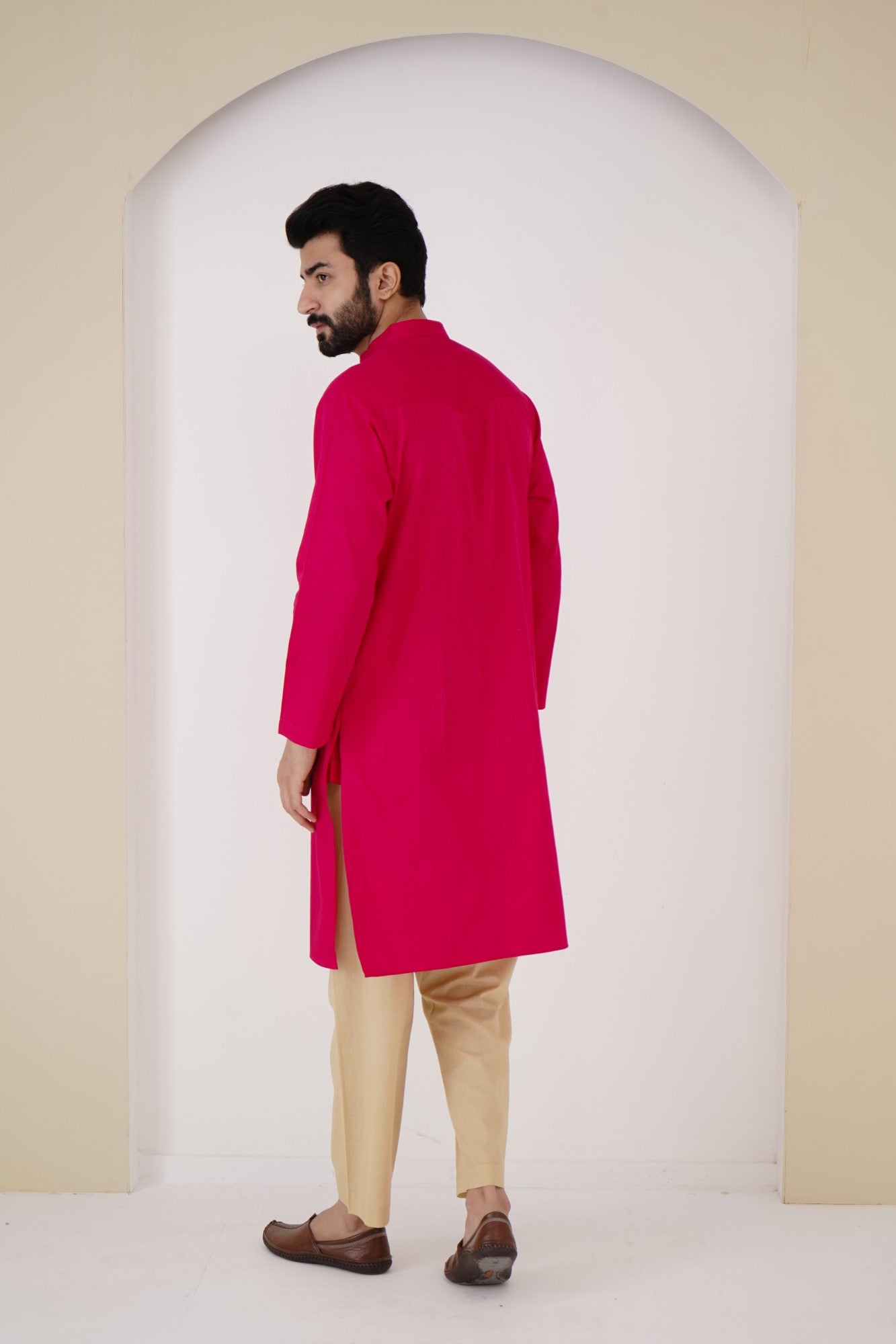 -Men's kurta in Fuchsia Pink Cotton Satin fabric with full length sleeves.