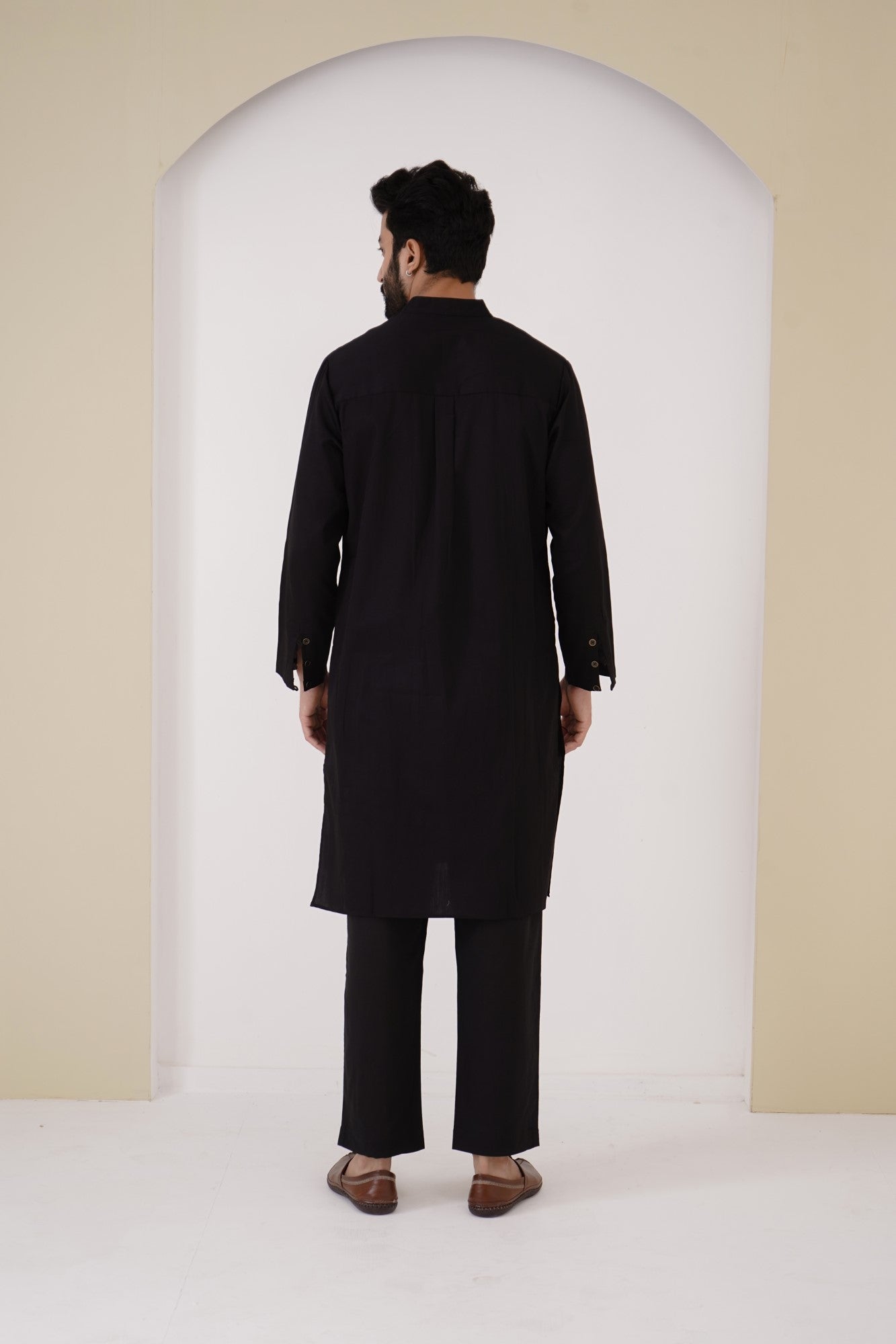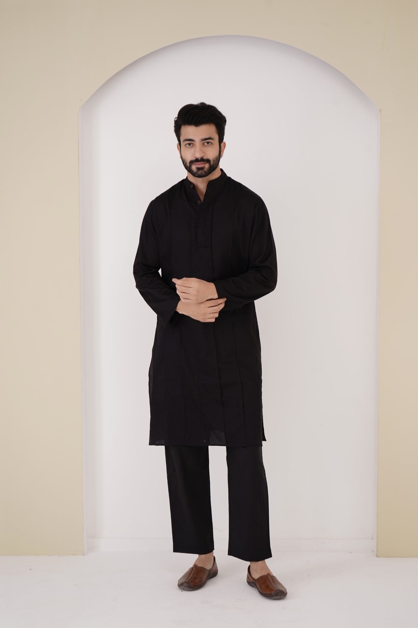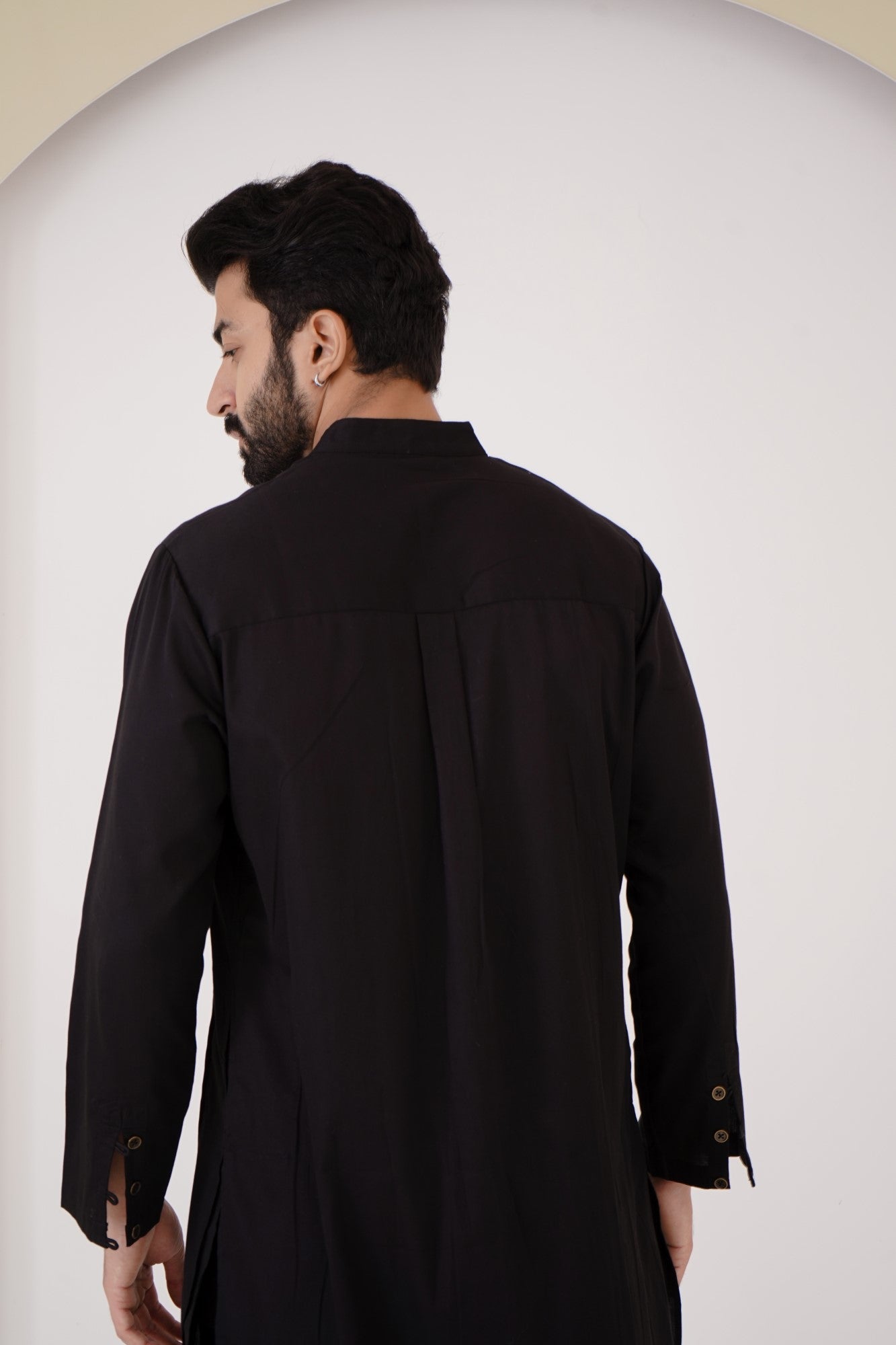 -Men's kurta in Black Cotton Satin fabric with full length sleeves.