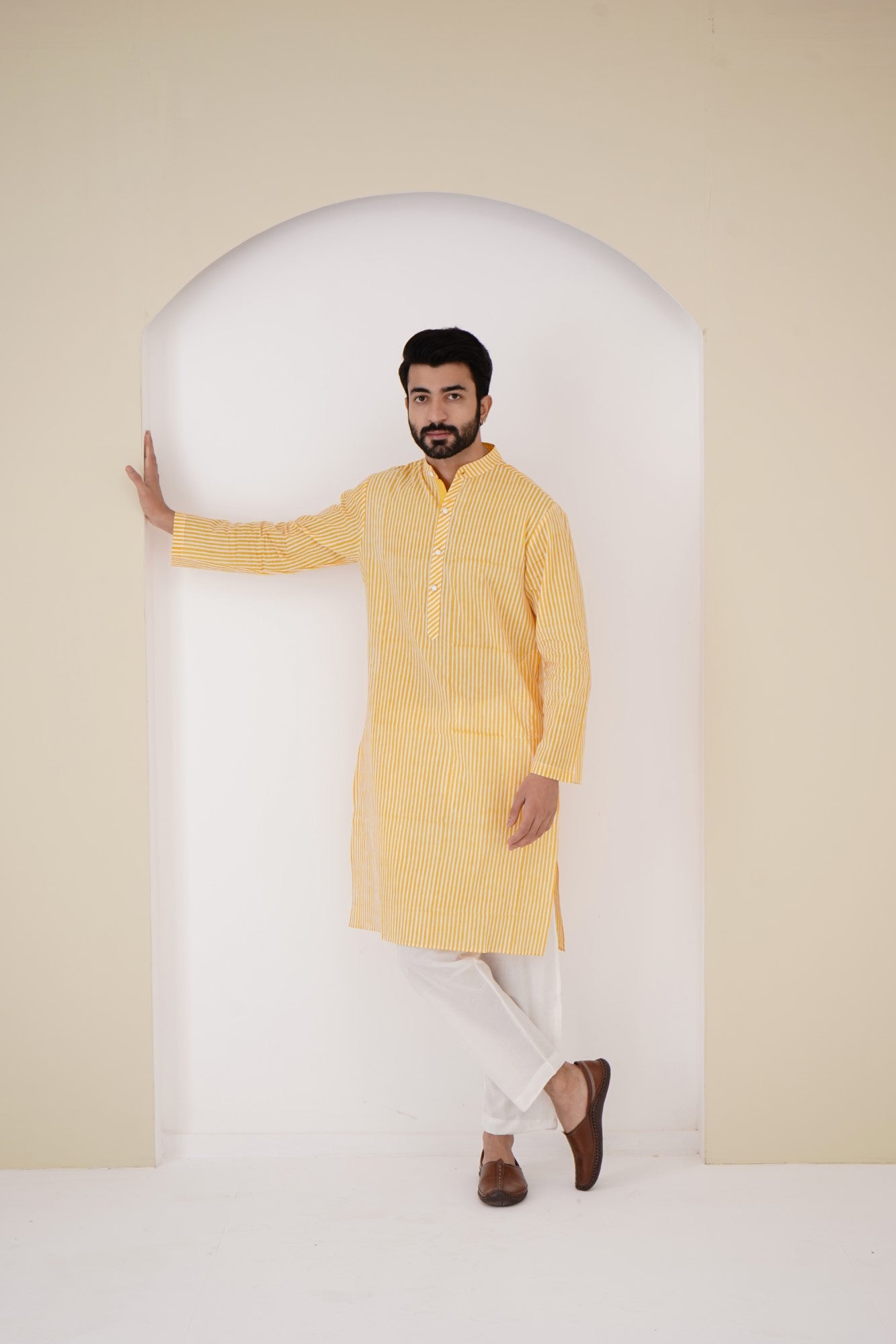 -Men's kurta in Hand Block Printed Stripe Cotton fabric with full length sleeves.
