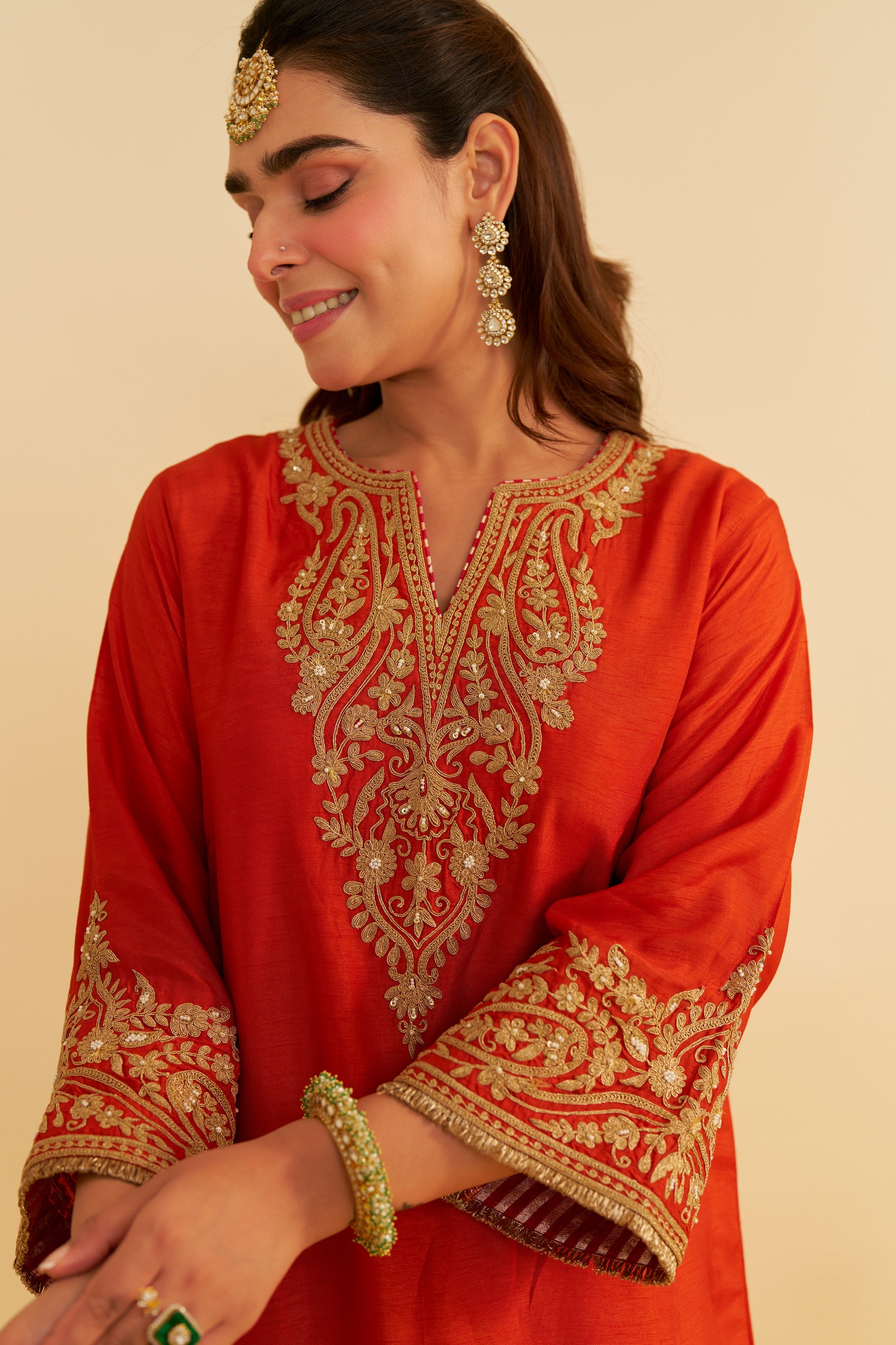 The Mehza Short Kalidaar Chauga Is Crafted From Pure Upada Silk, Offering A Rich And Elegant Drape. The Ensemble Is Adorned With Intricate Kiran Dori Embroidery And Highlighted With Delicate Pearl Accents, Lending A Refined Touch To The Traditional Design. It Features A Zero Neckline With A Slit, And Three-Quarter Bell Sleeves Finished With Classic Kiran Detailing. Paired With A Traditional Dogri Salwar, The Outfit Is Completed With A Contrasting Banarasi Fabric, Enhancing Its Overall Opulence And Timeless Appeal.
