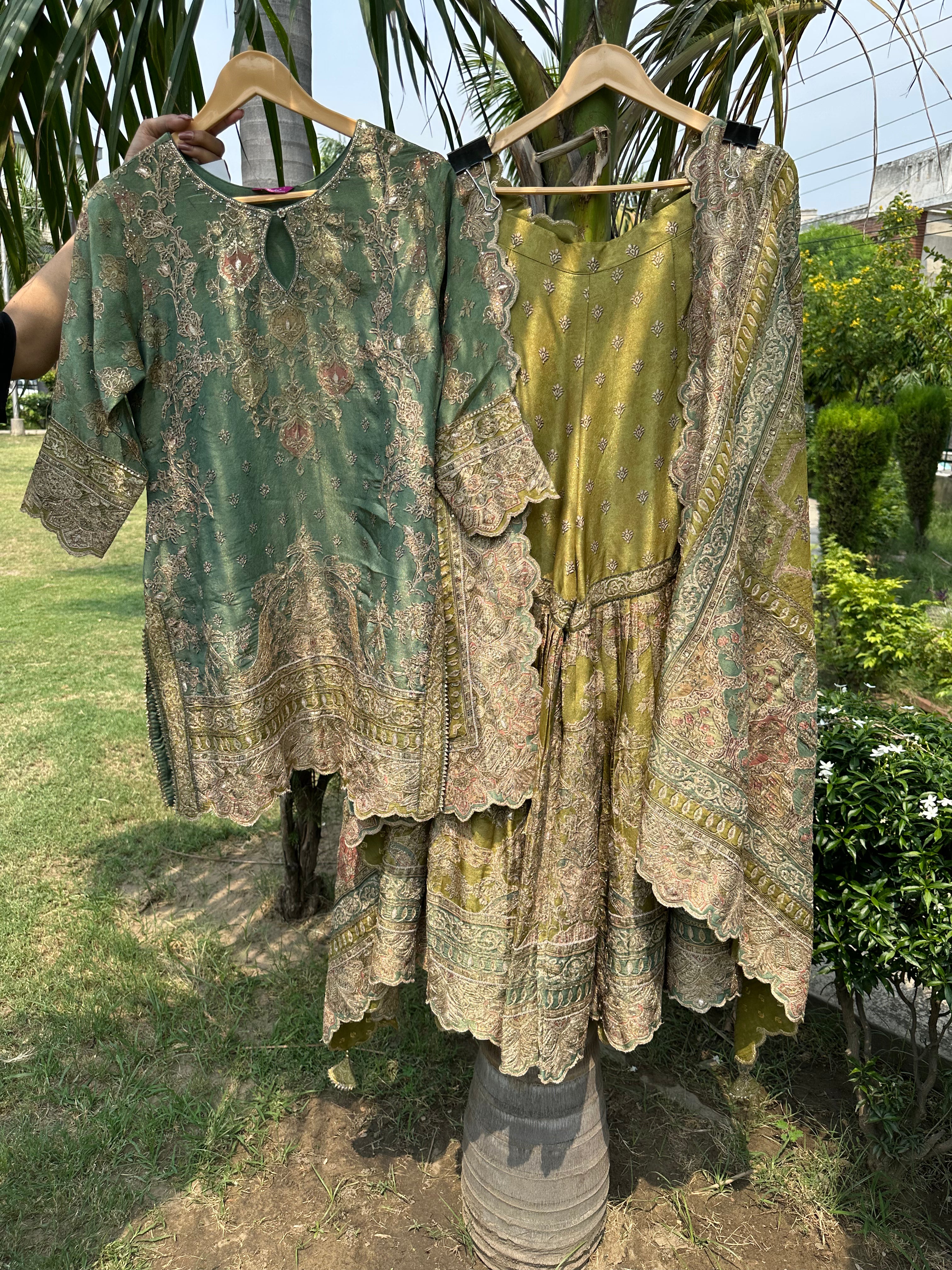 Step Into Effortless Elegance With This Digital Printed Designer Shimmer Silk Suit, Crafted For Those Who Love To Blend Tradition With A Modern Twist. The Luxurious Shimmer Silk Fabric Drapes Beautifully, While The Vibrant Digital Prints Add A Bold And Artistic Flair. Delicate Highlights Scattered Across The Entire Suit Catch The Light With Every Movement, Bringing A Subtle Sparkle And Festive Charm To The Ensemble. Perfect For Weddings, Celebrations, Or Evening Events, This Outfit Is A Show-Stopper That Promises Both Comfort And Timeless Appeal.