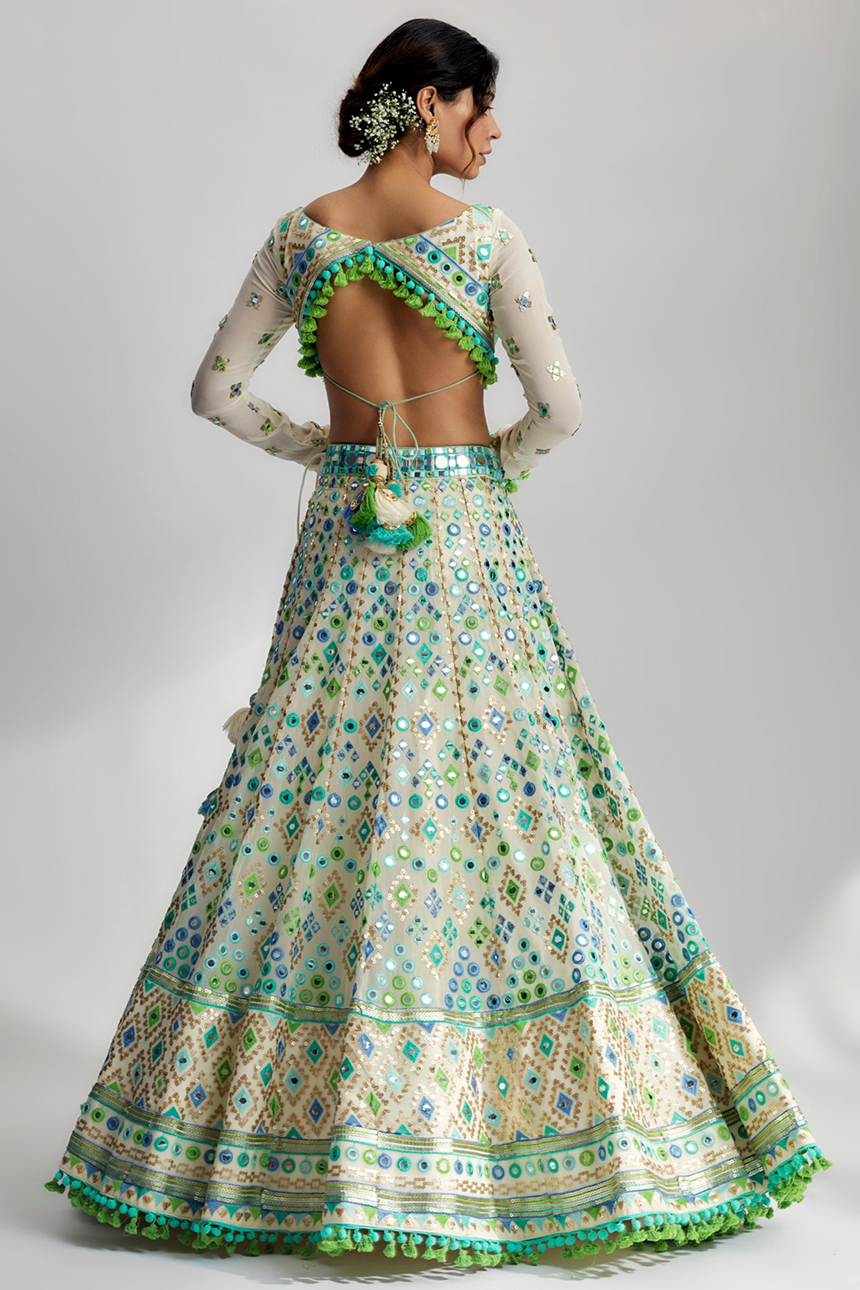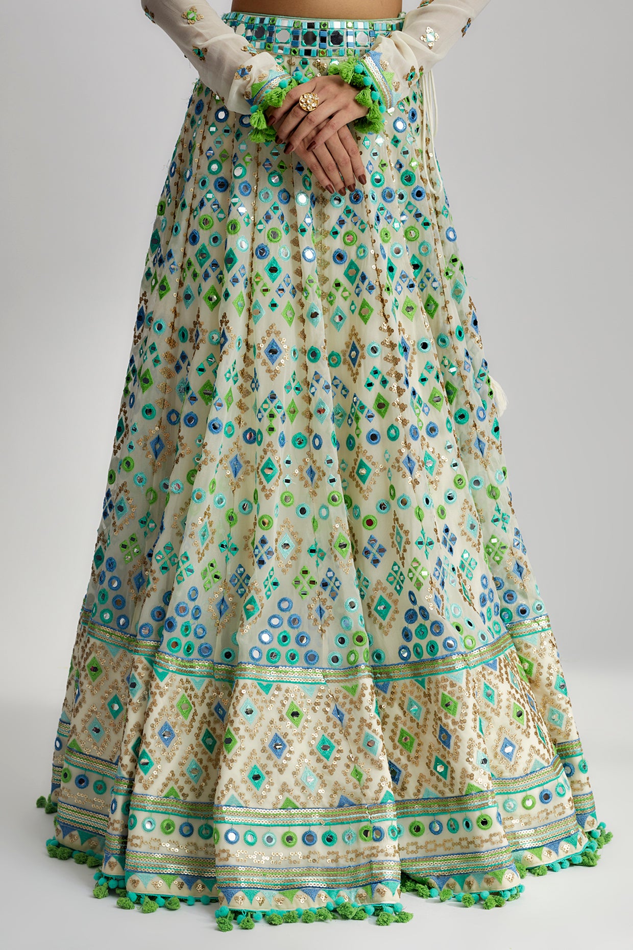 The detailed hand and machine embroidery on the Alani Lehenga Set further elevates its beauty. Skilled artisans have intricately adorned the blouse, skirt, and dupatta with exquisite embroidery patterns, using a combination of fine threads and sequins. The embroidery work adds depth and dimension to the ensemble, making it a true work of art.