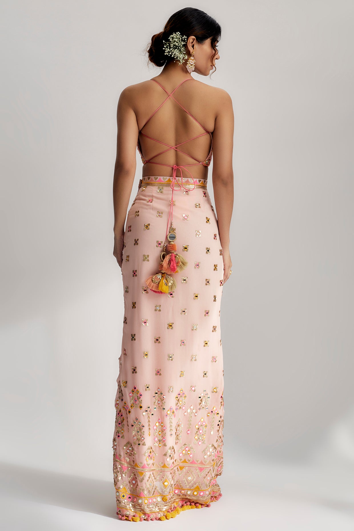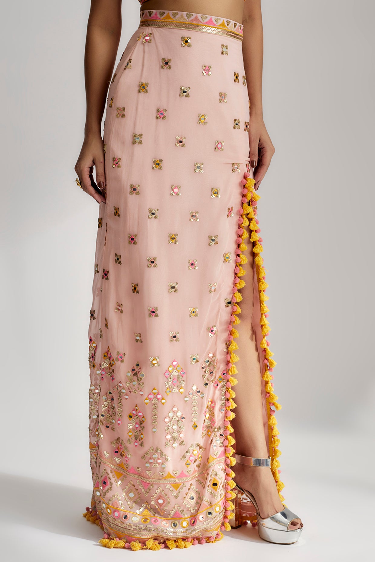 With its combination of mirror work, pompoms, tassels, and detailed embroidery, the Arari Skirt Set is a showstopper that will make you the center of attention at any festive gathering. It's a celebration of tradition and contemporary style, offering a perfect blend of elegance and playfulness for a truly memorable look.
