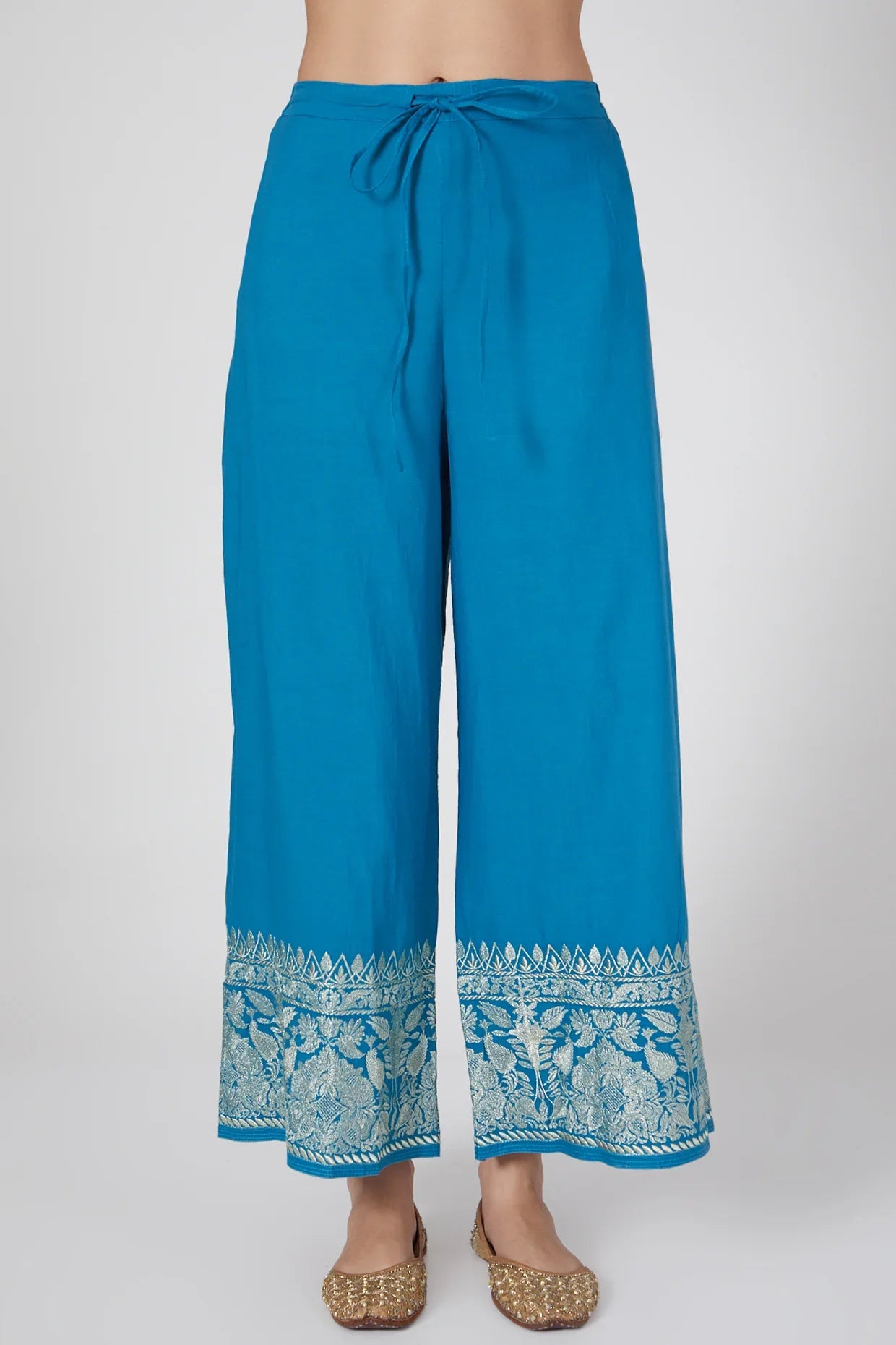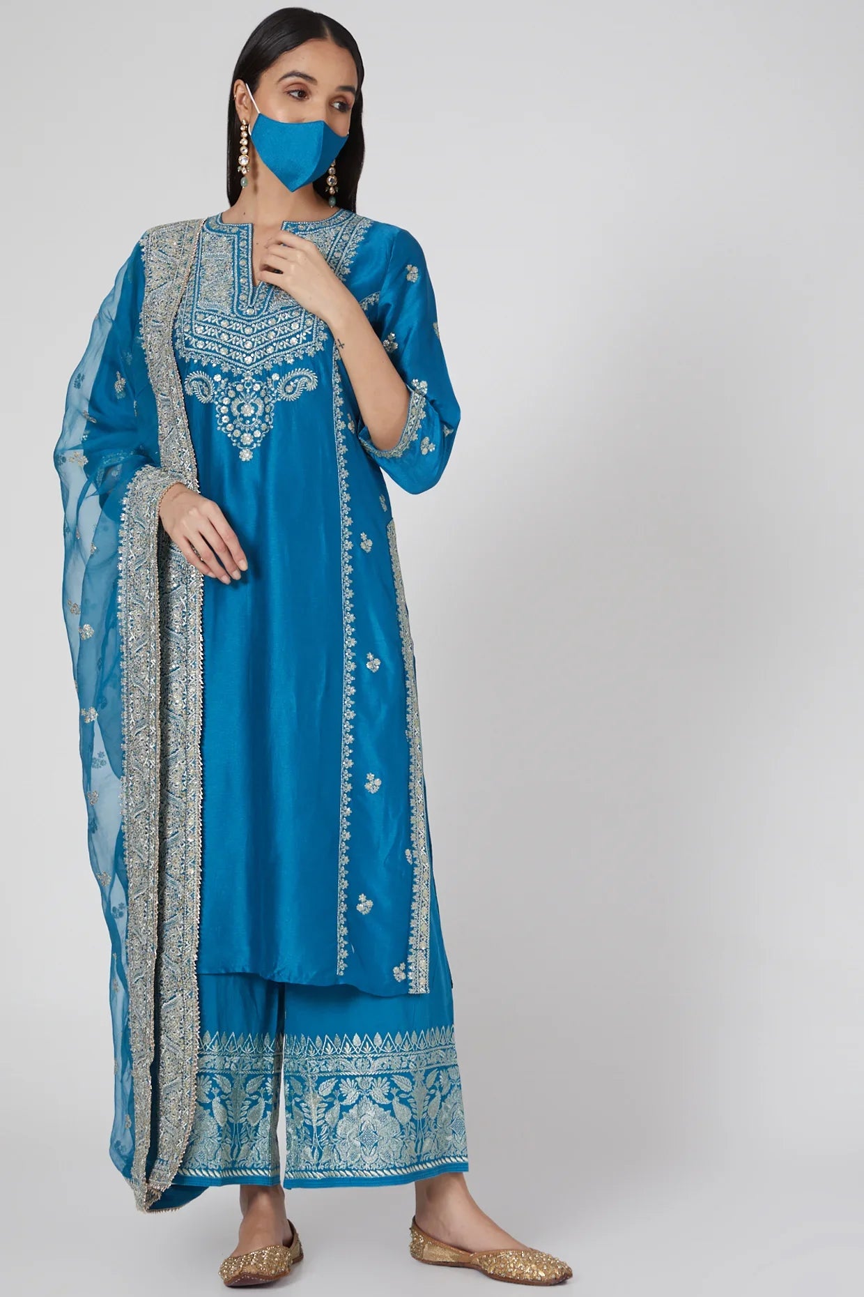 A Long Sleeved Kurta Paired With A Embroidered Palazzo And Dupatta