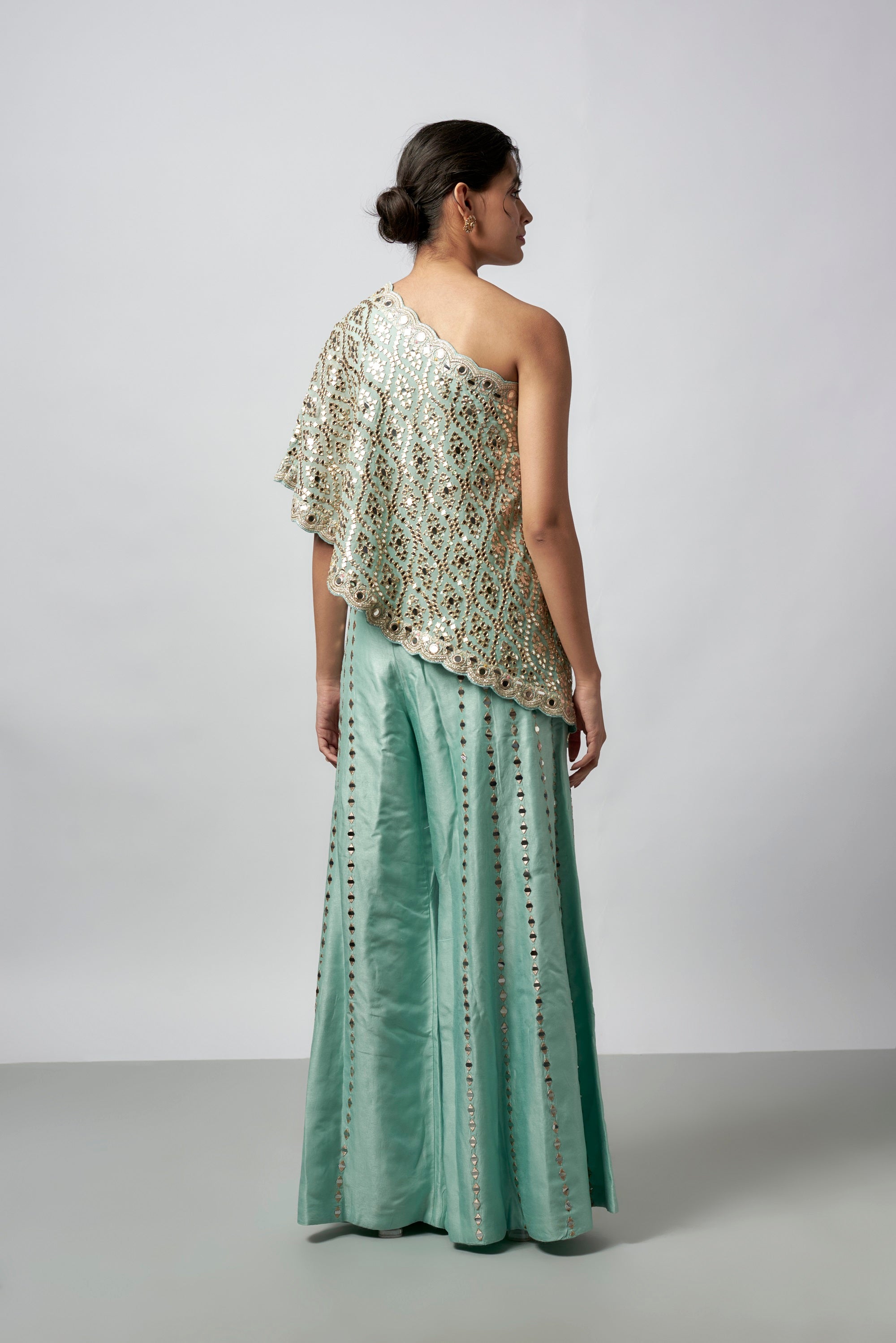 This Contemporary Pant Set Features A One-Shoulder Top With Exquisite Katri Mirror Work And Intricate Embroidery. The Flared Trousers Are Adorned With Vertical Mirror Detailing Making The Ensemble Perfect For Modern Occasions As Well.