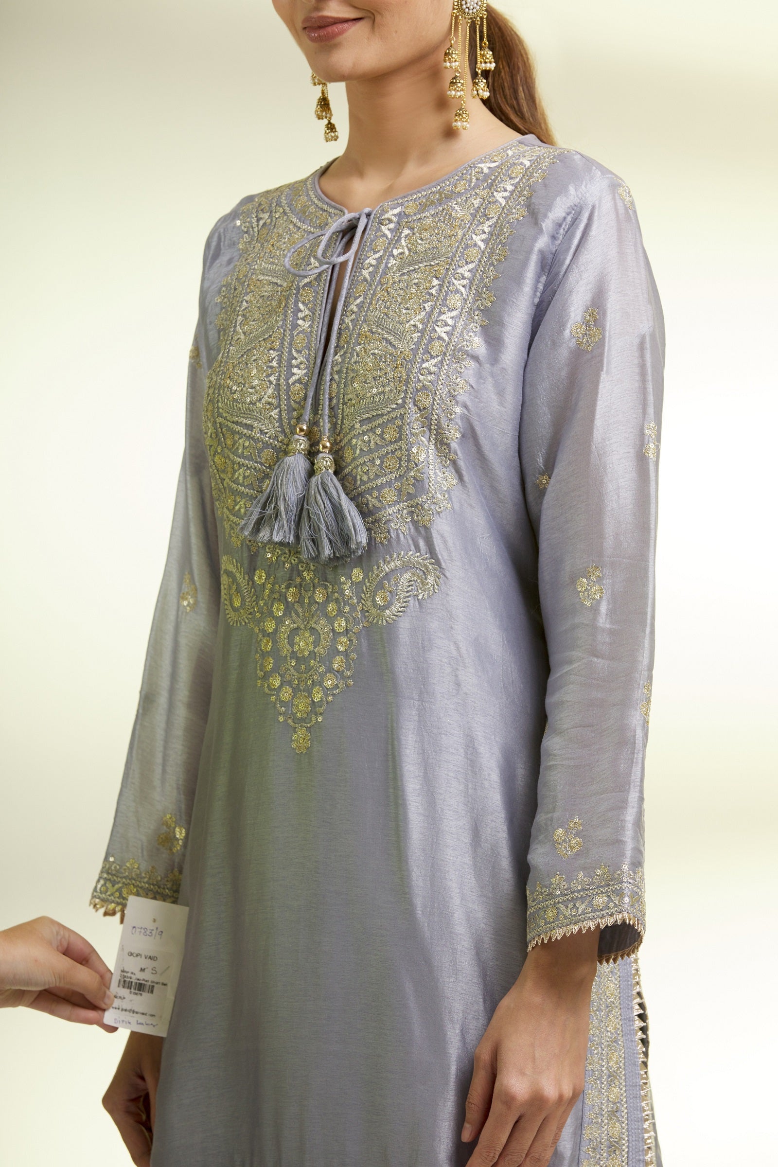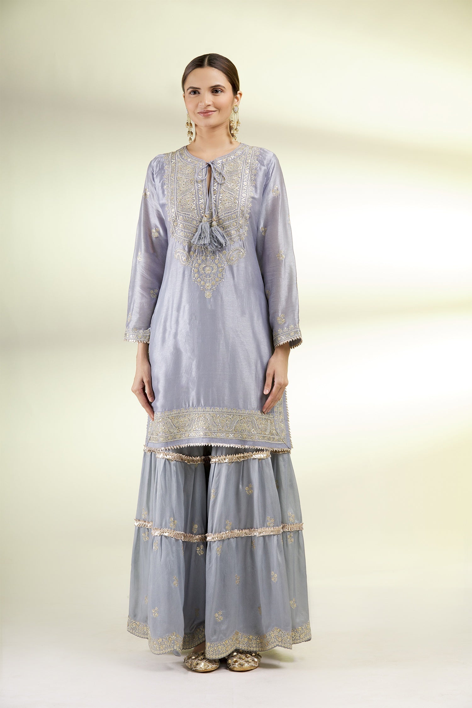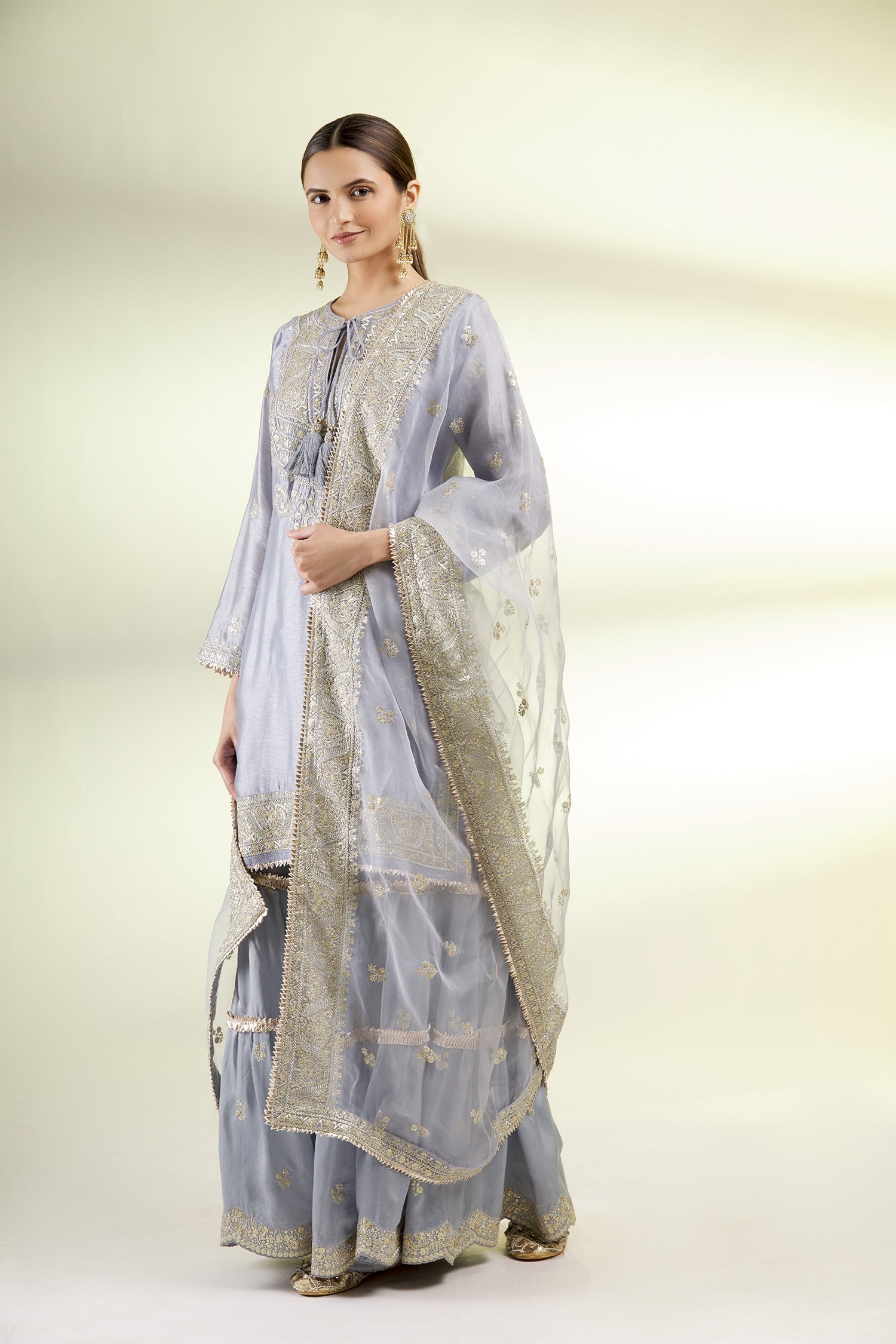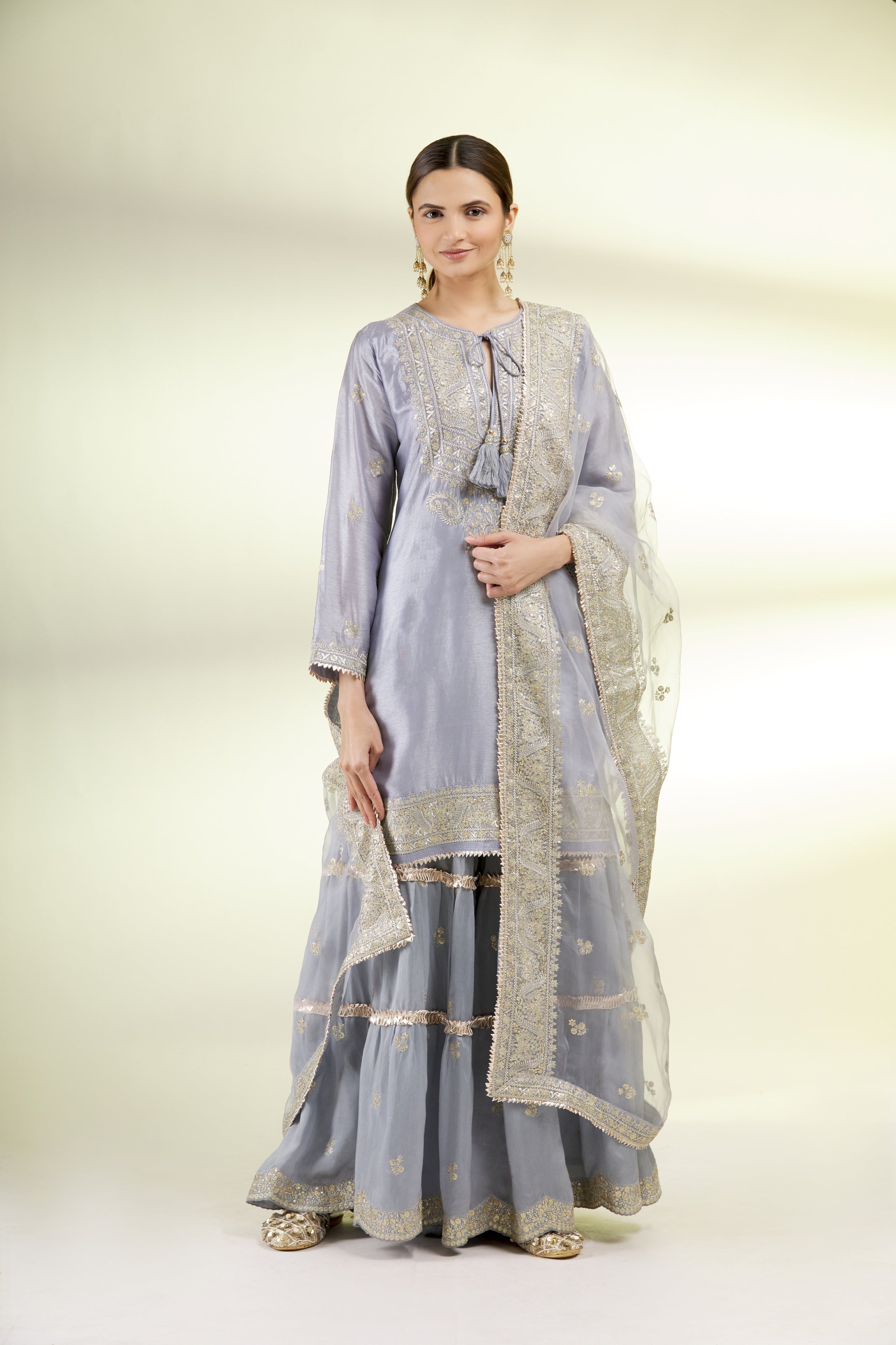 Featuring A Kurta In Cotton Silk Base With Long Sleeves. It Is Paired With Matching Sharara Pants In Cotton Base Having Embroidery And An Organza Dupatta.