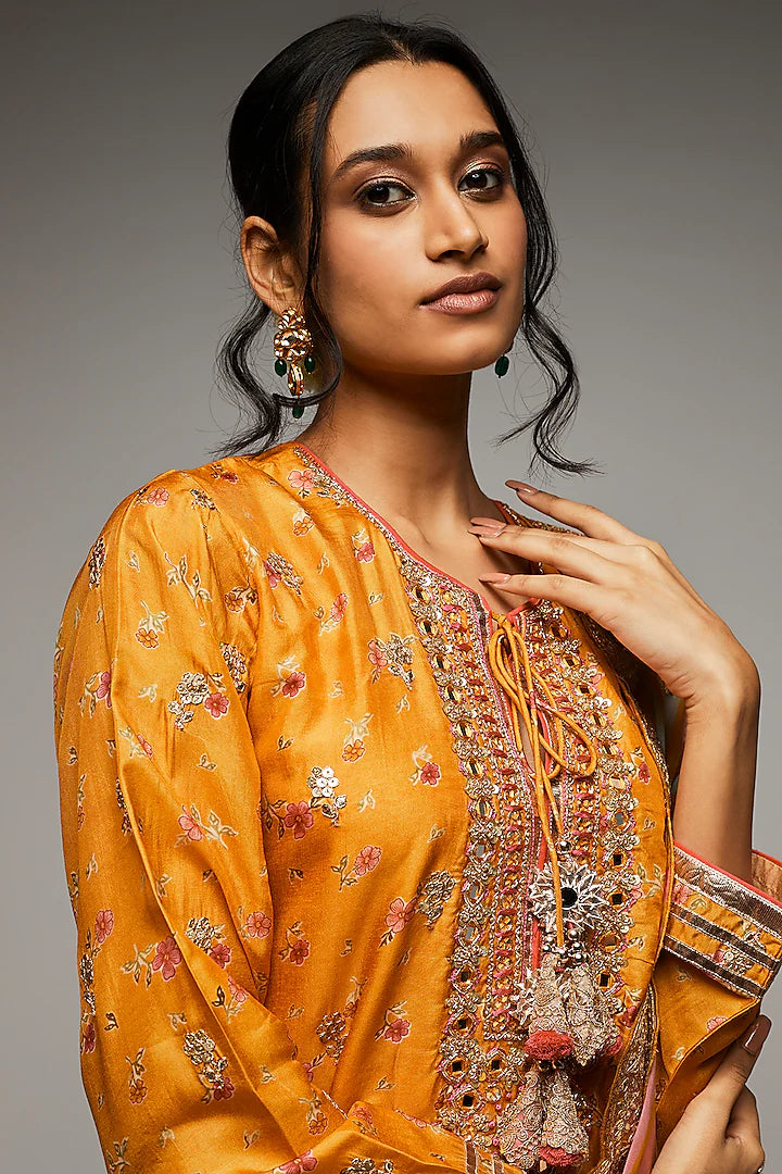 Rashida Long Sleeved Tunic on rich tassar silk, combines floral bud and leaf buttis. More delicate gota, dori and sequins as all over buttis and borders end in pretty scallops fun tassels bring maasti to the collection which is perfect for mehendis, pujas and festivities.