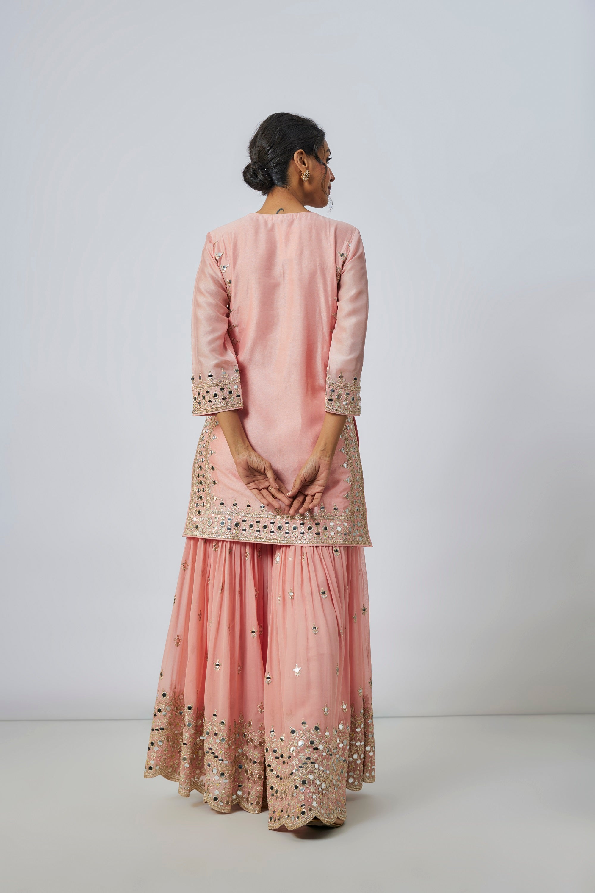This Sharara Set Features Kurta With Intricate Mirror Work And Delicate Embroidery Complemented By A Voluminous Sharara, Adorned With Scattered Embellishments And A Border Of Detailed Mirror Work. It's Completed With A Dupatta With Sparkling Sequins And Bordered With Intricate Patterns.