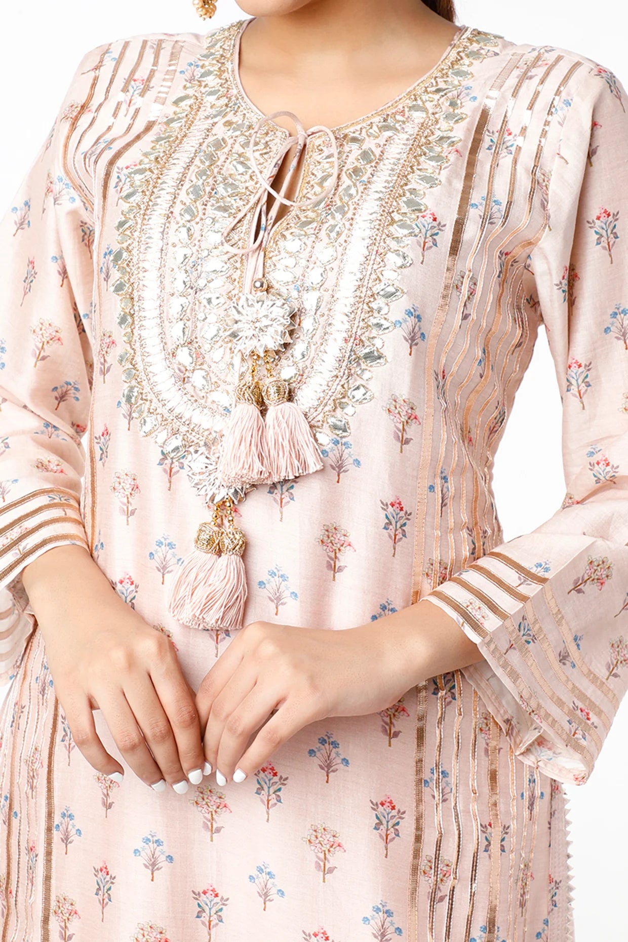 Featuring a Long Kurta In Chanderi Base. It Has Print, Embellished Gota Lines, Drawstrings And Mulmul Underling.