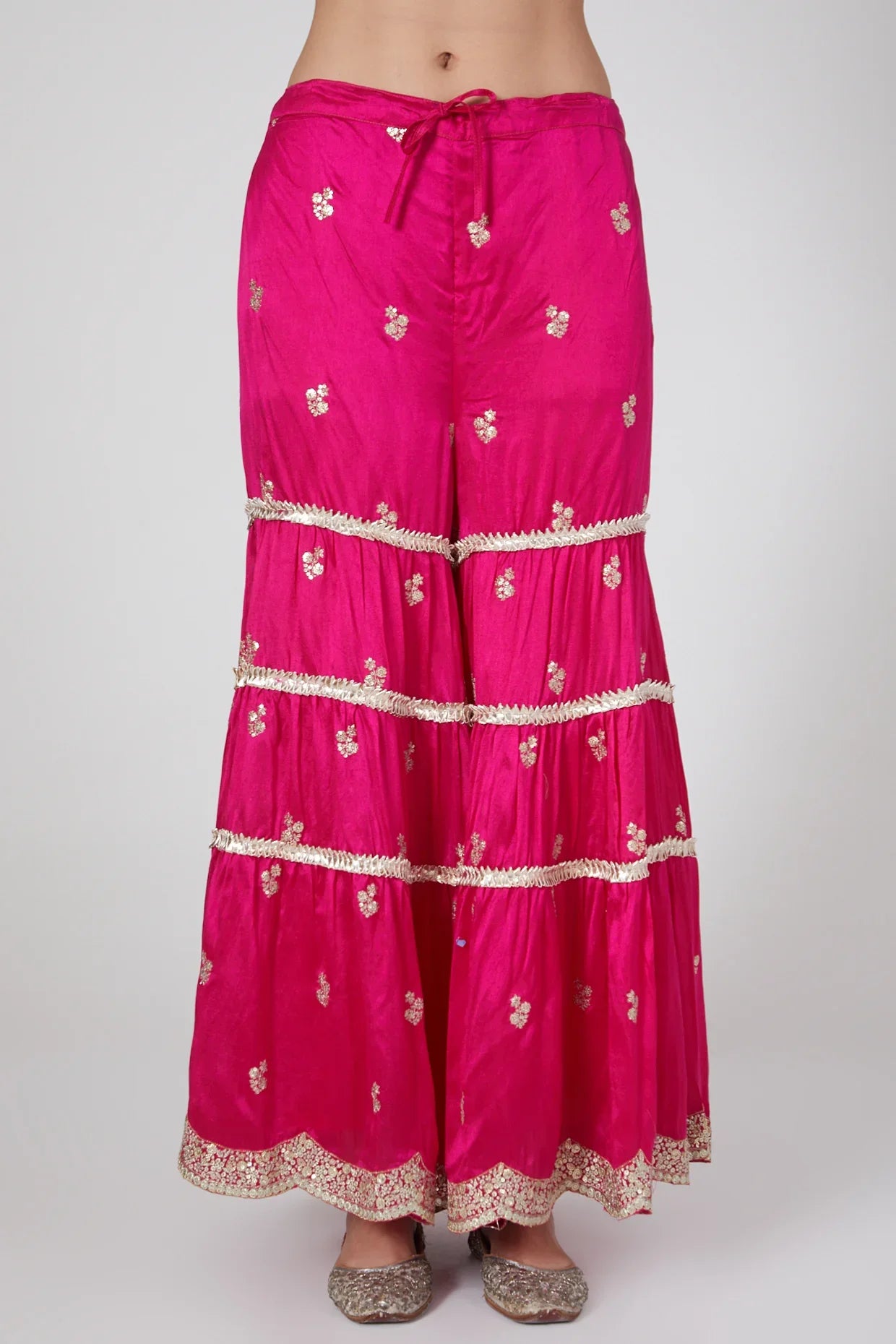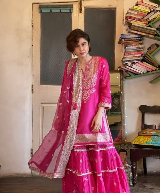 Featuring A Kurta In Cotton Silk Base With Long Sleeves. It Is Paired With Matching Sharara Pants In Cotton Base Having Embroidery And An Organza Dupatta.