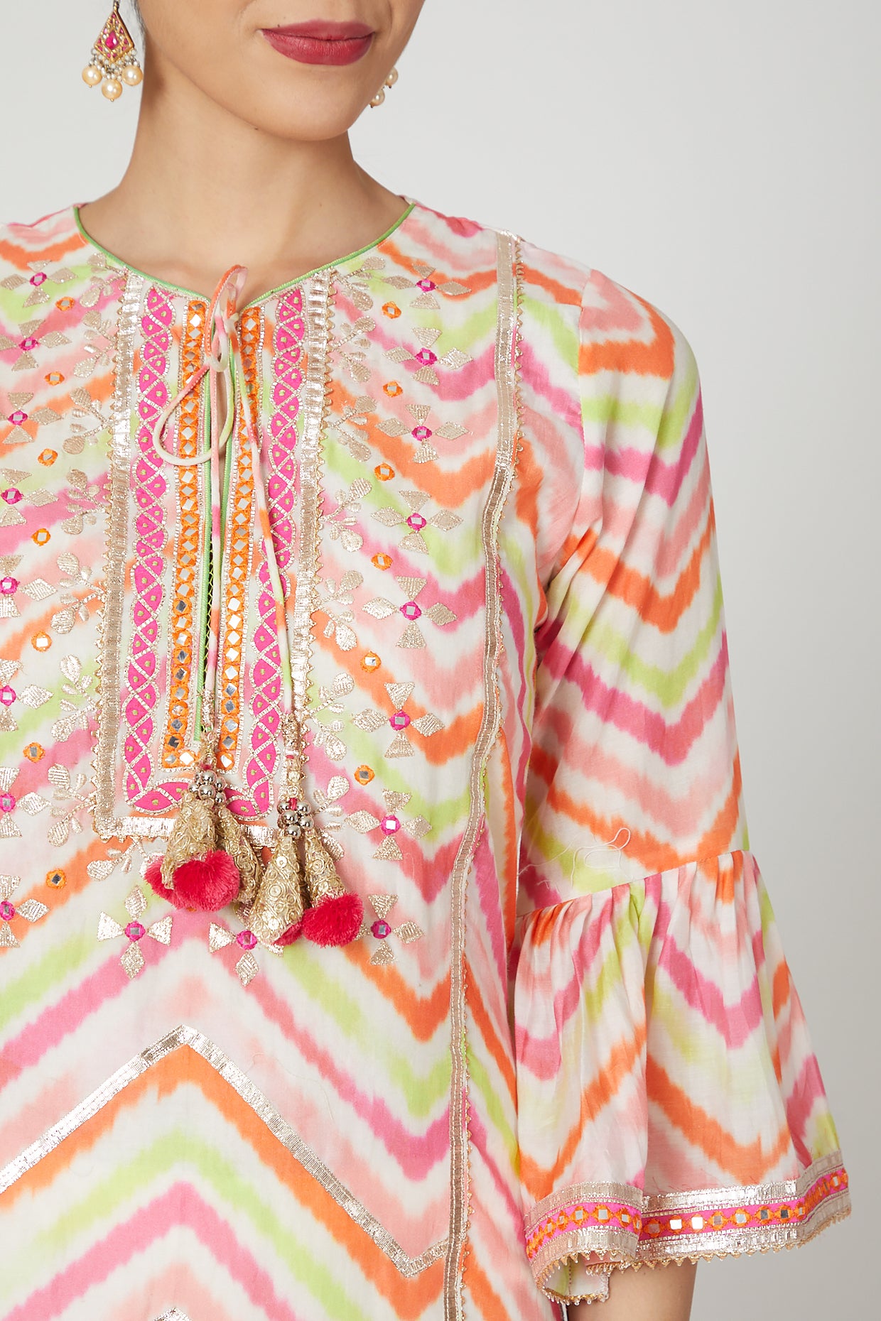 This long tunic in zig zag printed cotton silk is embroidered with gota, mirror and bright threadwork on the neckline to the ensemble.