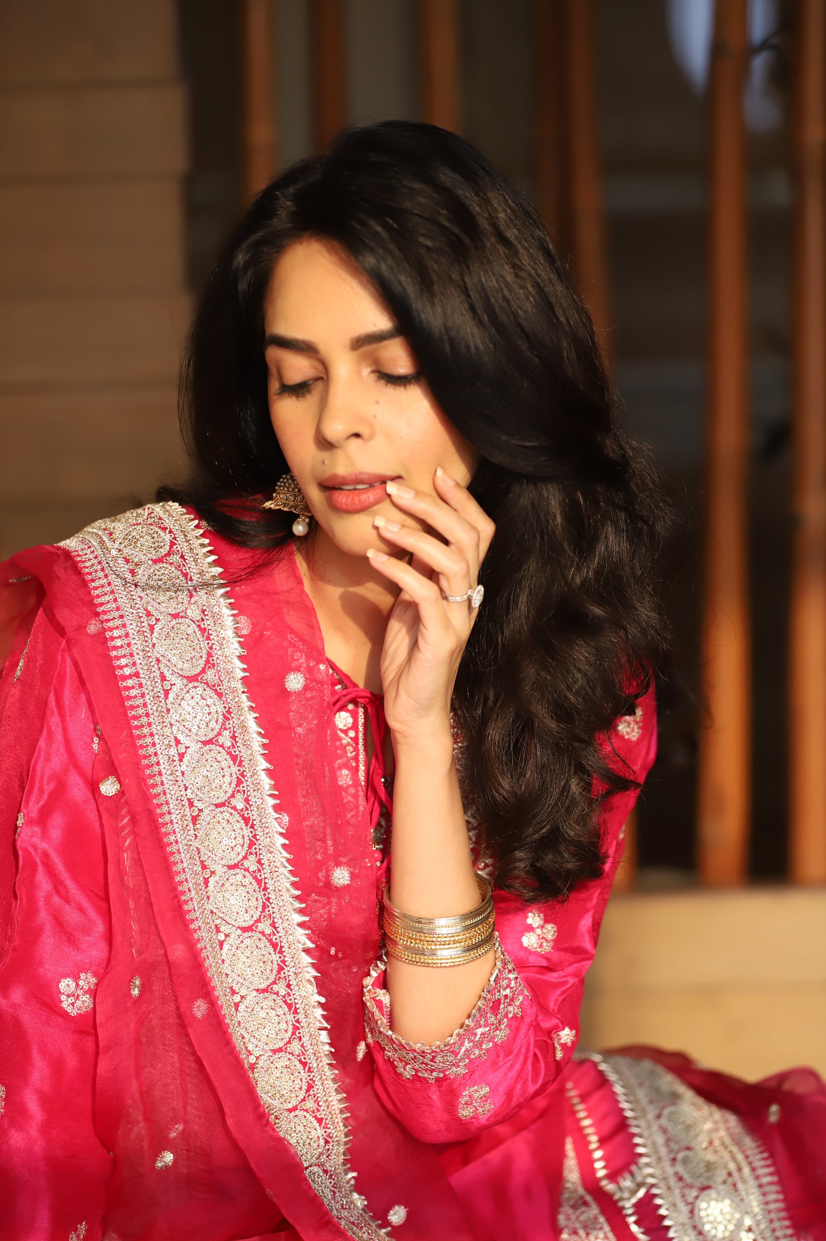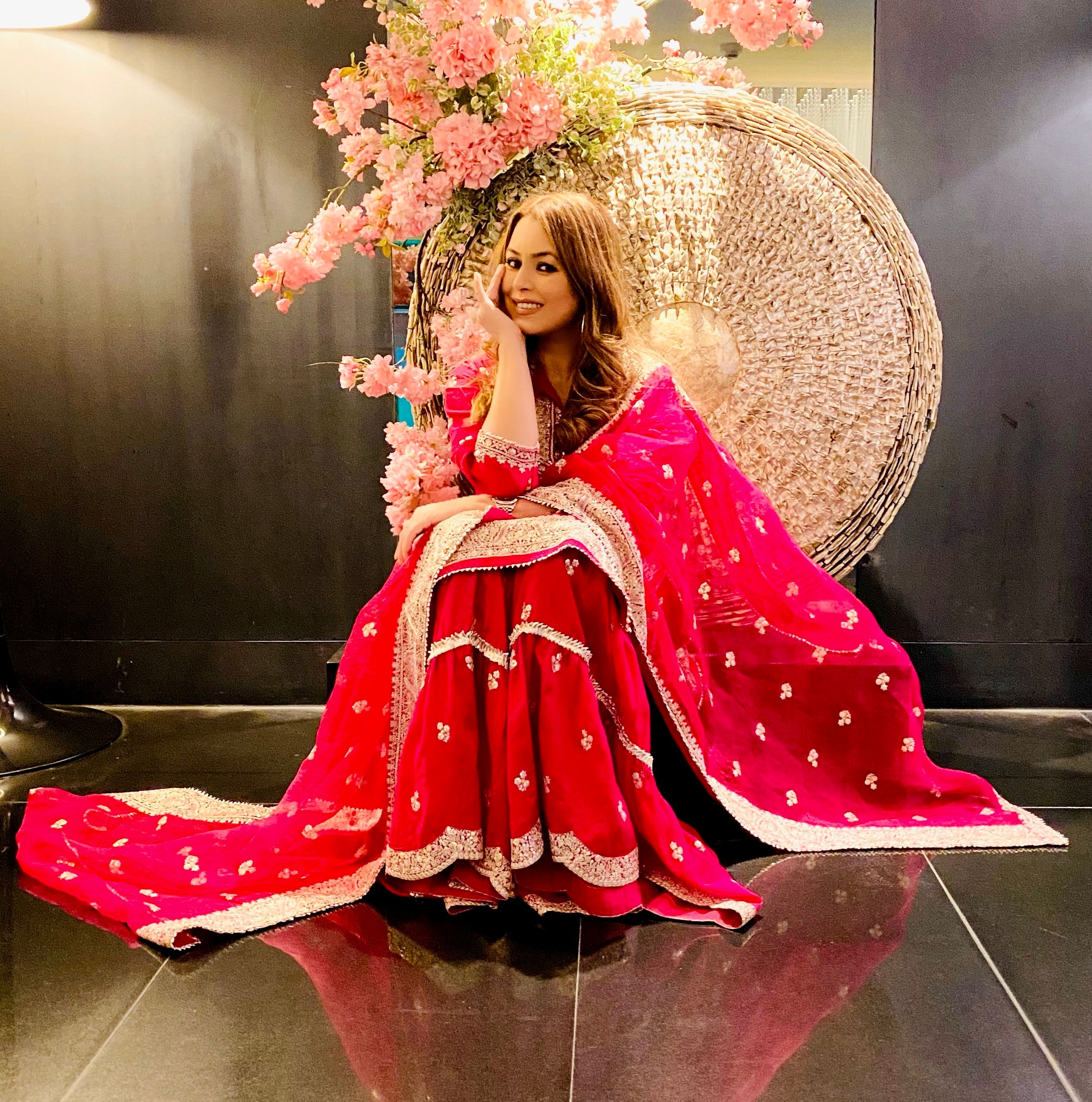 Featuring A Kurta In Cotton Silk Base With Long Sleeves. It Is Paired With Matching Sharara Pants In Cotton Base Having Embroidery And An Organza Dupatta.