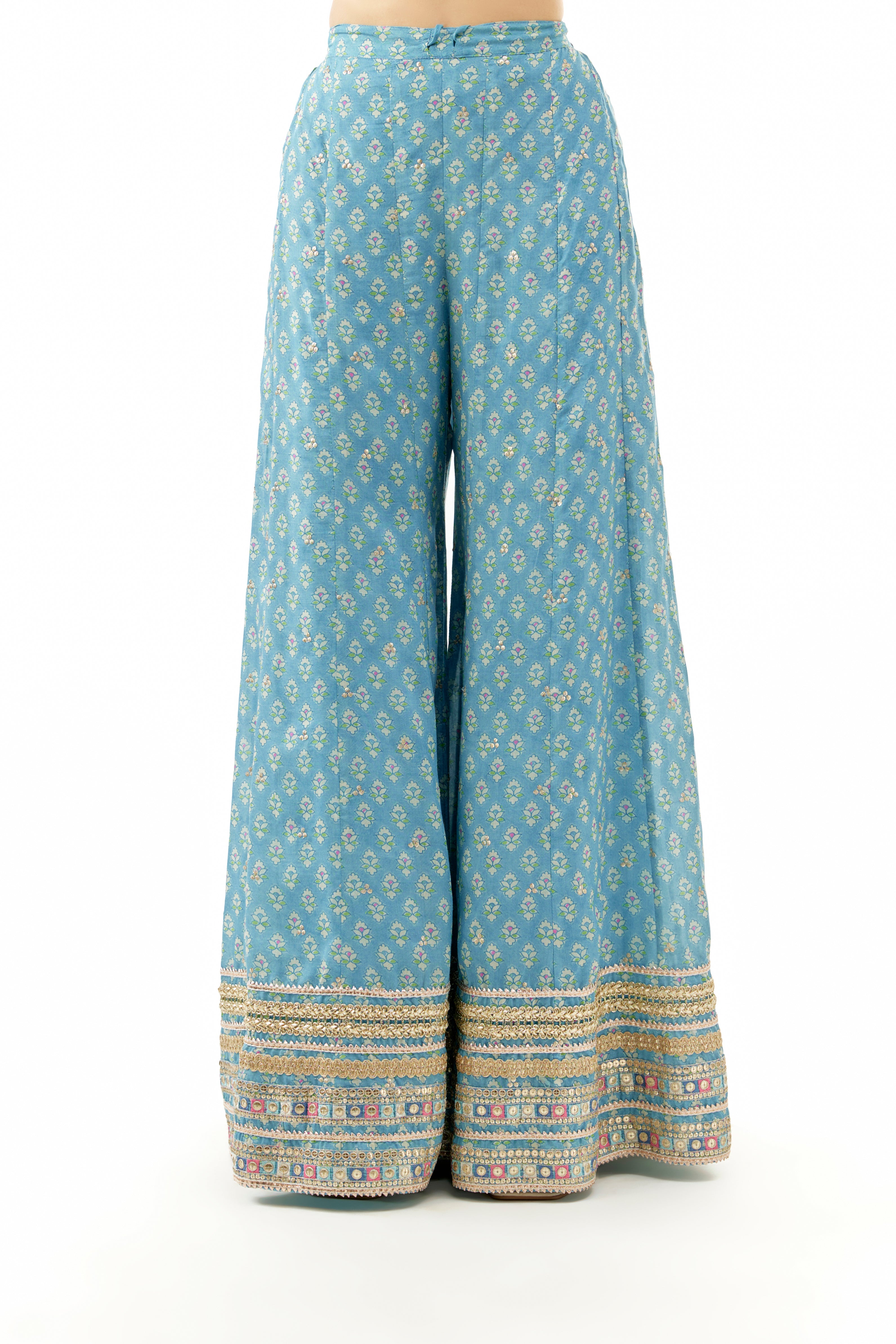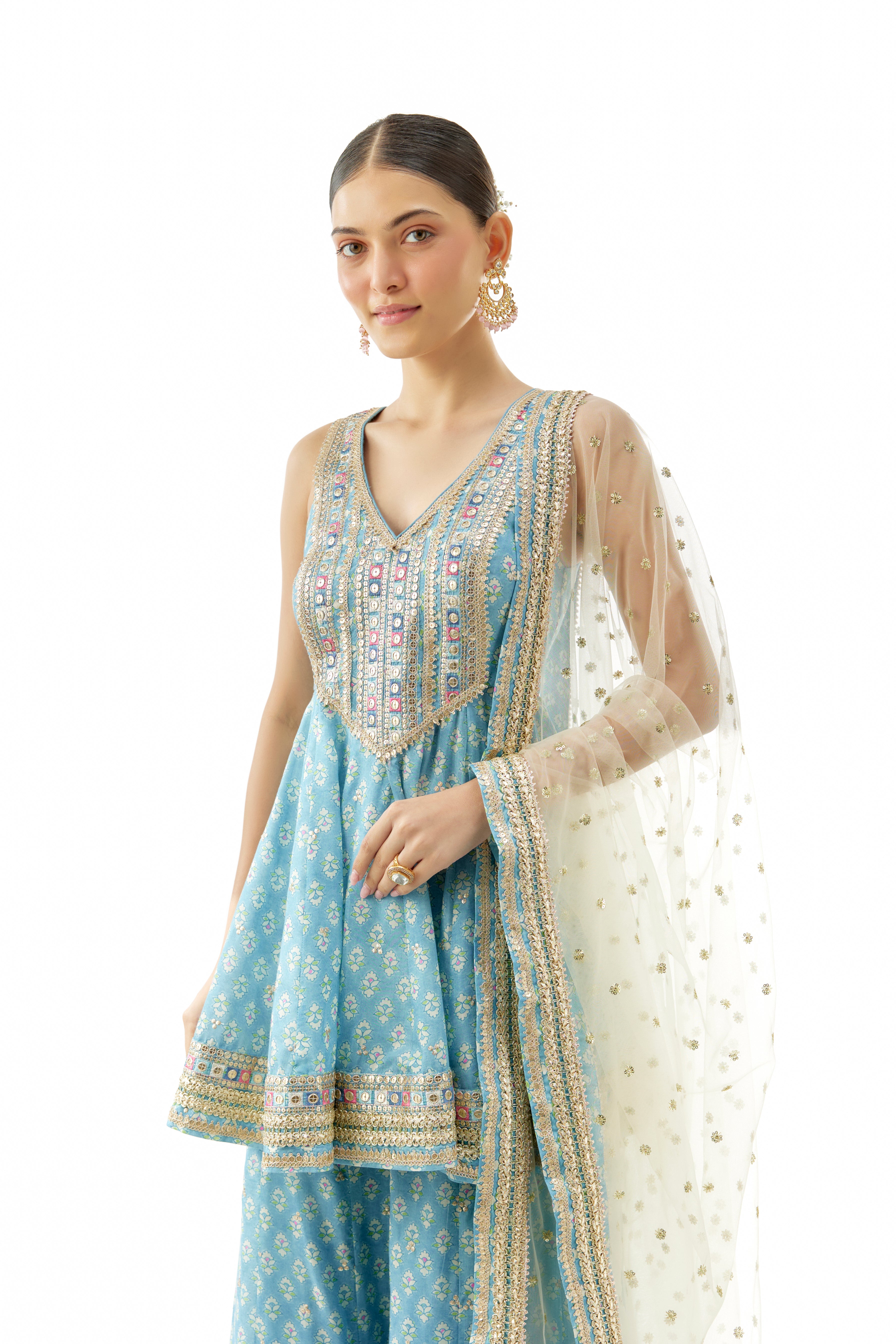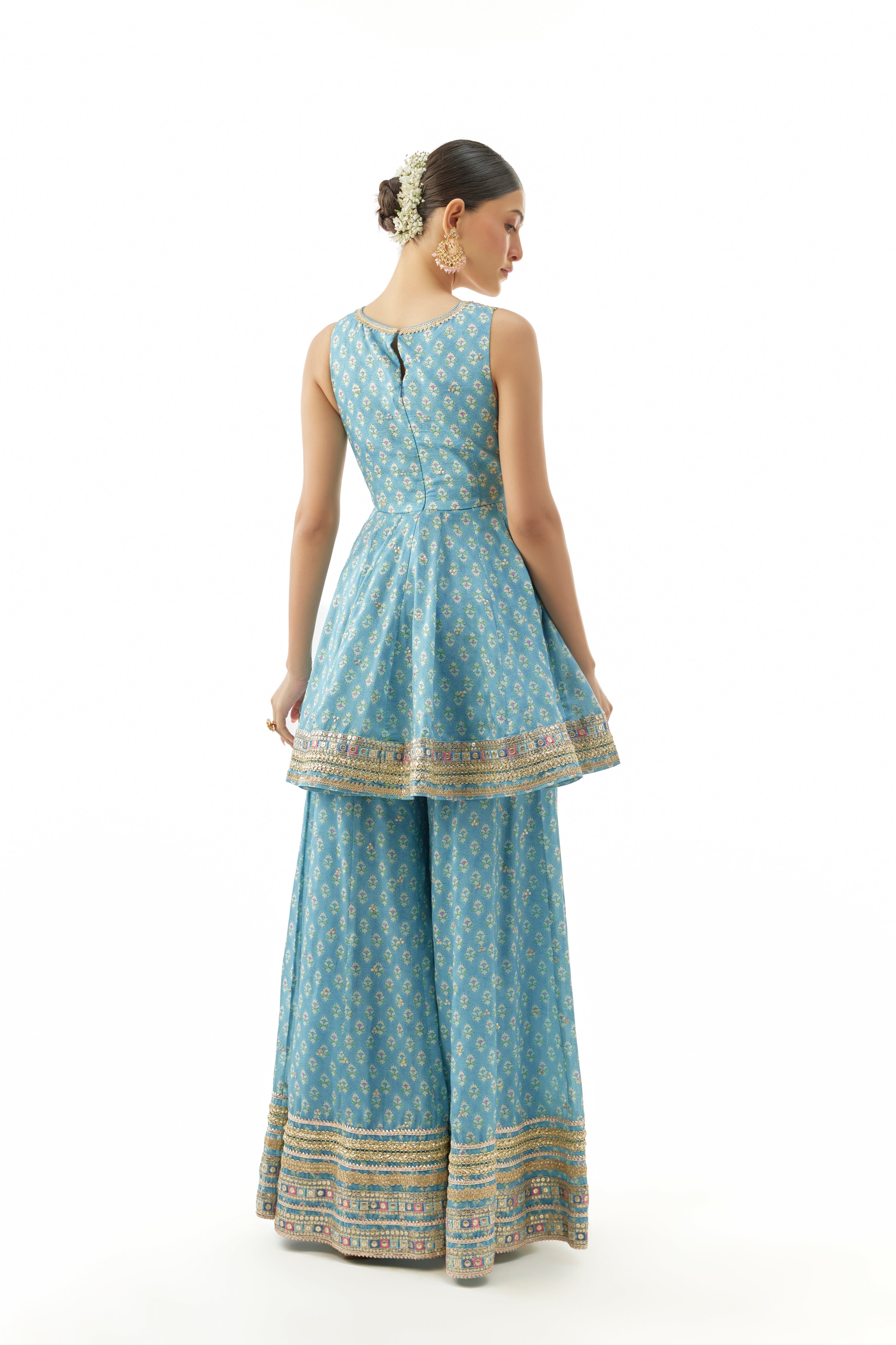 The Sleeveless Peplum Kurta Features A Deep V-Neckline, Adorned With Intricate Embroidery, Adding Shimmer And Sophistication. The Flare Of The Top Is Mirrored In The Wide-Legged Palazzo Pants, Which Boast Matching Prints And Richly Embroidered Borders And Completed With A Dupatta.