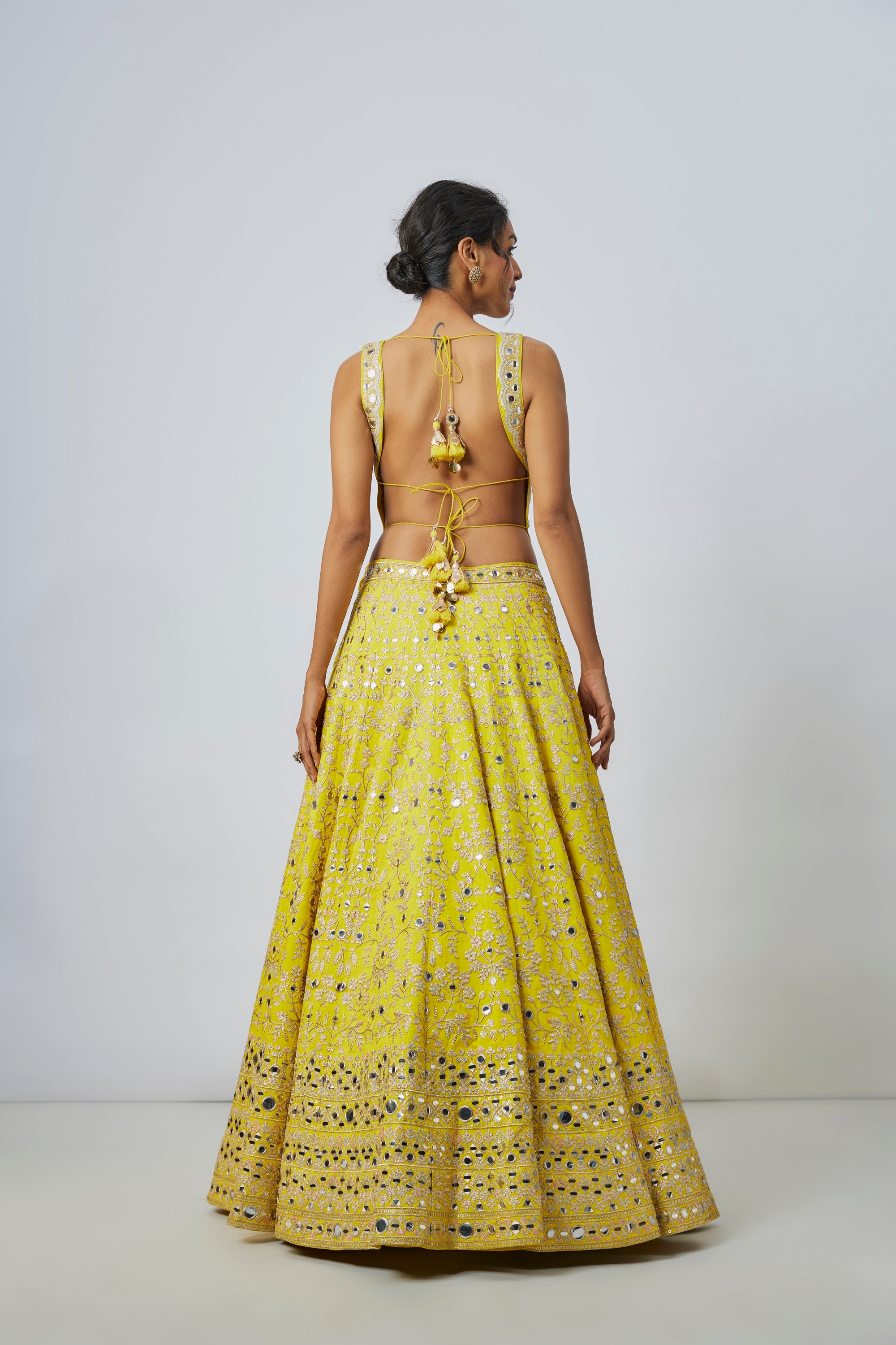 The Lehenga Features Intricate Mirror Work And Delicate Embroidery In Jamal Kali. Paired With A Contemporary Halter-Neck Blouse, This Look Seamlessly Combines Traditional Craftsmanship With A Modern Design. Accentuated With An Organza Dupatta Adorned With Matching Embellishments.