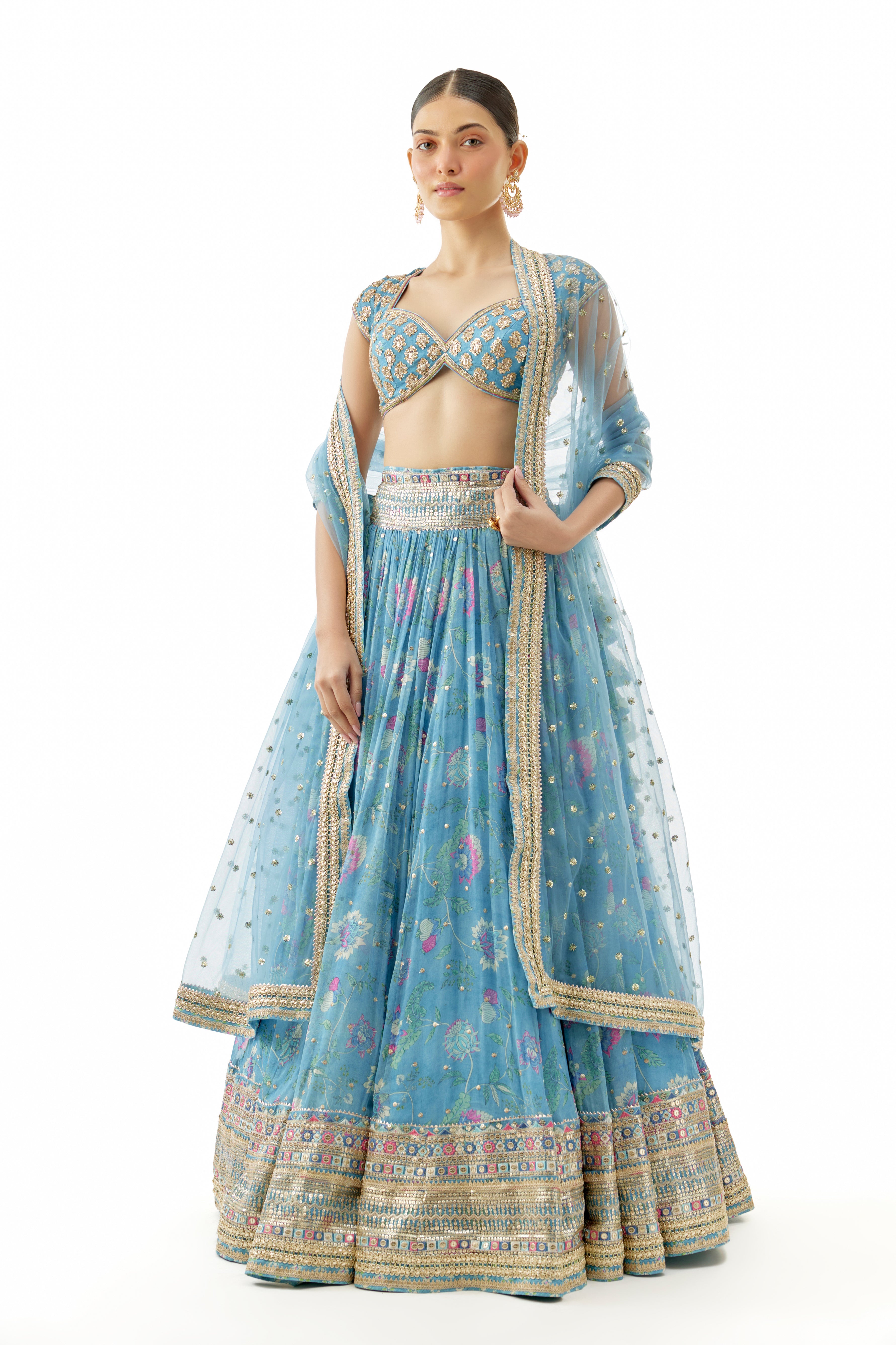 The Ensemble Features A Deep V-Neck Hand Blouse, Delicately Embroidered Offering A Bold Yet Elegant Silhouette. Tassels At The Hem Add A Playful Finish. The Flared Lehenga Skirt Is A Visual Delight, Adorned With Floral Motifs And Extensive Work At The Hem Creating A Dazzling Appeal. Completed With A Matching Dupatta, Subtly Dotted With Sequins And A Border To Complement The Embroidery.