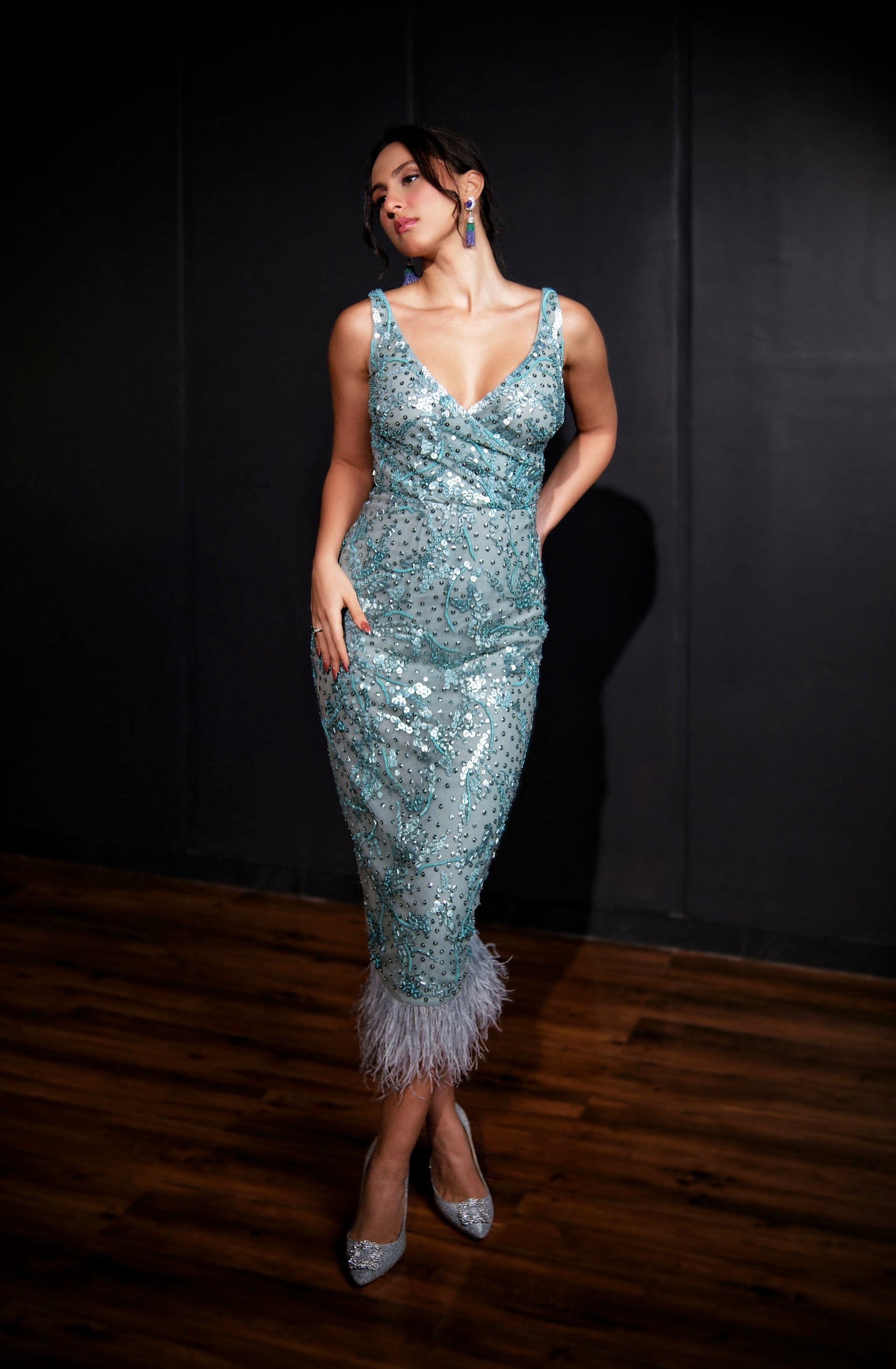 Blue midi feather embroidered gown