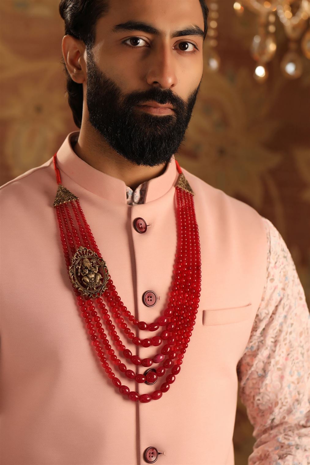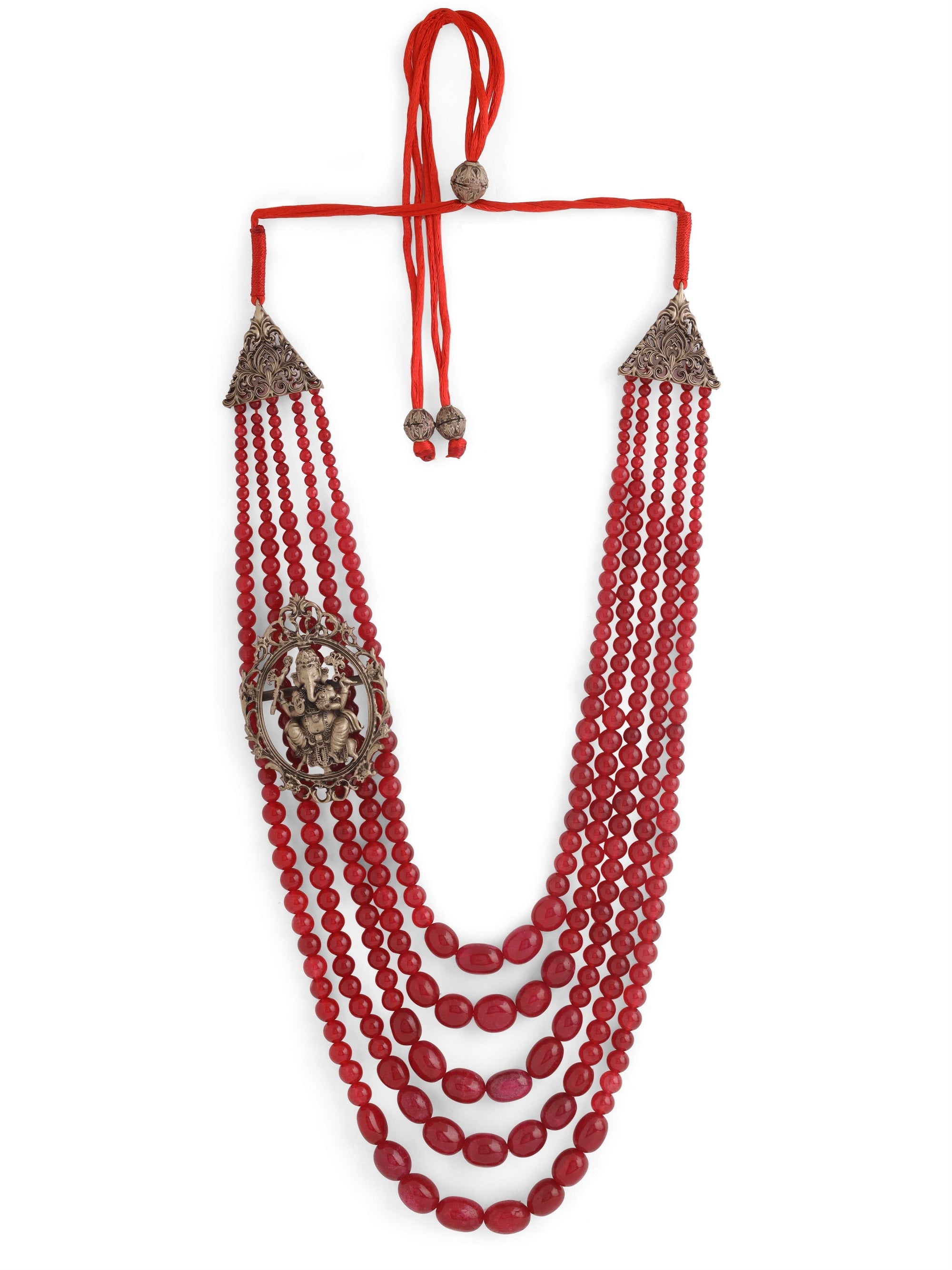 The Five Layered Ganesha Mala featuring five layers of high-quality beads in shades of brown and orange. The centerpiece of the design is a beautiful Ganesha pendant in antique gold finish, adding a touch of elegance to the design. The mala is finished with a handmade tassel that complements the color scheme.