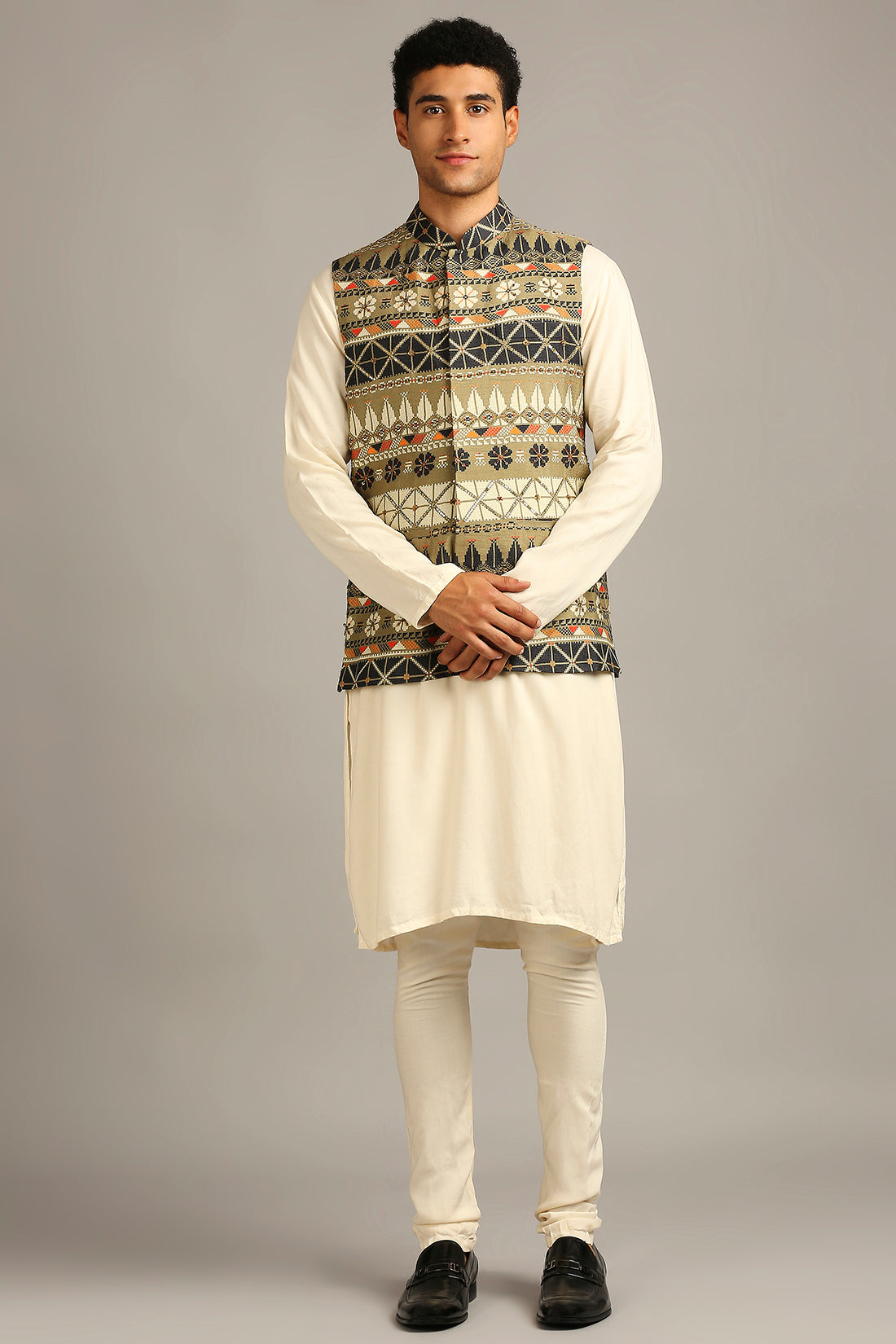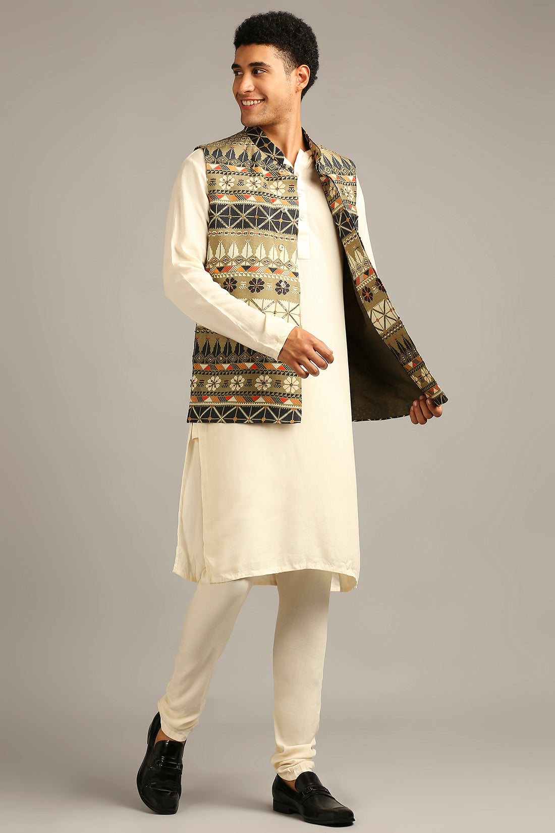 Elevate your ethnic wardrobe with the timeless elegance of this Tiraz Printed Bundi with Kurta Set — a perfect blend of royal flair and contemporary sophistication. Inspired by the intricate art of Tiraz—a historic decorative textile tradition once favored in royal courts—this ensemble showcases detailed motifs and ornamental prints that exude cultural richness.