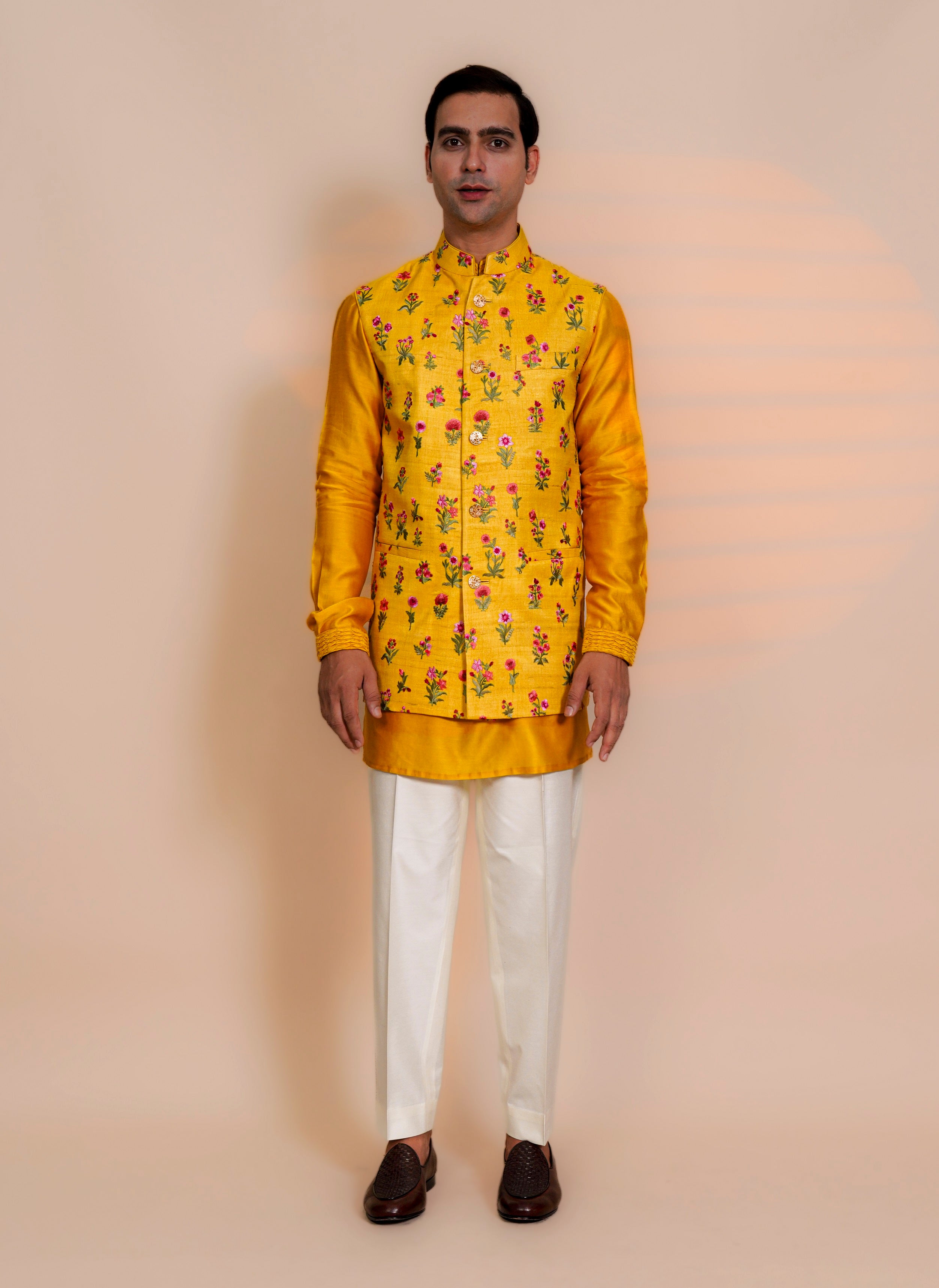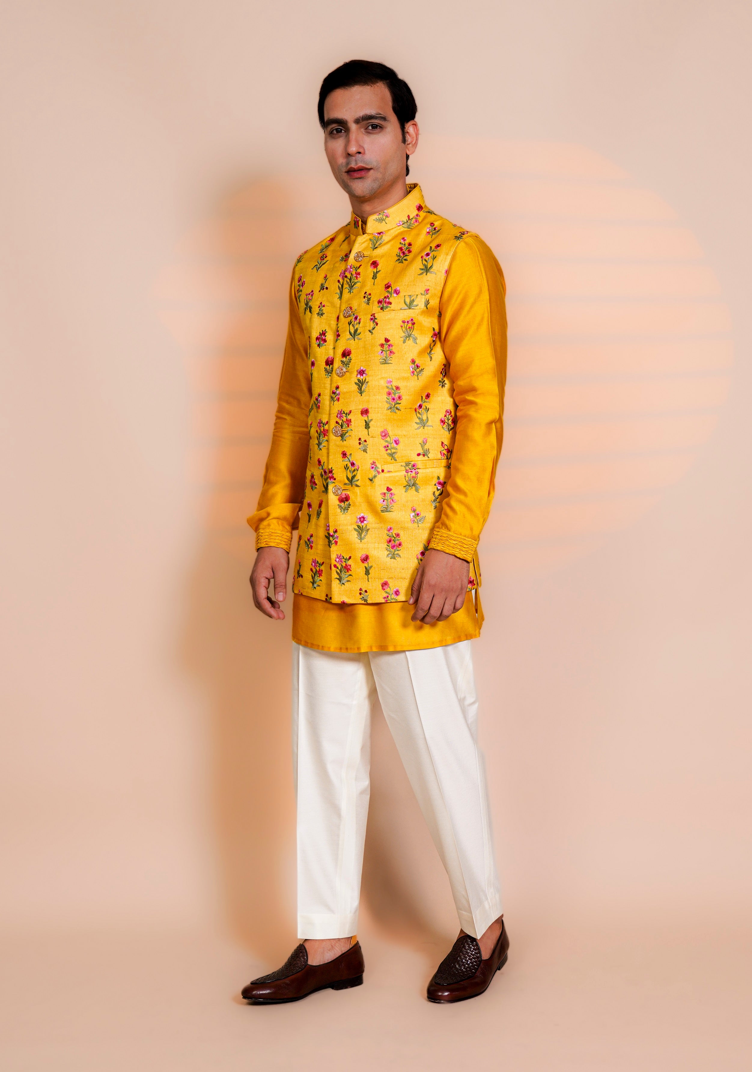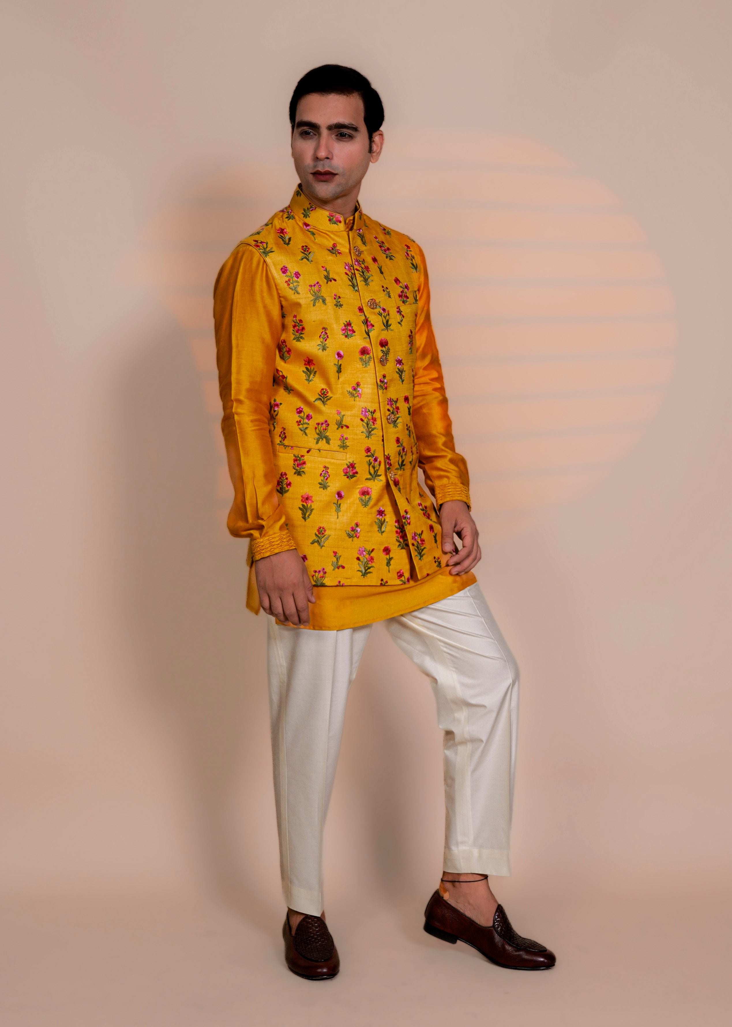 | Featuring the Musturd colour nehru jacket along with kurta with thread embroided paired with kurta and Pajama |