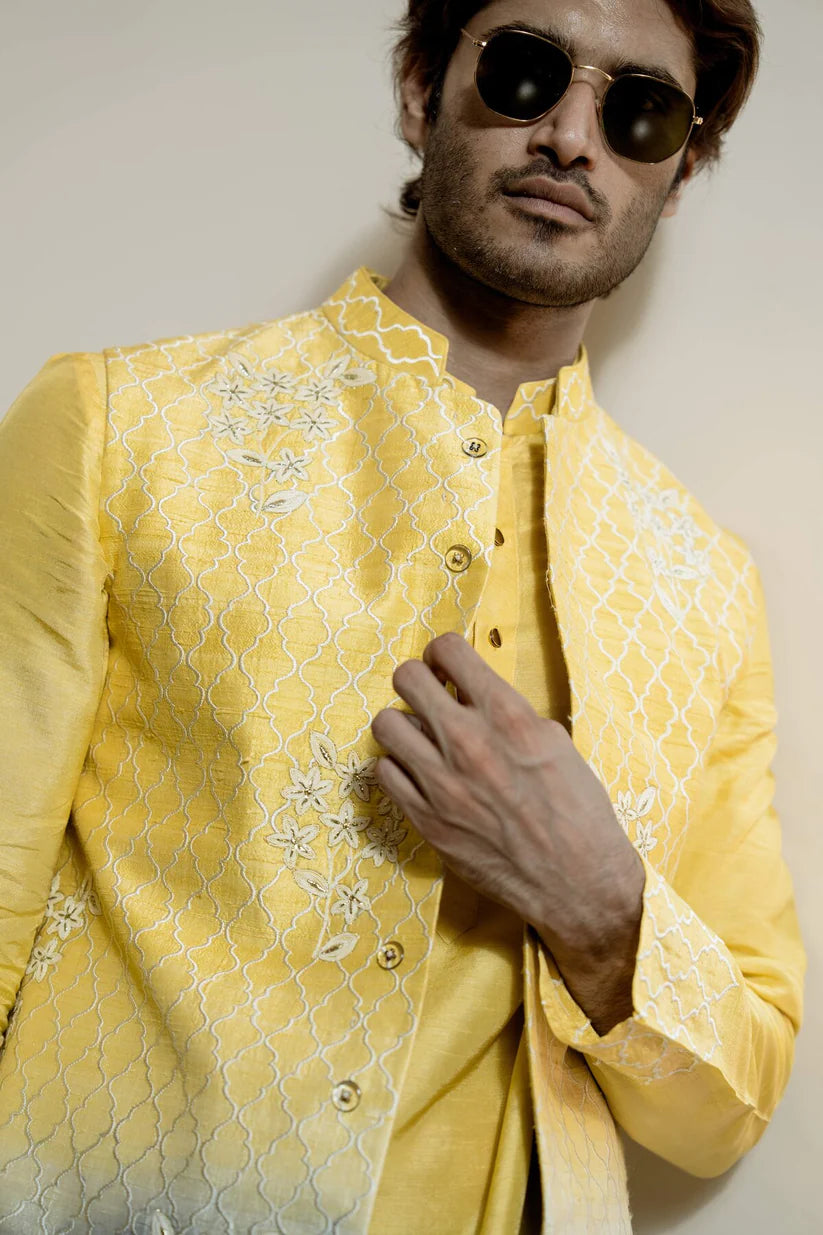 Crafted with care, the kurta features a vibrant yellow silk fabric that adds a touch of luxury to your attire. The silk material drapes beautifully, giving you a flattering silhouette and a regal look. The fabric's natural sheen adds a touch of sophistication, making it perfect for special occasions
