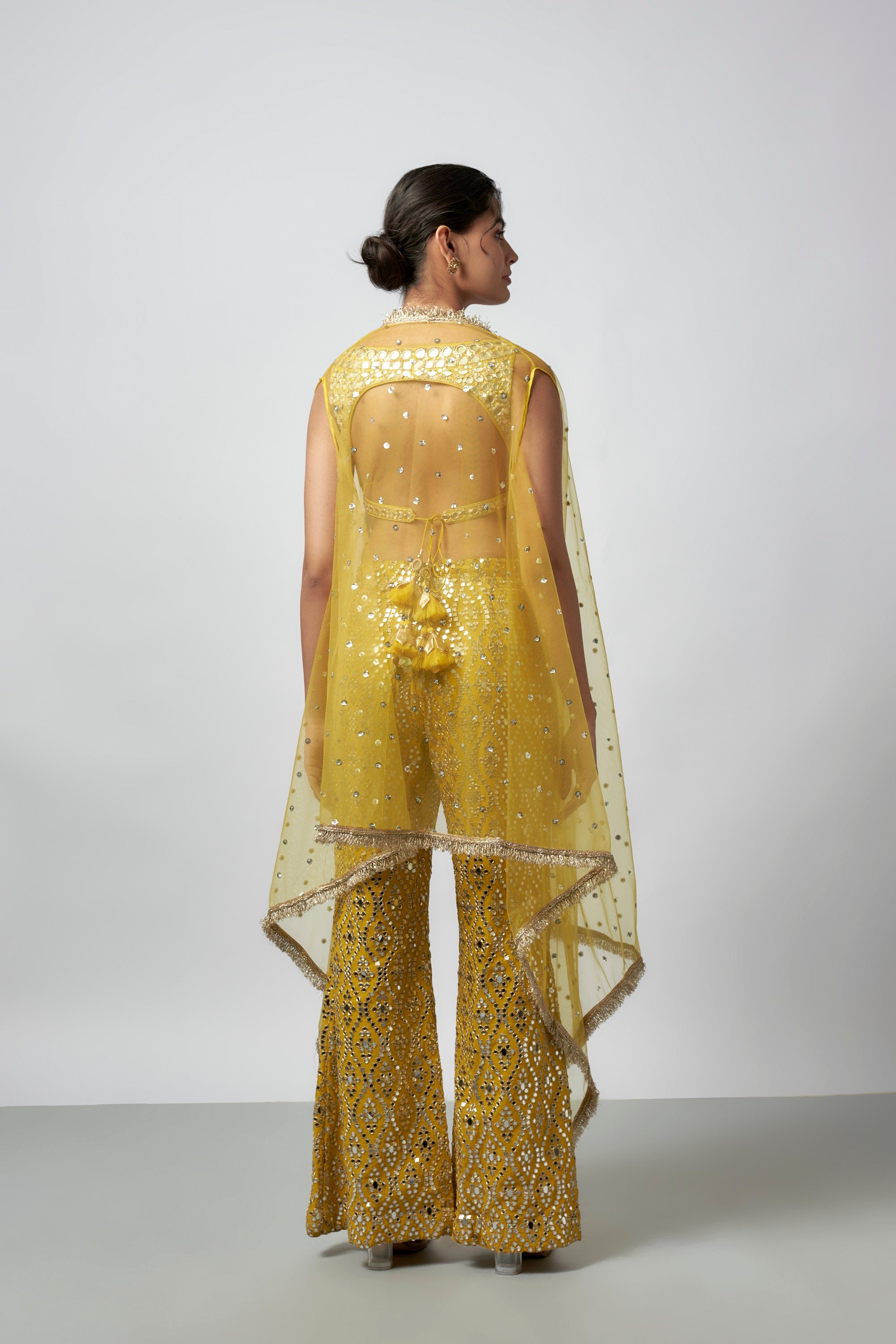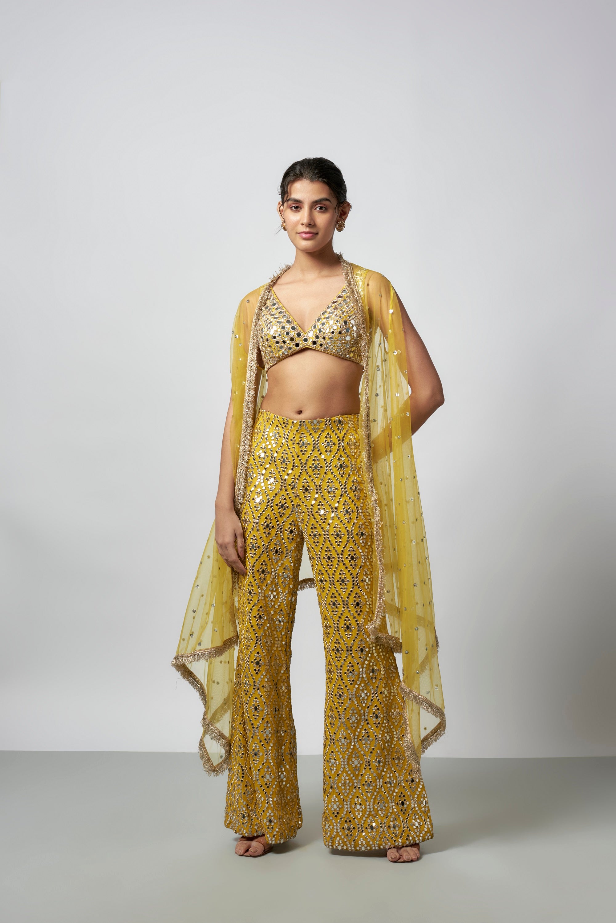 This Outfit Is Fully Embellished With Hand And Mirror-Work Bralette That Radiates Confidence And Charm, Paired With Intricately Katri Mirror Embroidered High-Waist Flared Trousers. Completed With Net Cape Adorned With Mirror Details And A Delicately Embroidered Border.