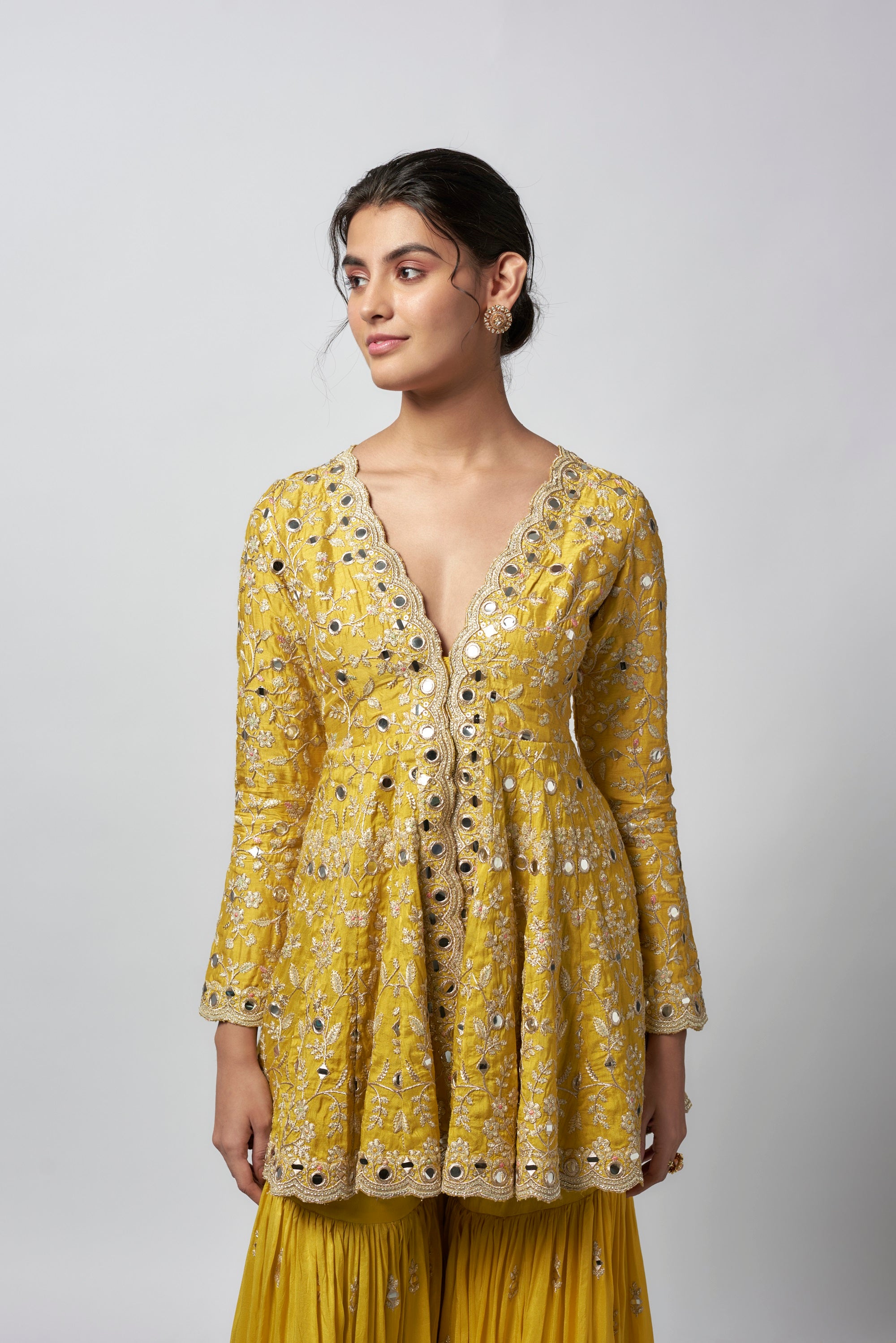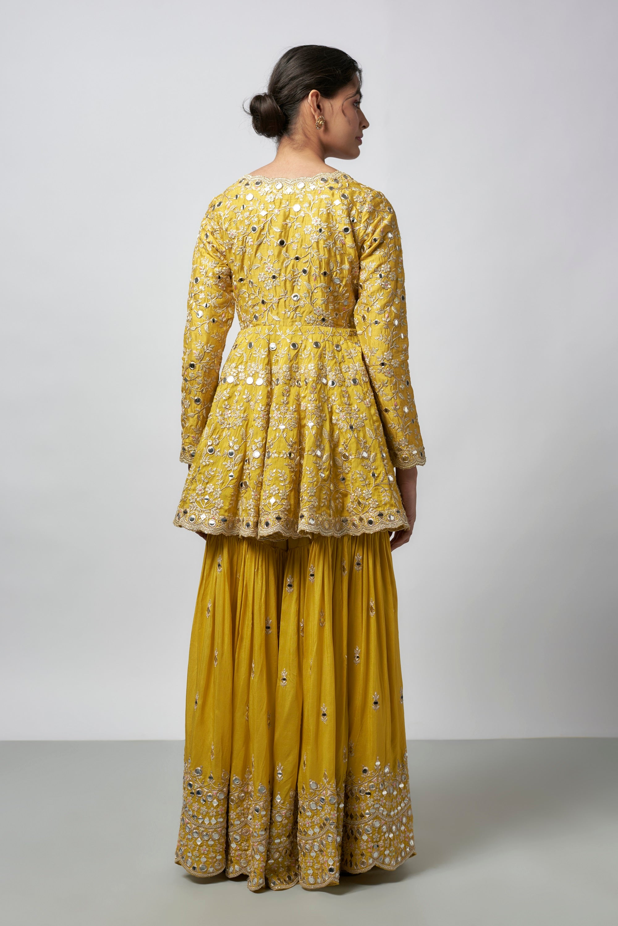 The Outfit Features A Peplum-Style Top With A Flattering V-Neckline, Adorned With Intricate Mirror Work And Floral Embroidery. Paired With Sharara Pants, Intricately Embellished Along The Hemline And Scattered With Mirror And Threadwork Motifs, The Set Exudes Sophistication.