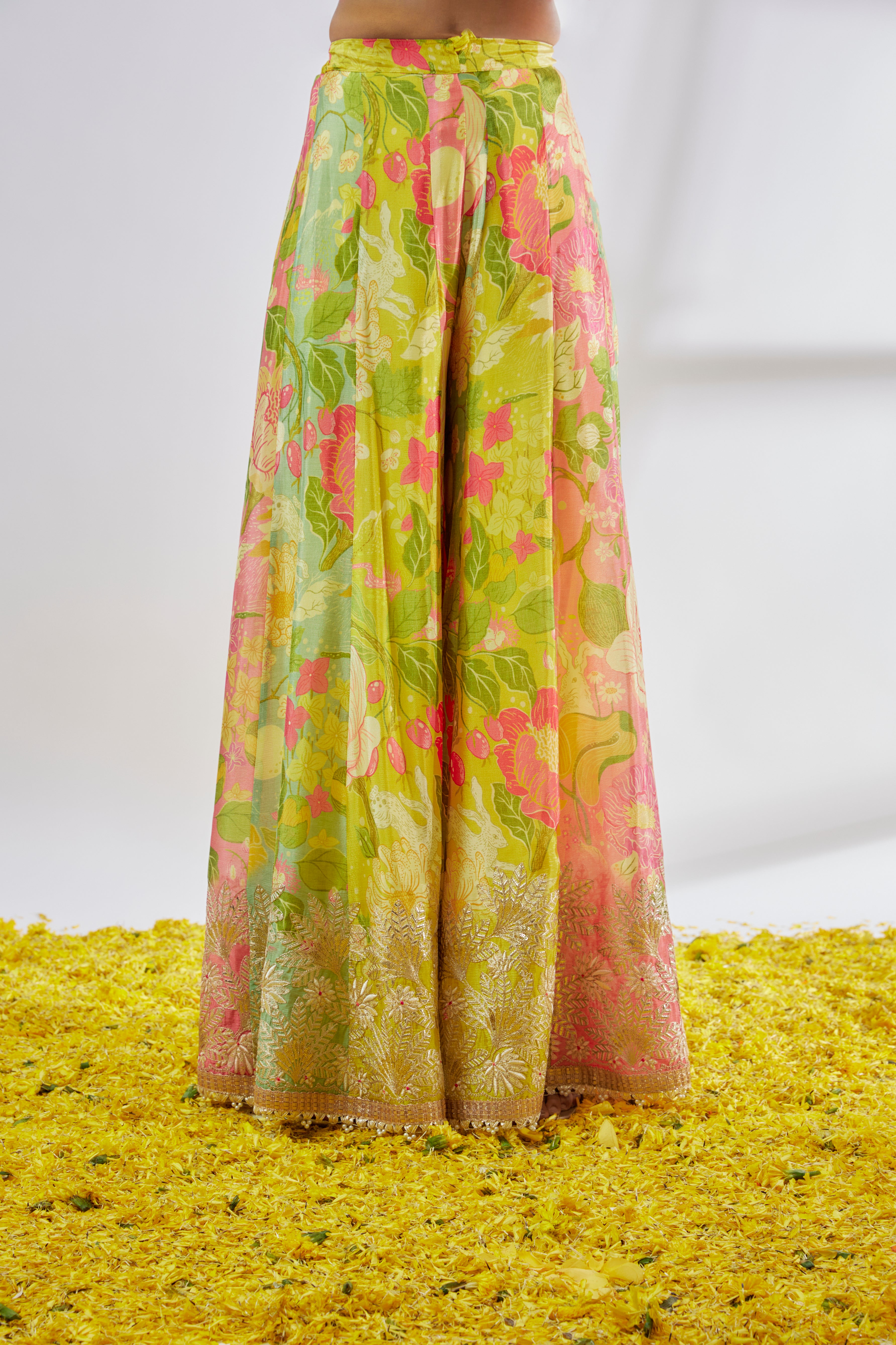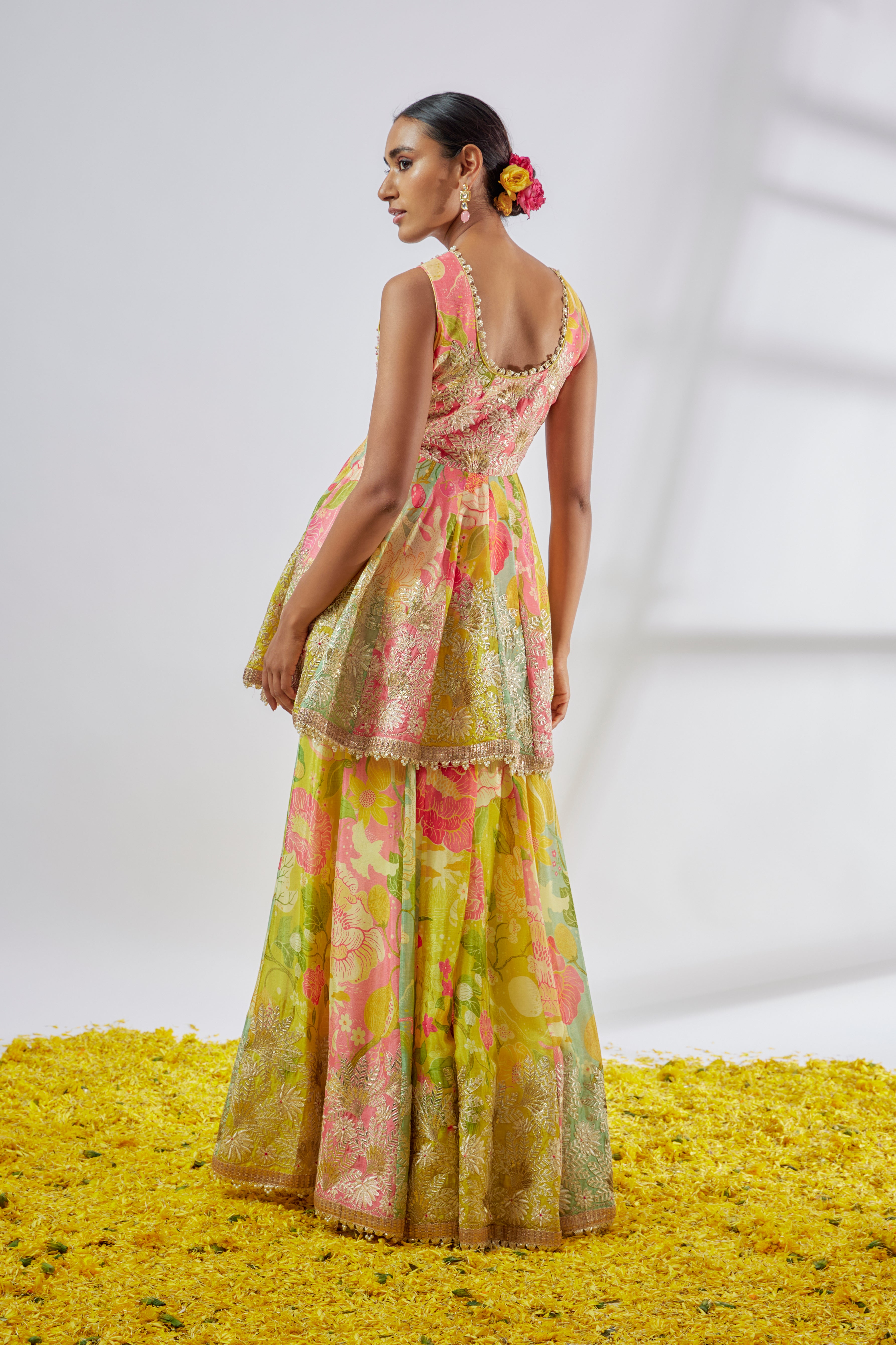 | Make a statement in our embroidered multicolor sleeveless peplum top paired with flared sharara pants. This ensemble blends vibrant embroidery with modern silhouettes, offering a perfect balance of sophistication and flair for any festive event. |