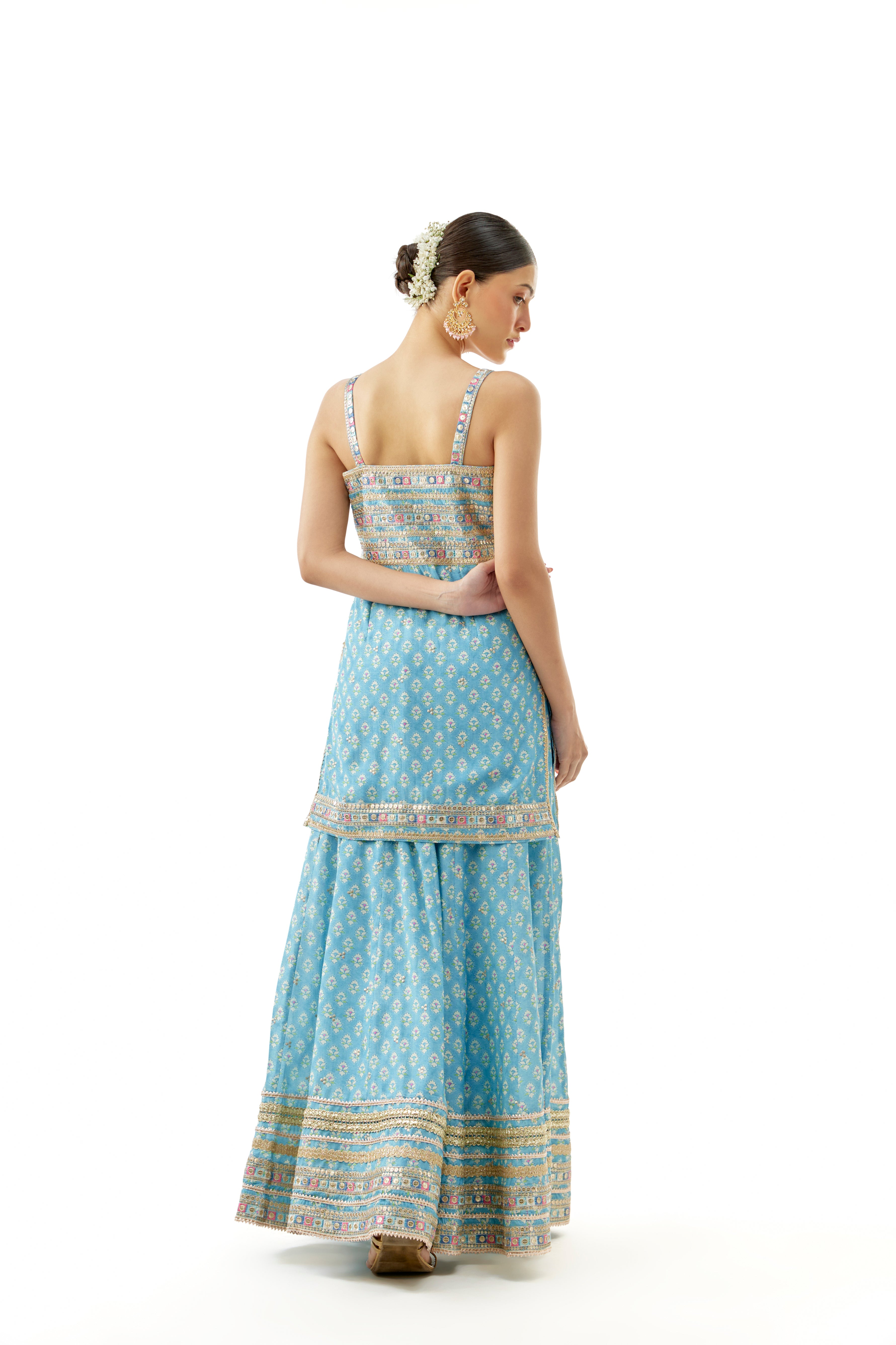 The ensemble features a beautifully crafted sleeveless kurti adorned with intricate embroidery lending a regal touch to the outfit. The matching sharara pants are gracefully flared and detailed with complementary embroidery at the hem, creating a balanced and eye-catching silhouette. Paired with a delicate dupatta embellished with motifs and a detailed border.