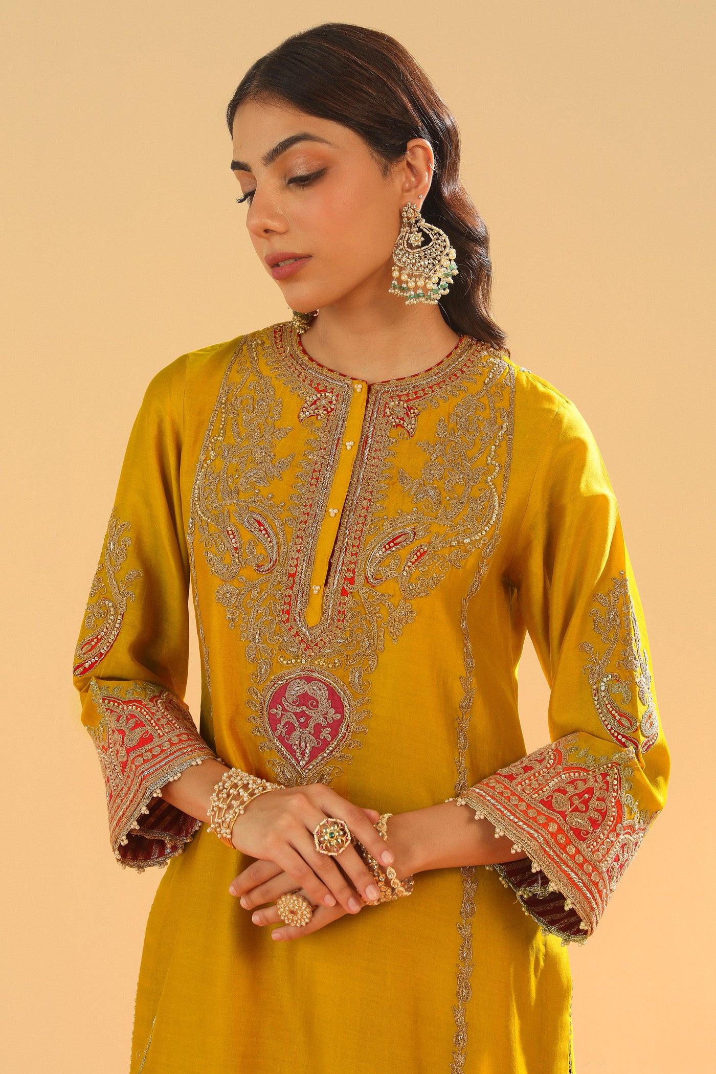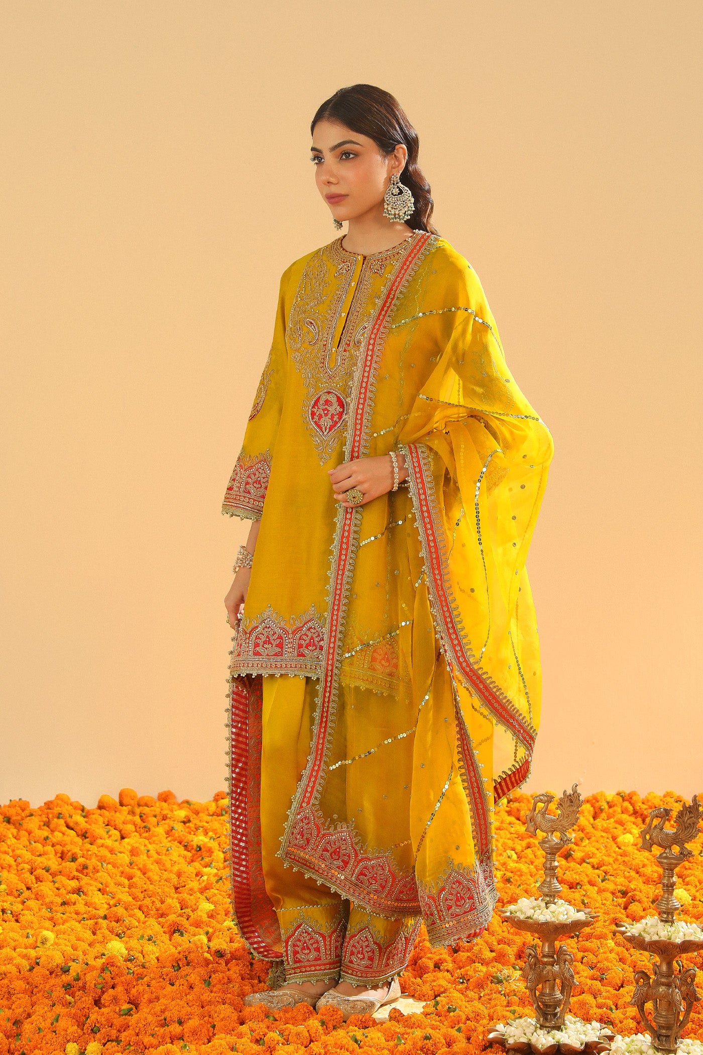 This Ensemble Is Made In Pure Silk Chanderi Fabric Teamed Up With A Dogri Salwar And A Silk Organza Dupatta. The Outfit Is Having A Zero Neck With Placket And Straight Sleeves. The Outfit Is Adorned With Exquisite Kirandori With Sitara And Dabka Zardozi. The Outfit Is Finished With A Contrast Banarsi And Kinnari.