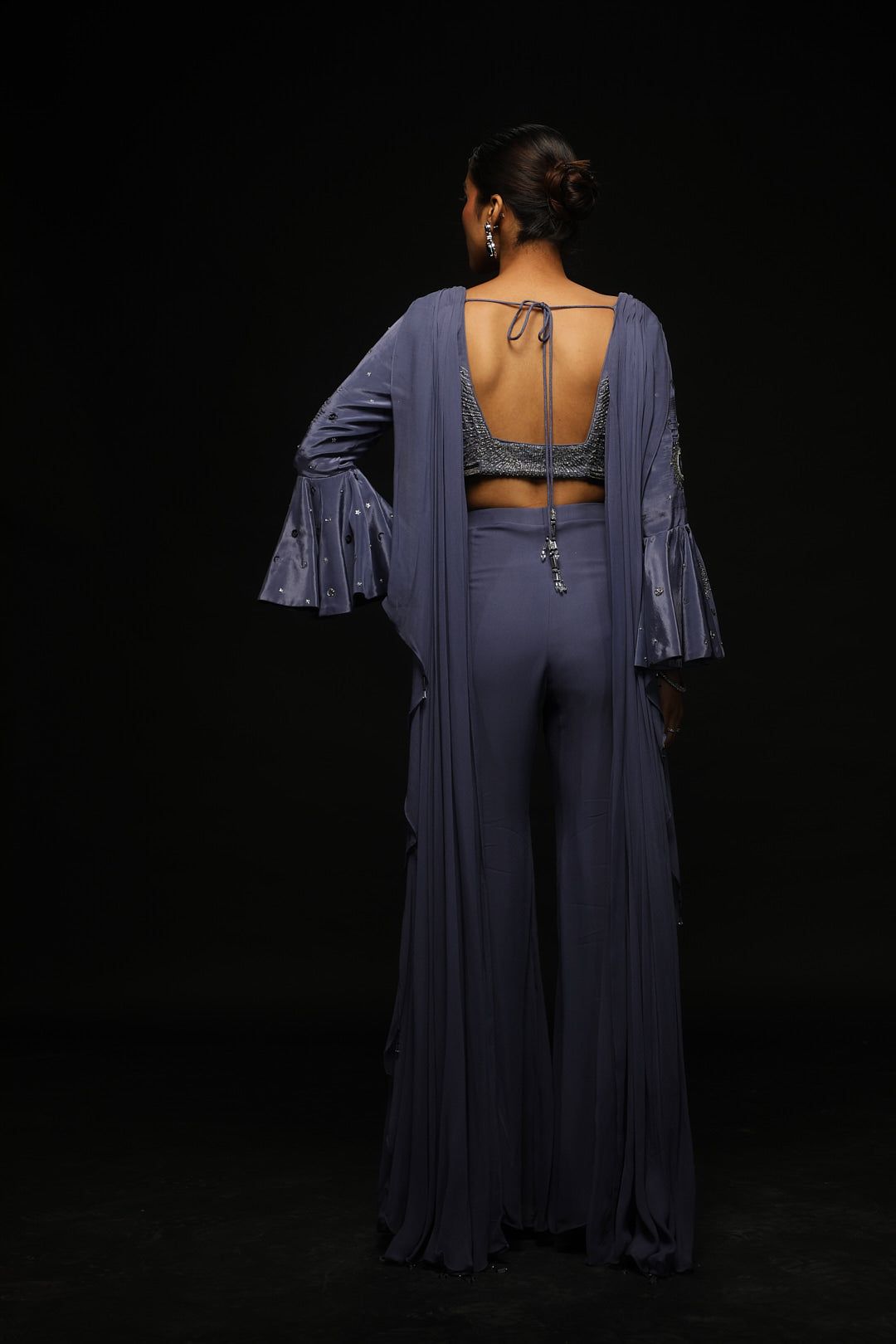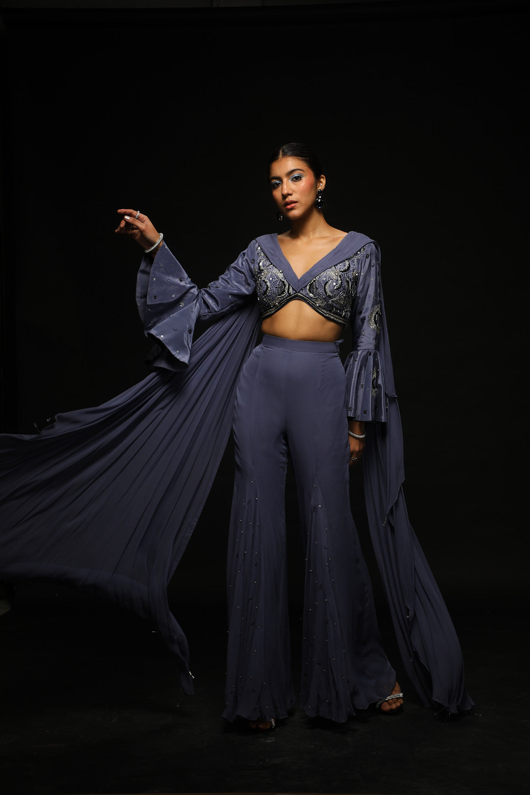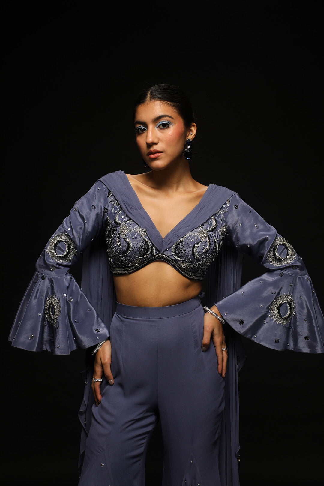 | Aurora is an ensemble sure to steel the show as the outfit has motifs from the galaxy. It is a two piece outfit with a drape attached from the neckline paired with a tiny blouse.. There is a kalidaar sharara with small additional kalis highlighted with celestial motifs. |
