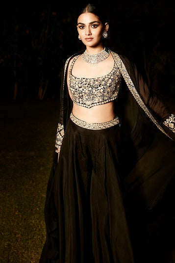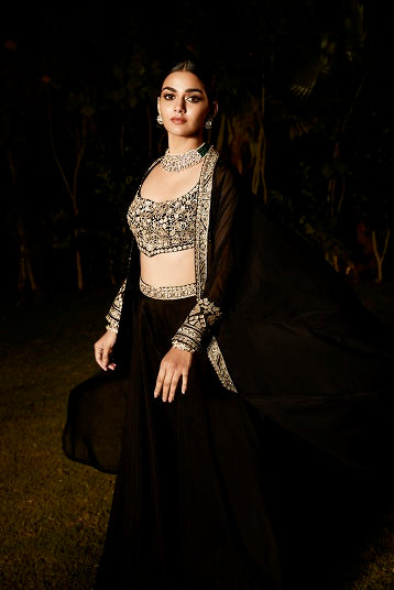 | The NEW Look An evolution of Matsya. Tarnished Silver Embroidery in Vintage Zardozi. Aztec & Flora inspired artworks. The Old & The New, in just an all new Matsya look. A winged closed cuff cape created in Plant based organza georgette with a flowy sharara pant carrying the Matsya belt. The blouse is in a signature Matsya Roman V down shape. |