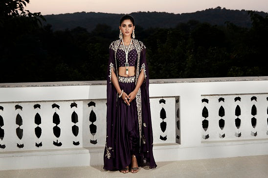| Handcrafted with pittan, kasab ari & zardosi the Royal matsya cape is the epitome of Vintage Modernity. Created with Plant based soft georgette organza the design features incuts over the elbows & intricate embroidery all over. The artwork is heritage inspired with signature matsya detailing in tarnished silver. The bottom is a draped skirt, easy to wear. |