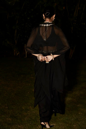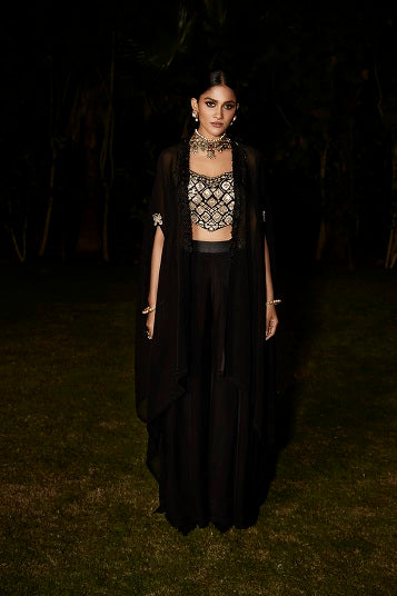 | The NEW Look An evolution of Matsya. Tarnished Silver Embroidery in Vintage Zardozi. Aztec & Flora inspired artworks. The Old & The New, in just an all new Matsya look. Blouse in silk & cape in a plant based organza georgette. The aztec influence almost speaks to an inspiration of technology & evolved urban embroideries. The sharara pants carry the matsya side belt. |