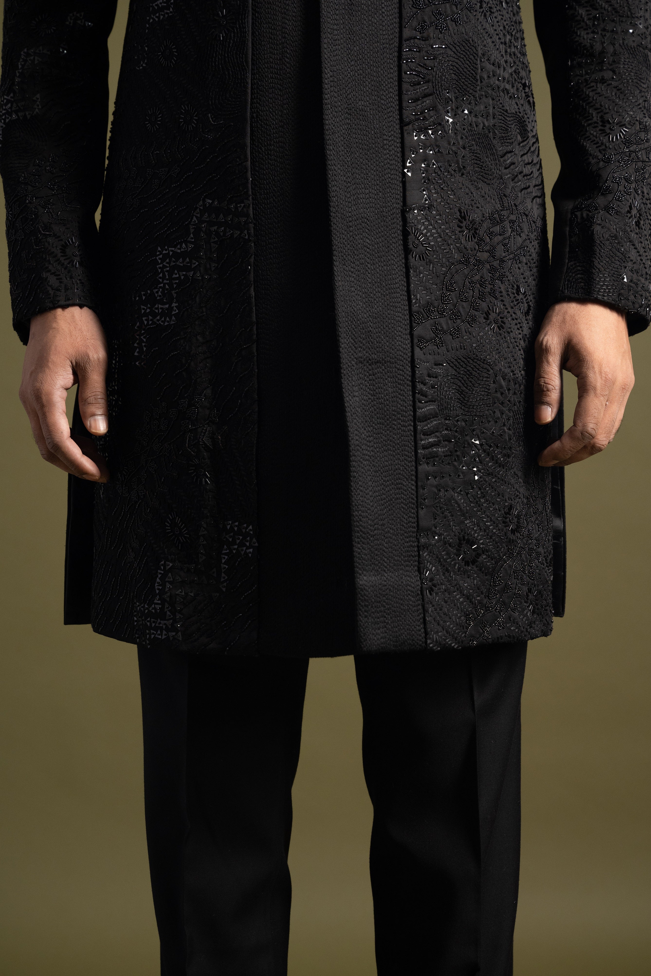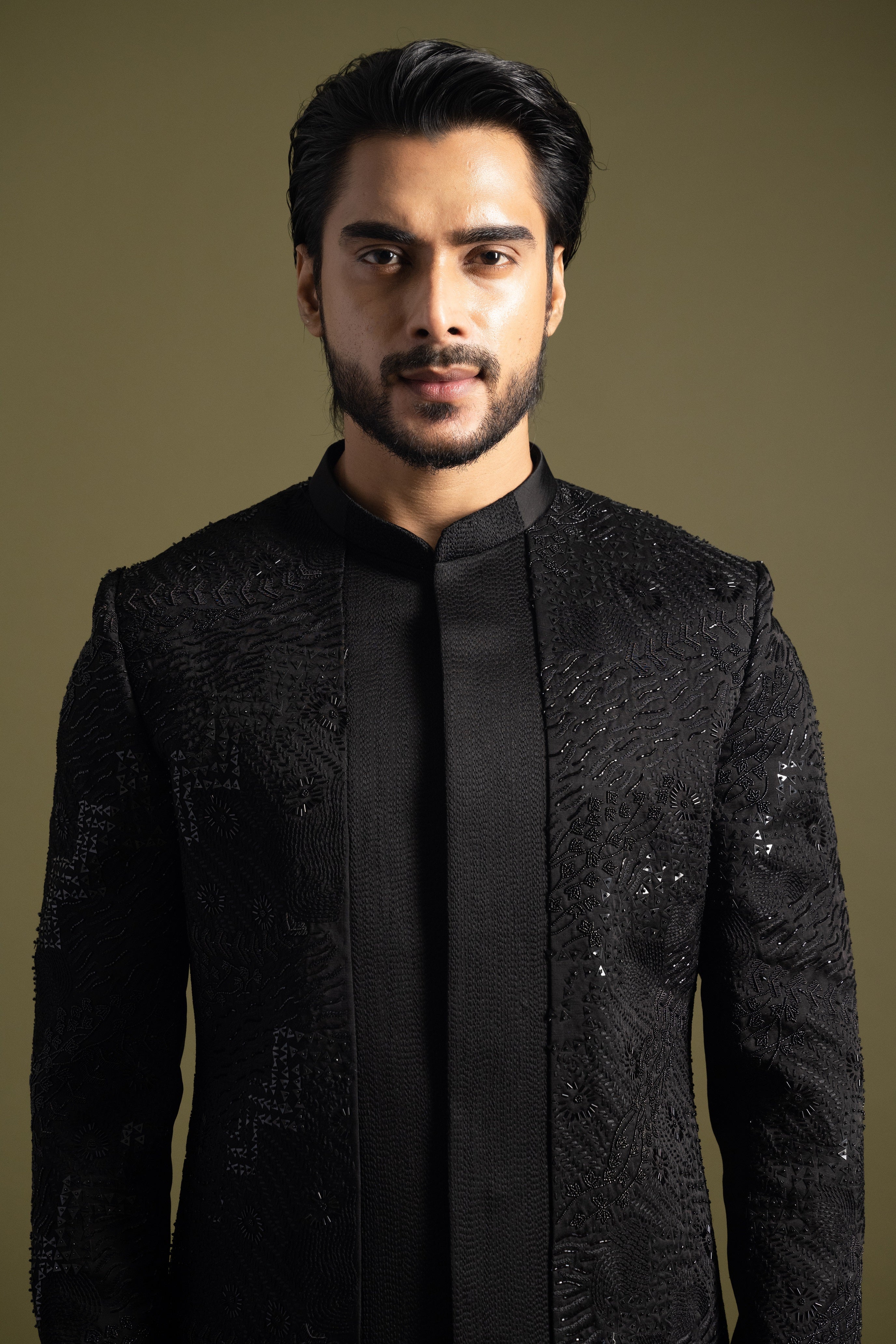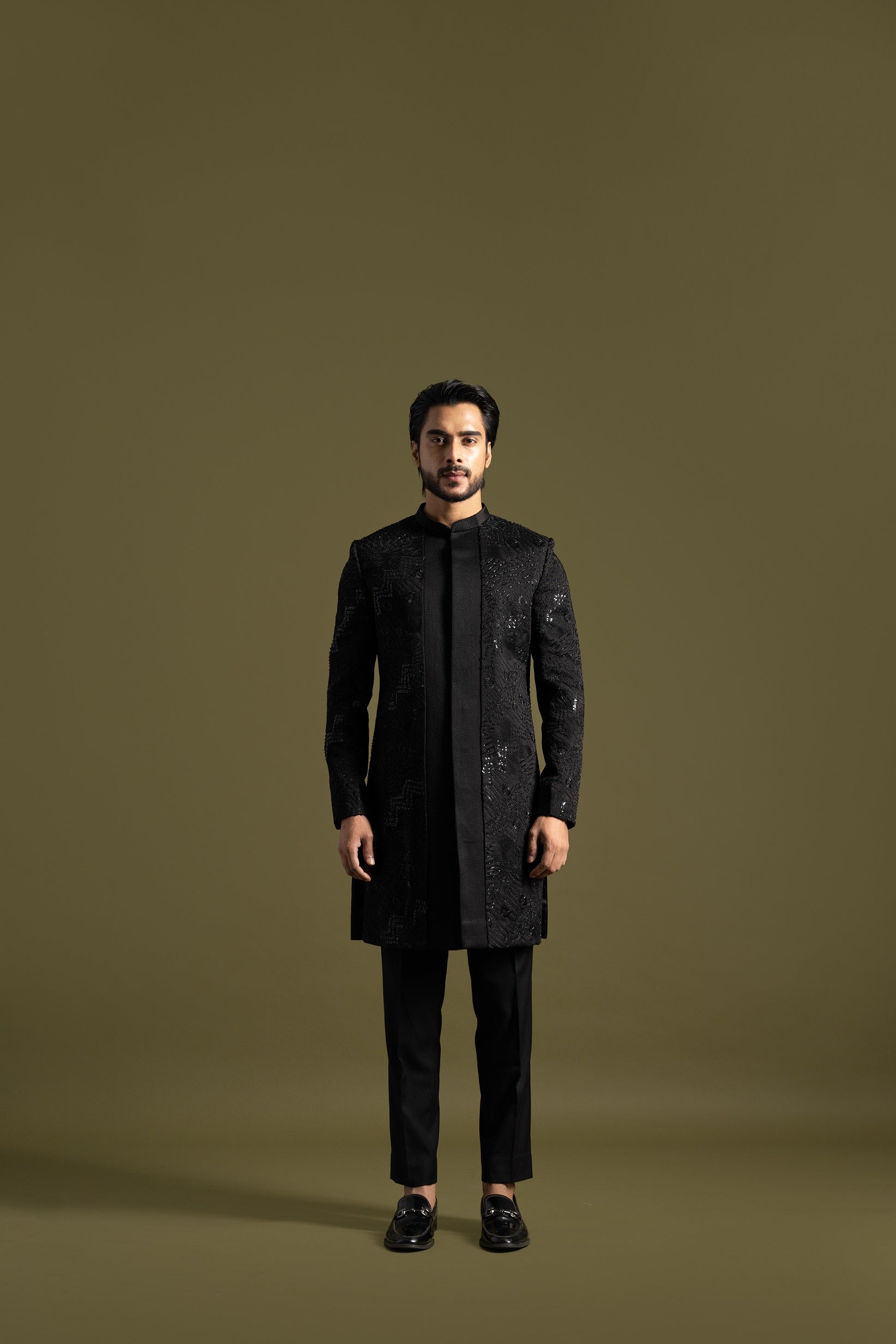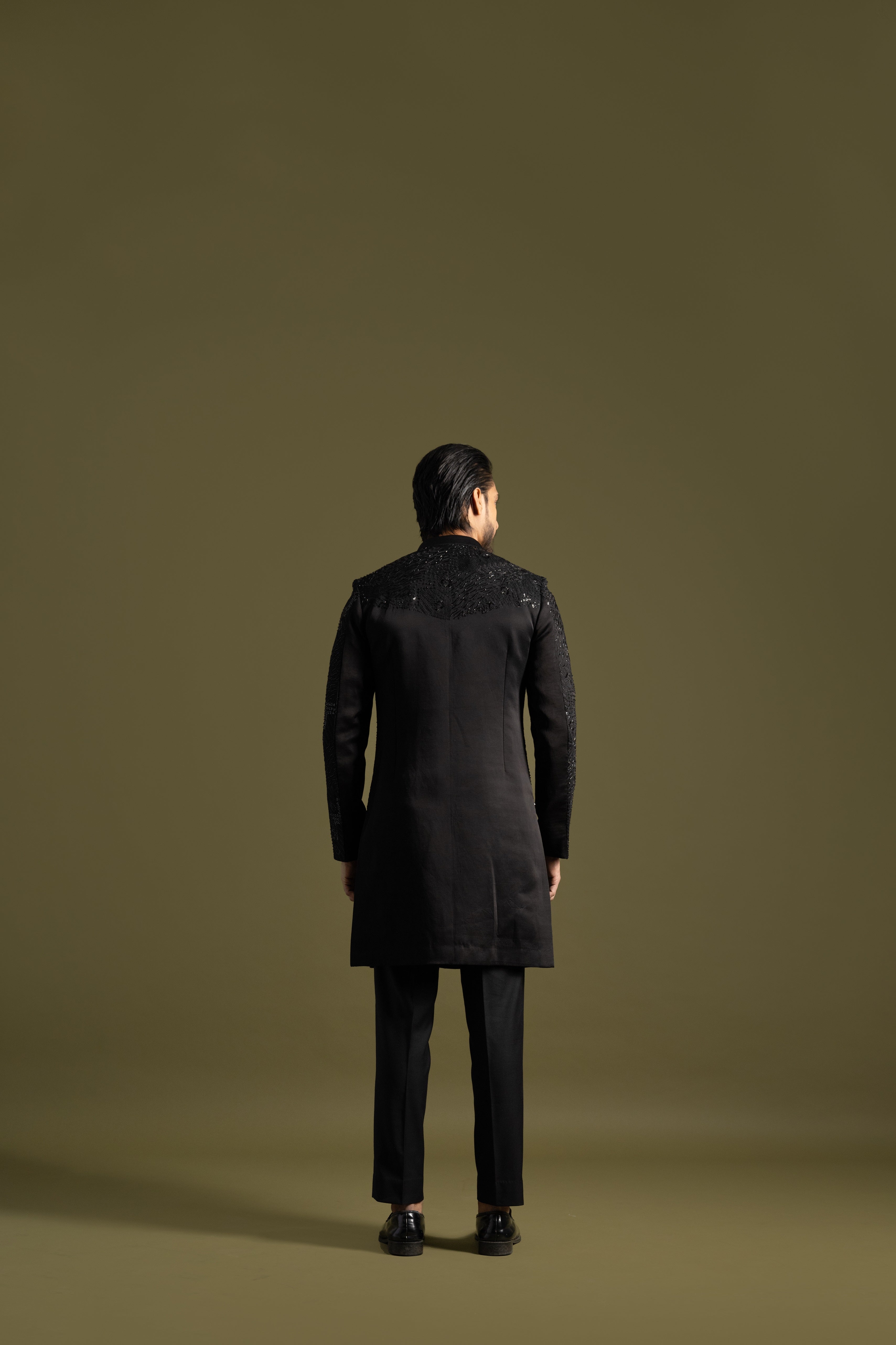 | BLACK DOUBLE PANEL LINEN SATIN ACHKAN WITH STITCH LINE DETAIL ON THE CENTRE PANEL AND THREAD WORK EMBROIDERY WITH CHIR , SEQUENCE ALLOVER . PAIRED WITH SLIM FIT TROUSER |
