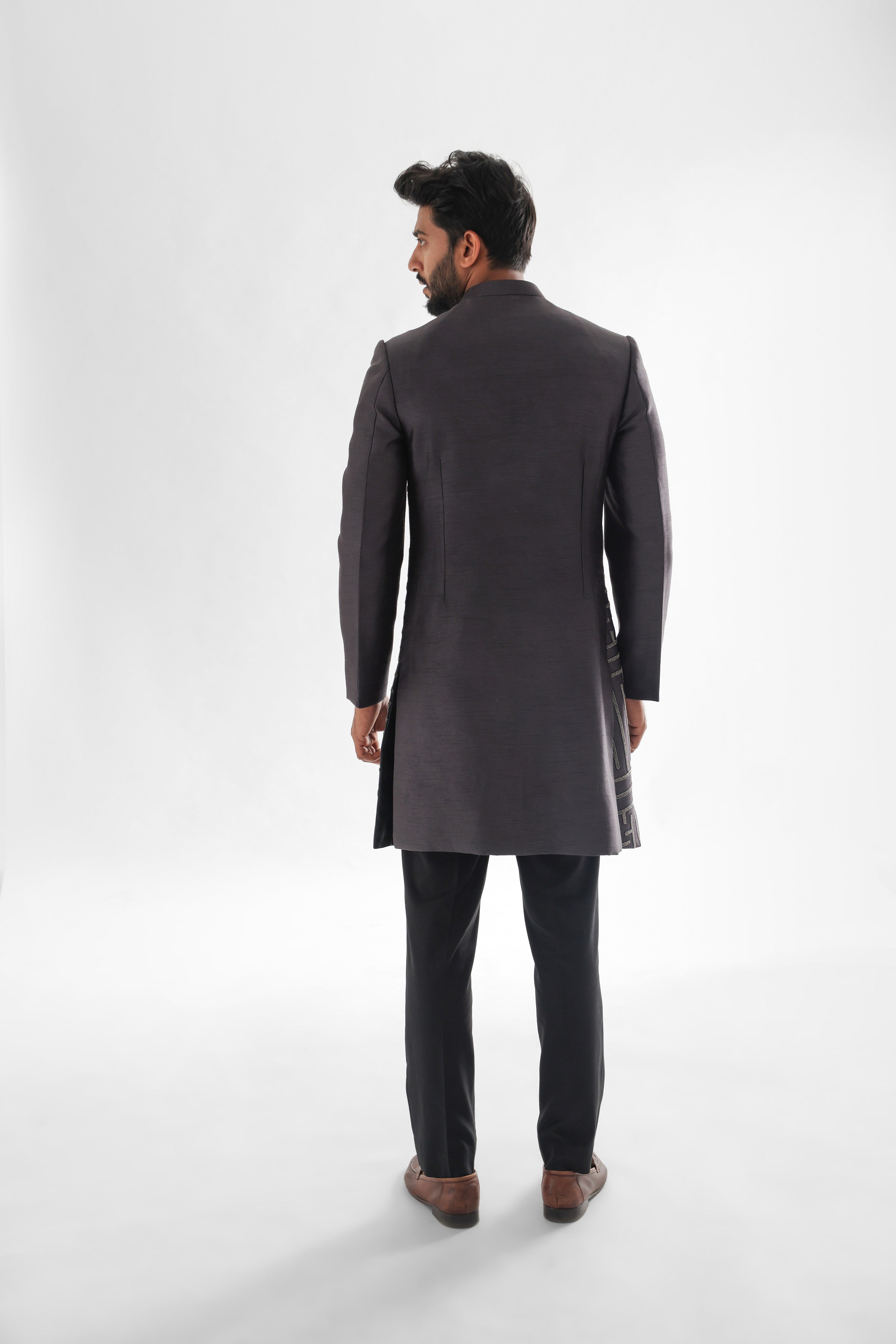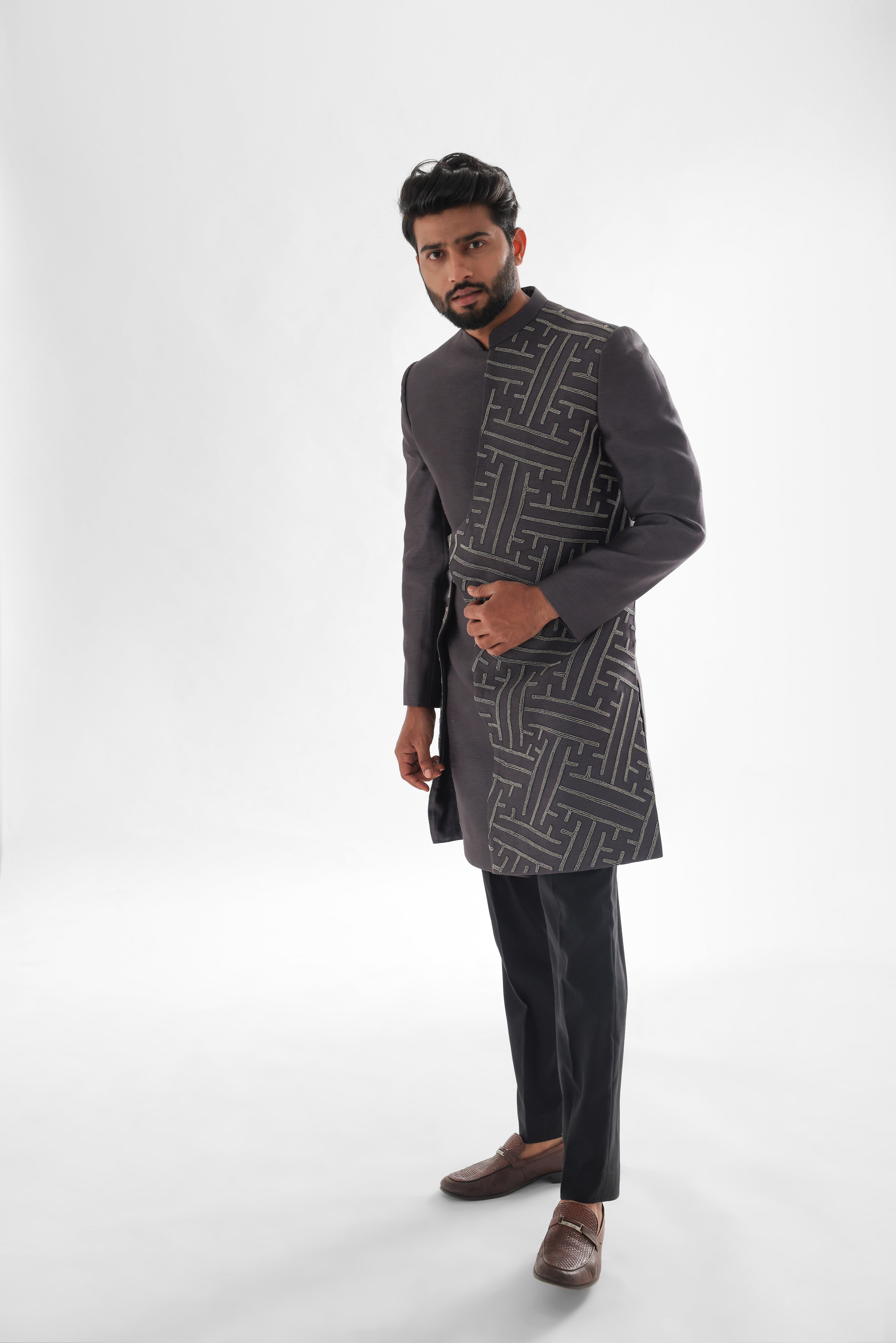 | VOLCANIC GLASS COLORED ACHKAN HIGHLIGHTED WITH GREY CHIR EMB PAIRED WITH BLACK TROUSERS |