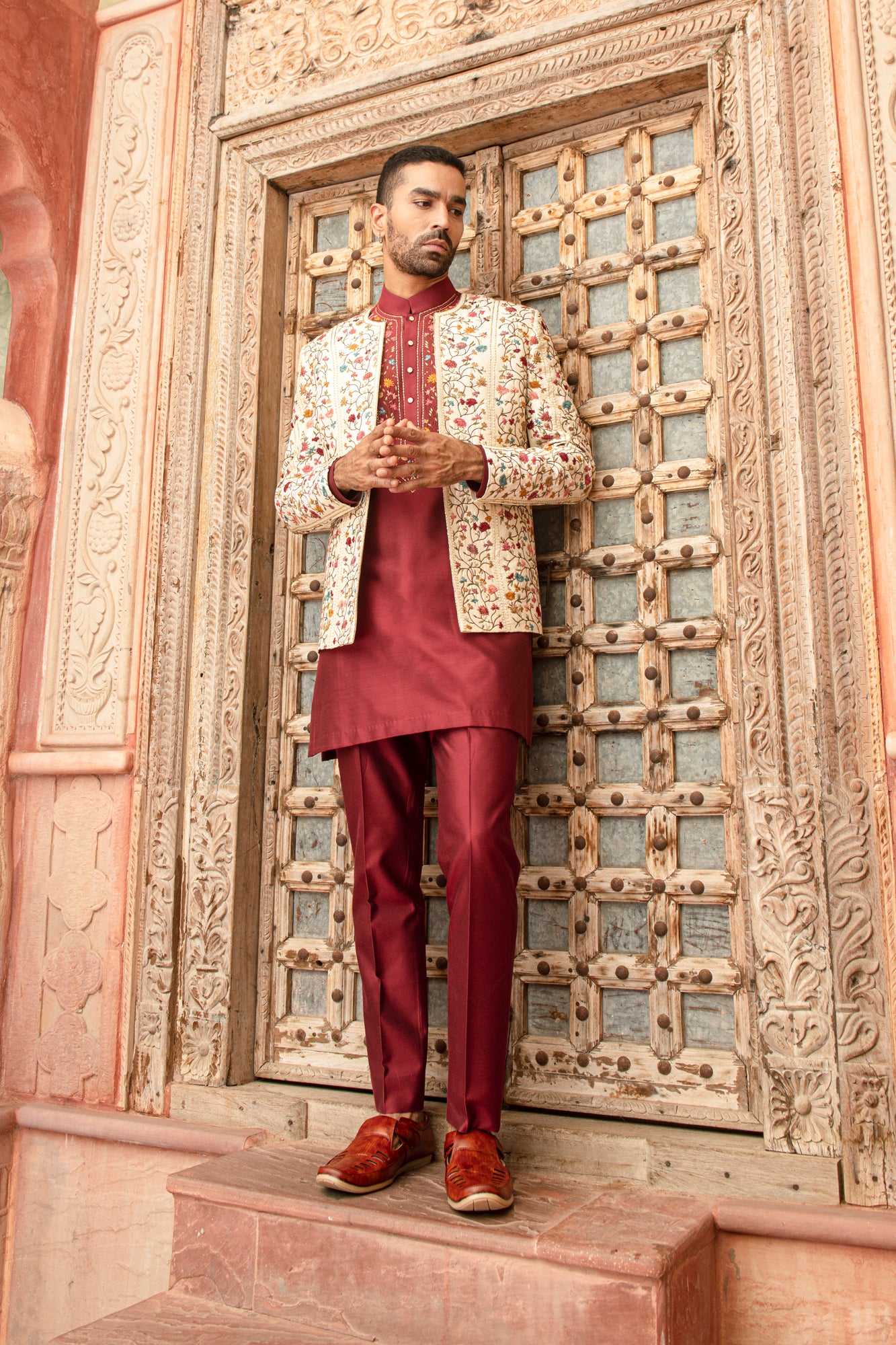 Featuring a cream indowestern in silk dupion blend base with floral embroidery. It is paired with a kurta and trousers. Accessorize this set with a pair of loafers for festive occasions.