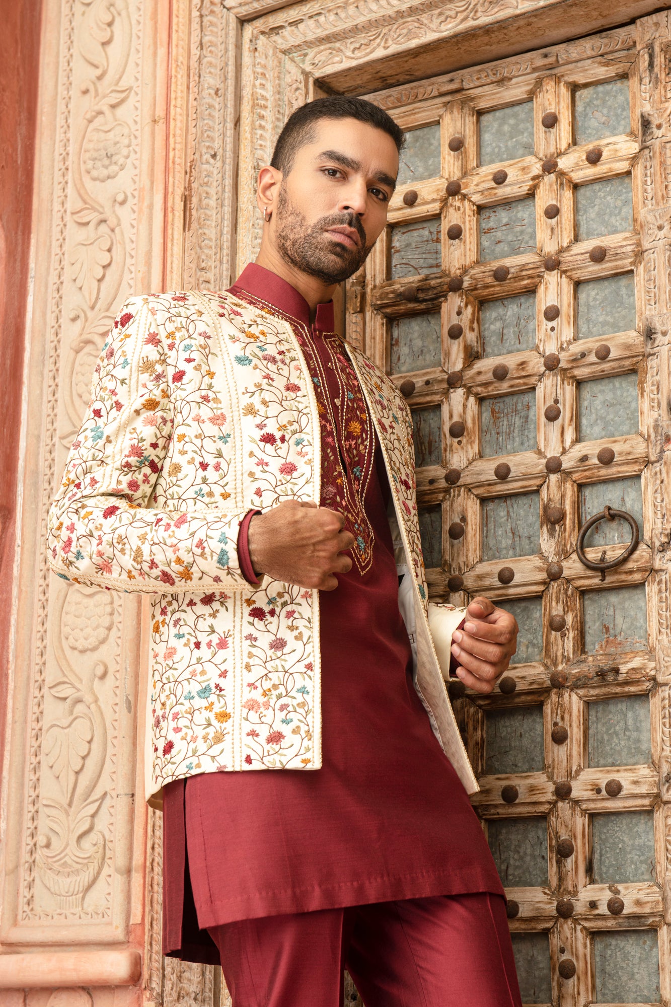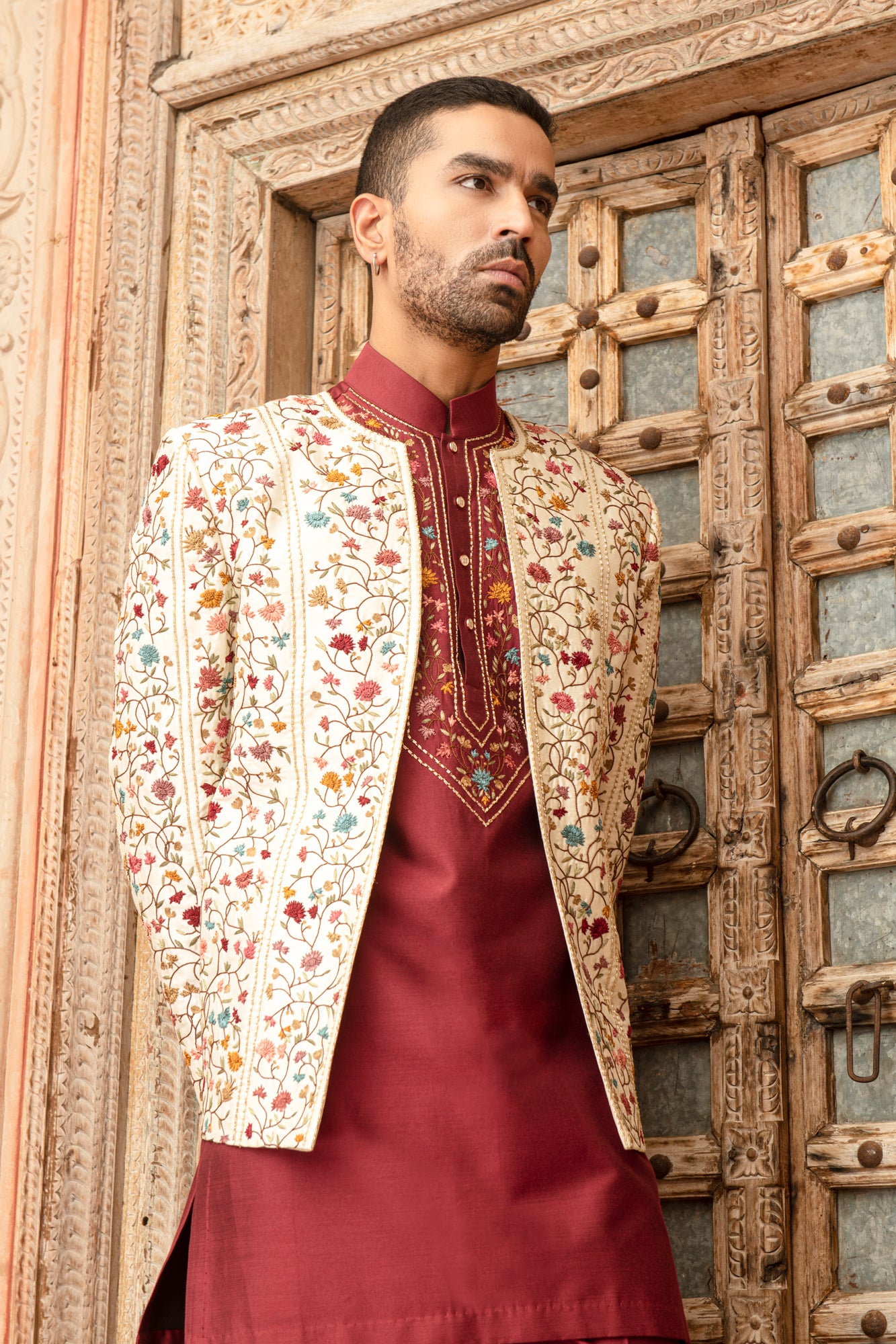 Cream silk dupion blend floral embroidered indowestern set