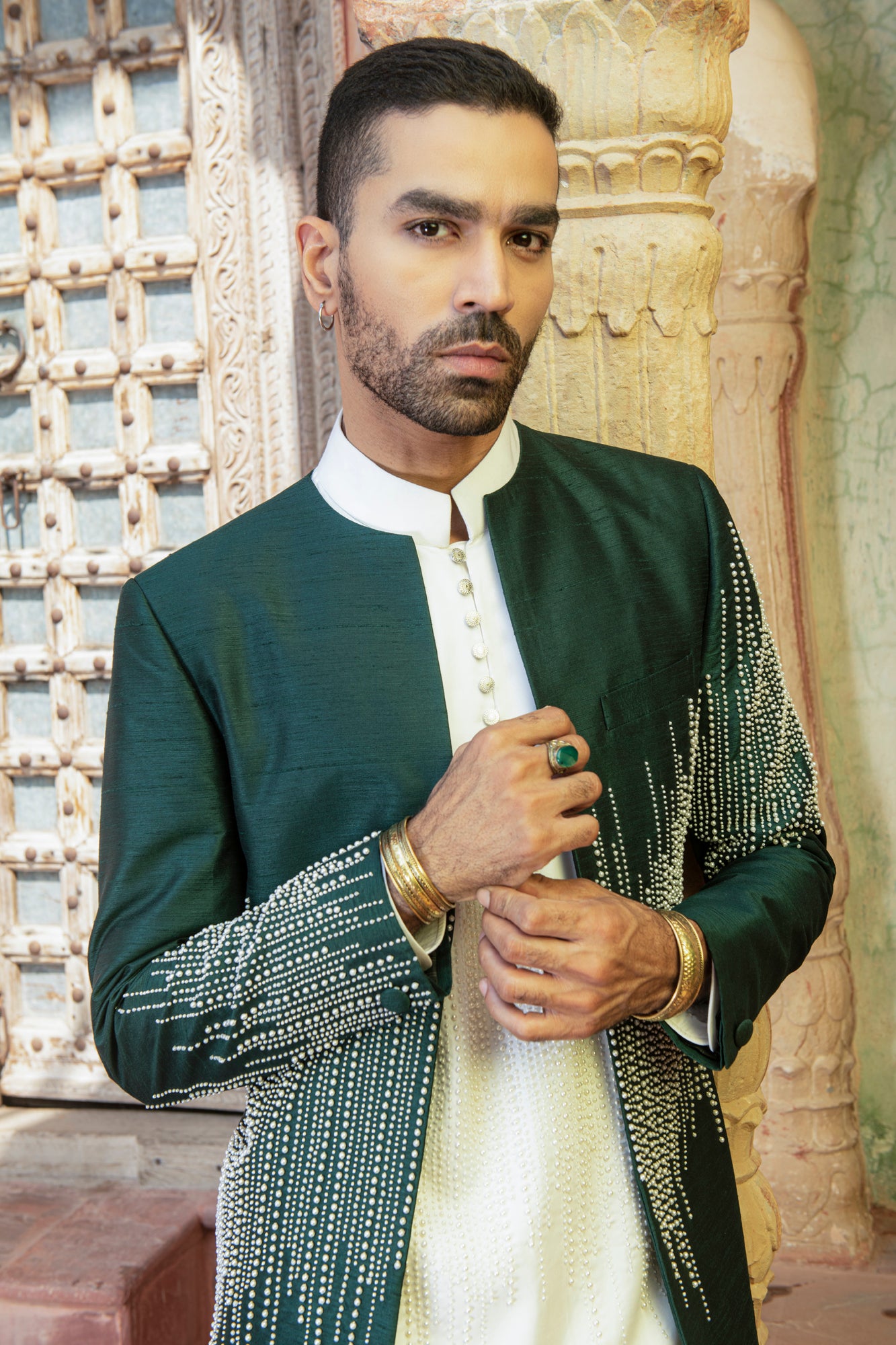 Featuring a forest green indowestern in silk dupion blend base with pearl embroidery. It is paired with a kurta and trousers. Accessorize this set with a pair of loafers for festive occasions or sangeet ceremonies.