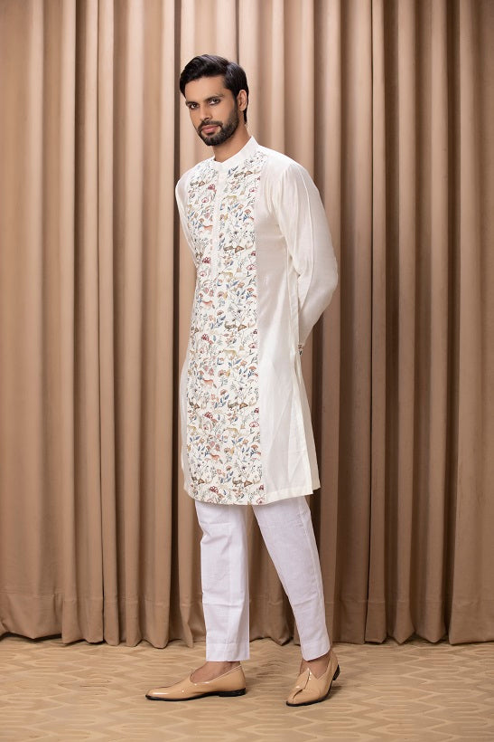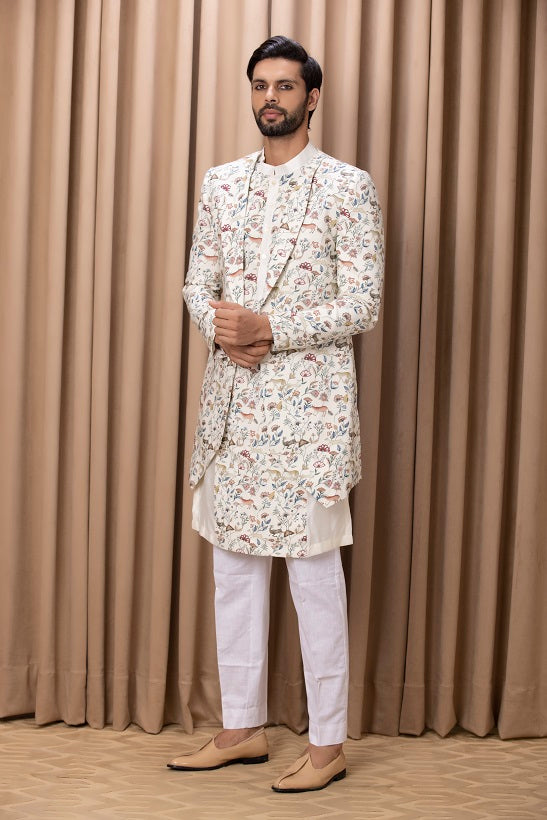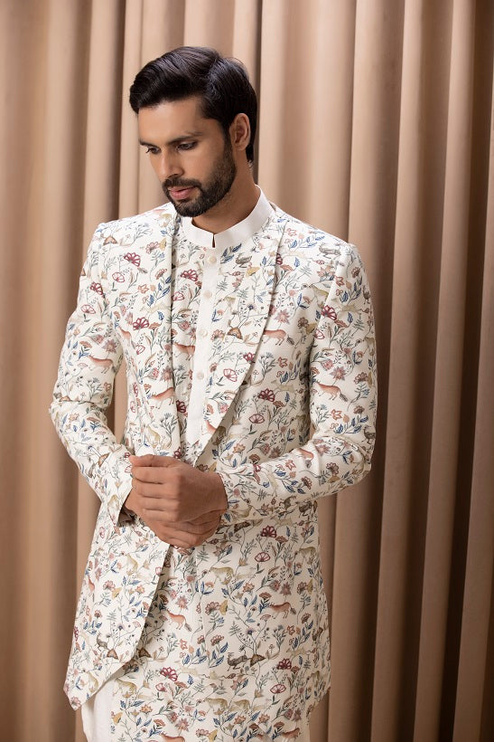 | Featuring a contemporary digital printed hand painted ivory indo-western set with a print on print look. Perfect for an outdoor occcasion. This includes a printed jacket, printed kurta and ivory linen trousers. |