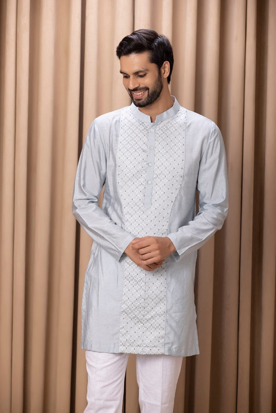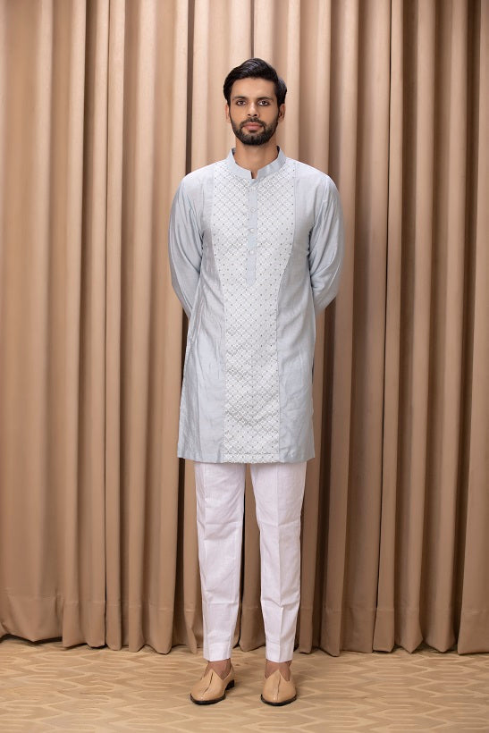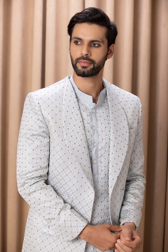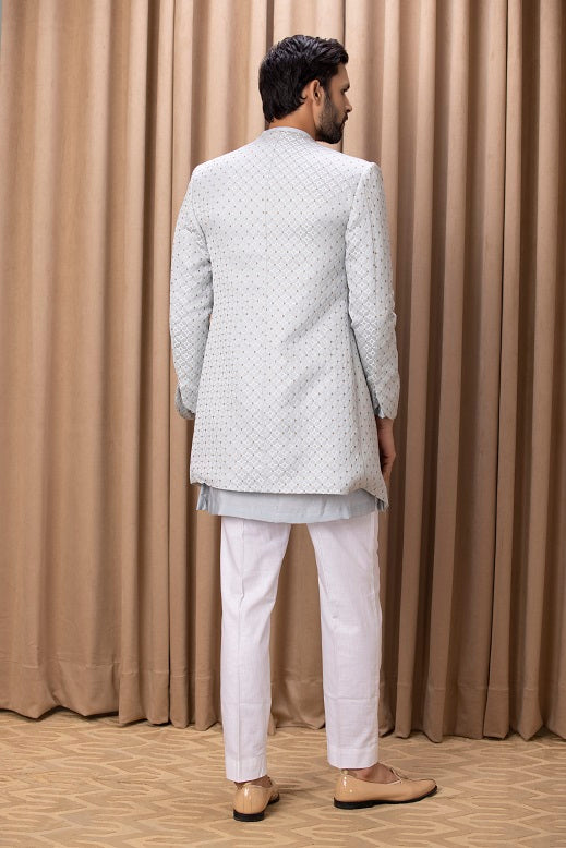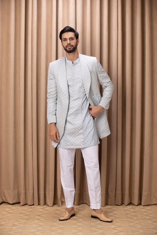 | Featuring a contemporary powder blue jaquard indo-western set. Perfect for an outdoor occcasion. This includes a jacket, kurta and ivory linen trousers. |