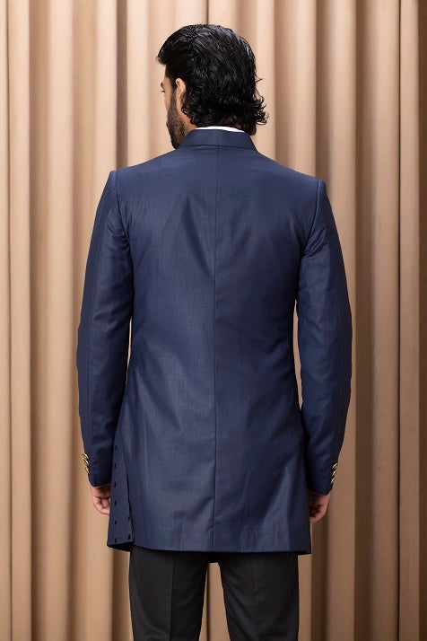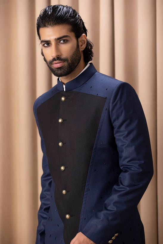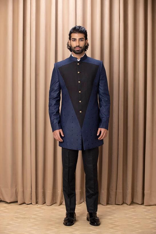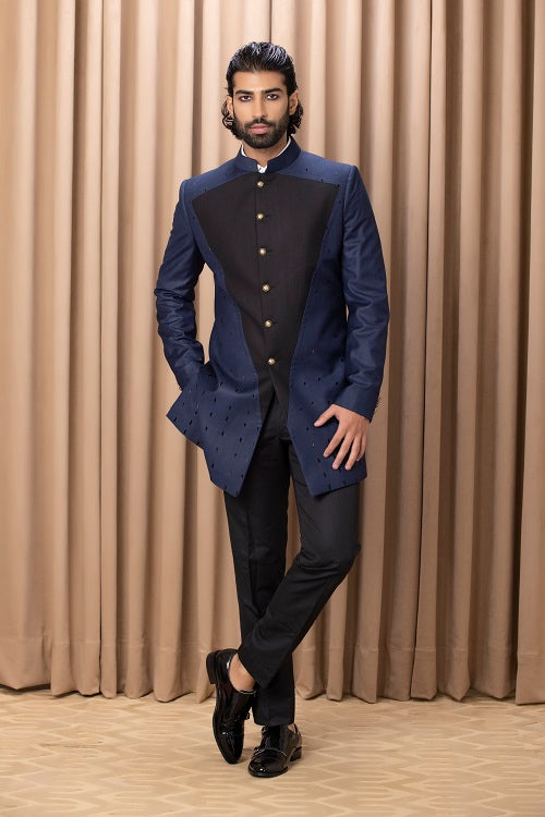 | Featuring a contemporary hand embroidered black & blue bandhgala set with intricate details.Perfect for a sagan or cocktail occcasion. This includes a jacket, black chinese collar shirt and black suiting trousers. |