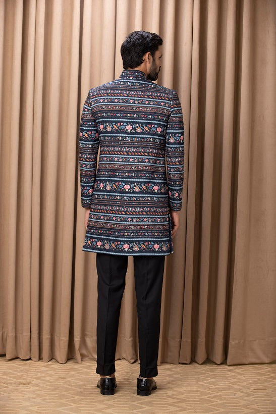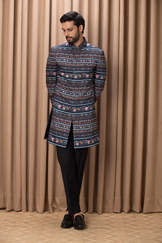 | Featuring a contemporary digital printed hand painted navy blue indo-western set. Perfect for a sagan or cocktail occcasion. This includes a printed jacket, black chinese collar shirt and black suiting trousers. |