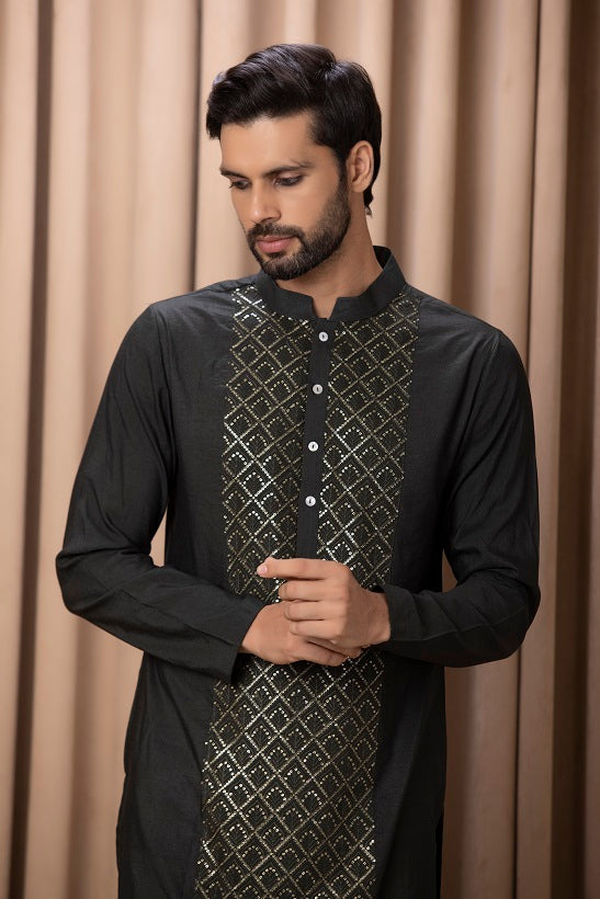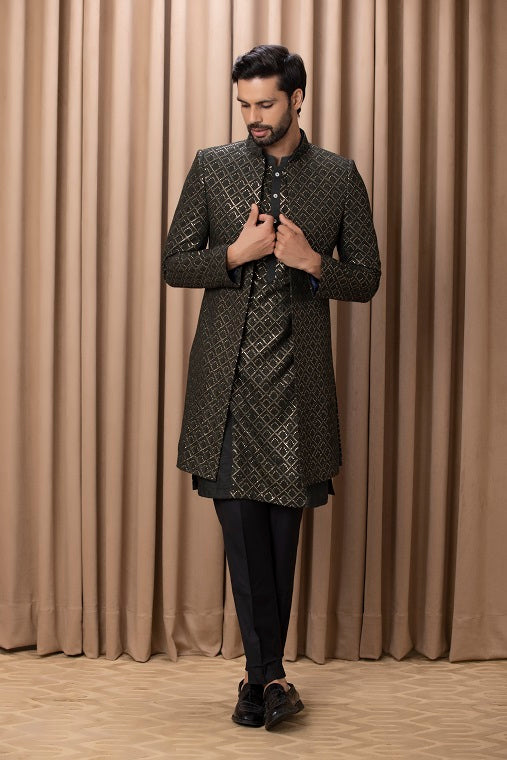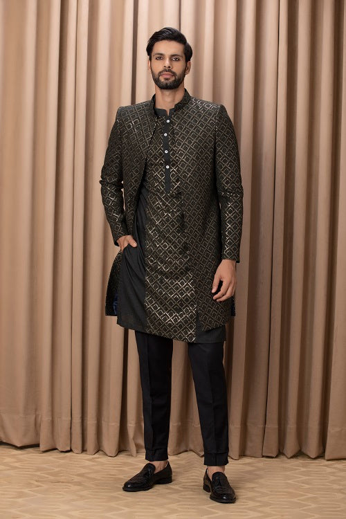 | Featuring a contemporary olive green thread embroidered indo-western set with intricate details. Perfect for a sagan or cocktail occcasion. This includes a jacket, kurta and black suiting trousers. |