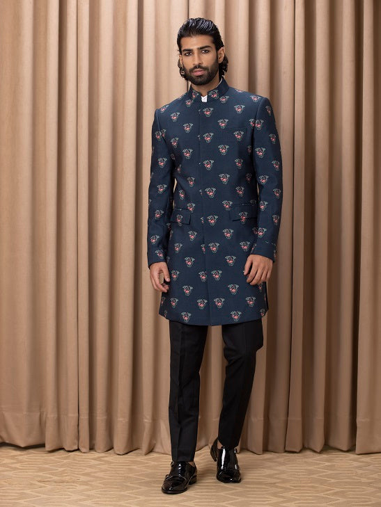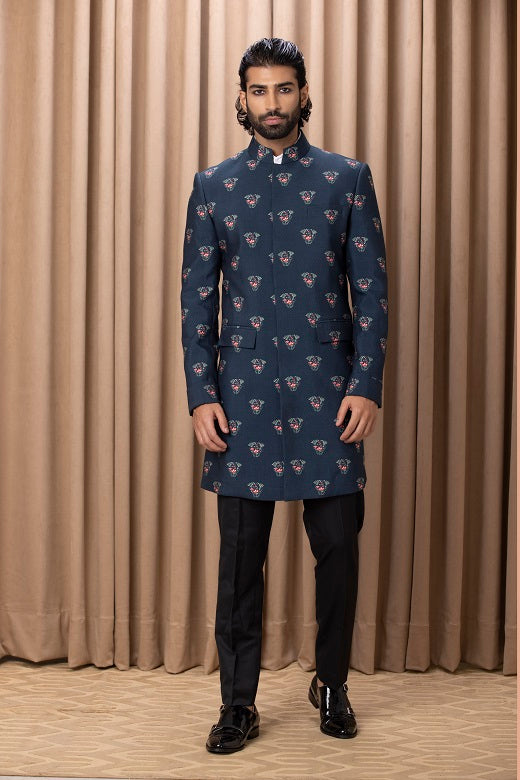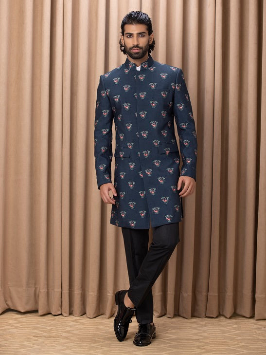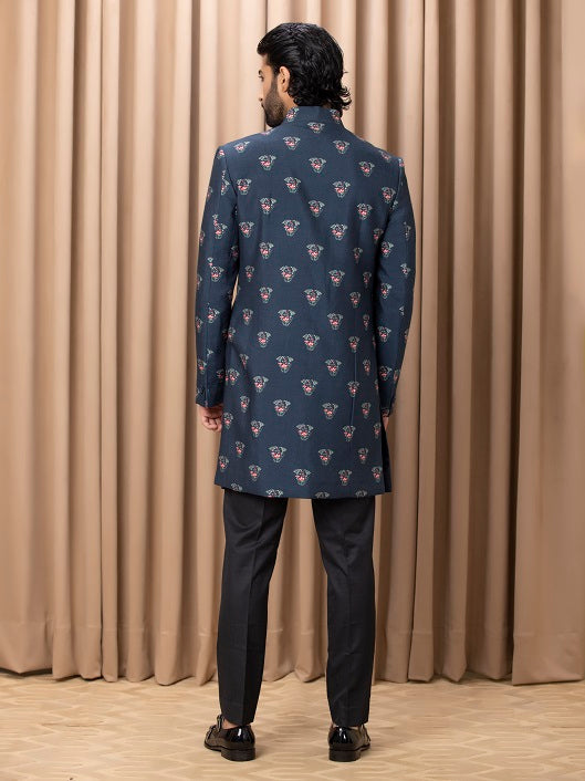 | Featuring a contemporary digital printed hand painted navy blue indo-western set. Perfect for a sagan or cocktail occcasion. This includes a printed jacket, black chinese collar shirt and black suiting trousers. |