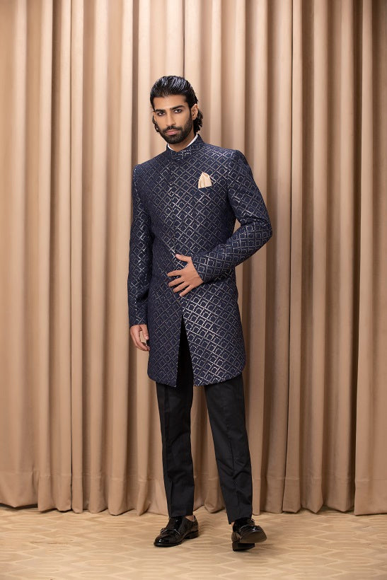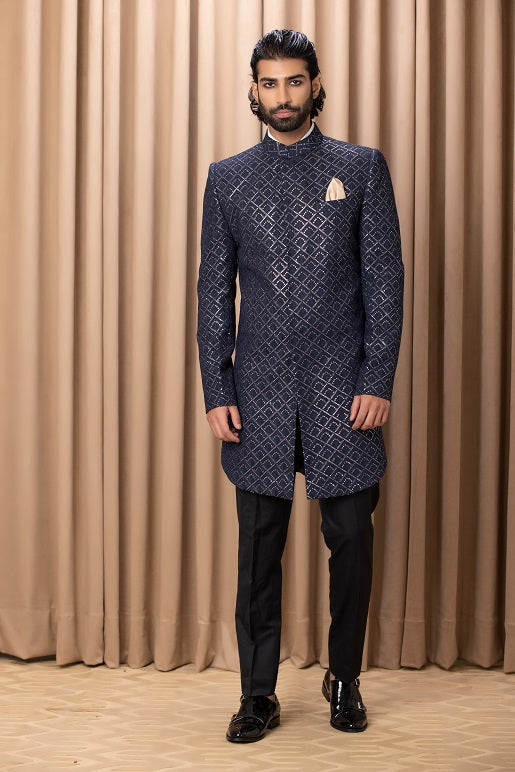 | Featuring a contemporary navy blue thread embroidered indo-western set with intricate details. Perfect for a sagan or cocktail occcasion. This includes a jacket, black chinese collar shirt and black suiting trousers. |