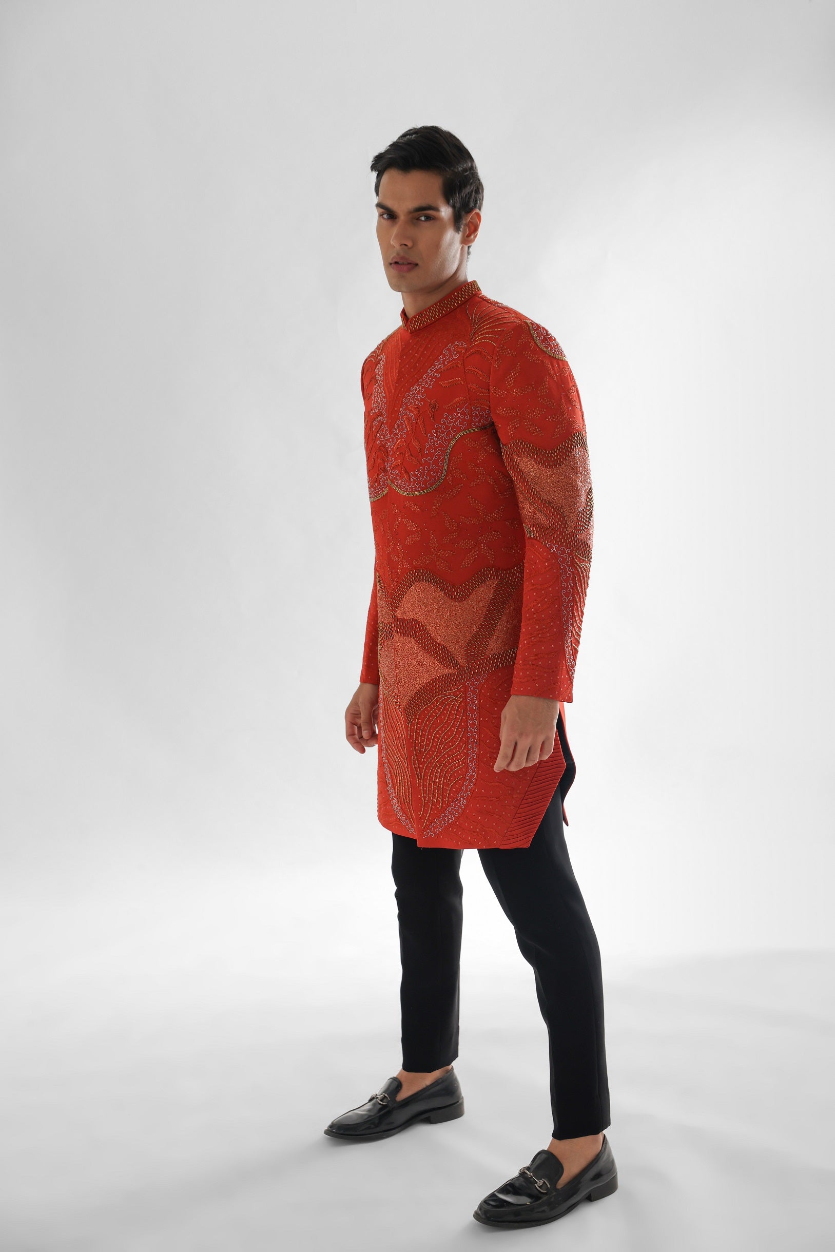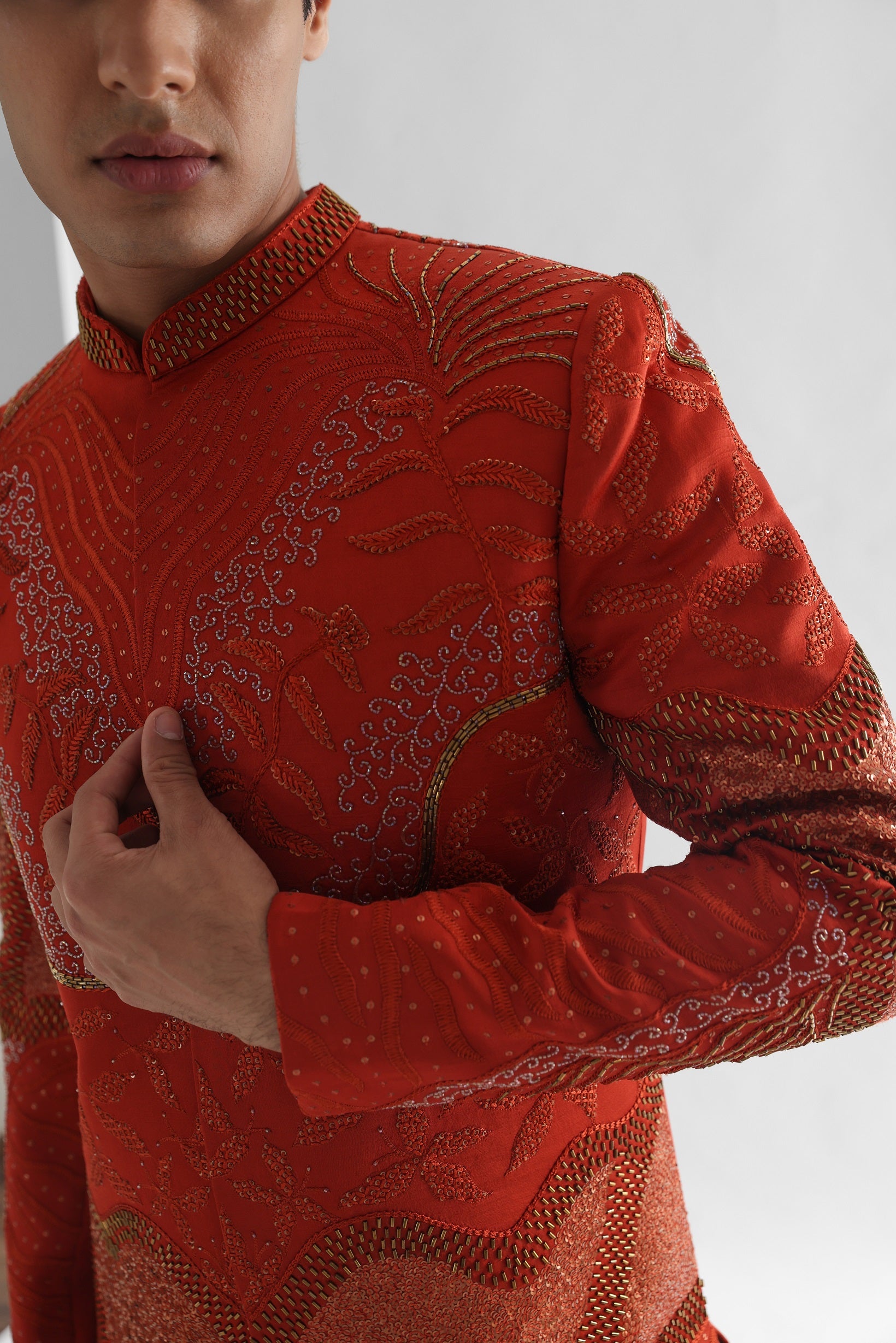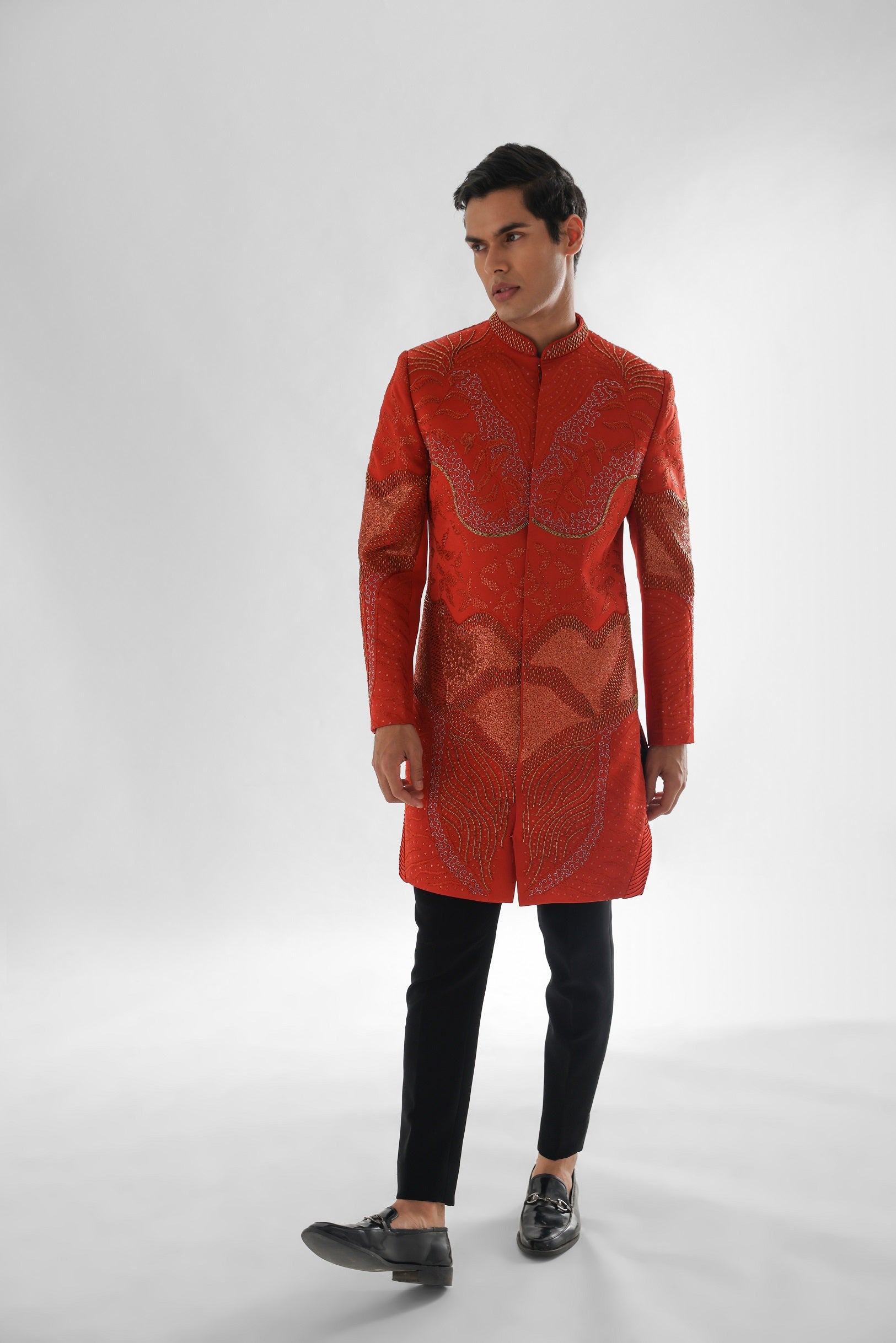 TERRESTRIAL EMBROIDERED ACHKAN HIGHLIGHTED WITH KATDANA AND SEQUENCE AND DETAILED WITH PINTUCKS