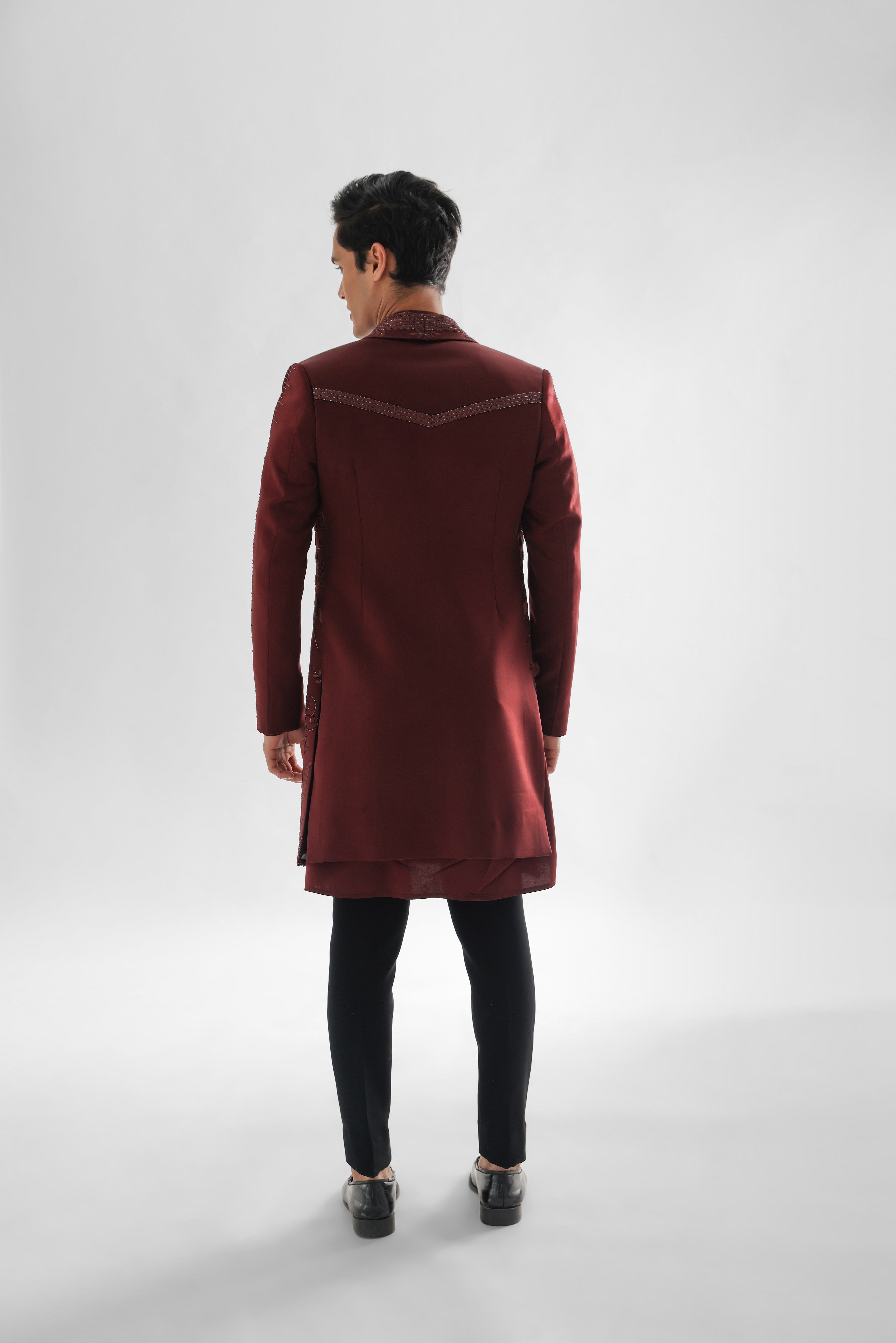 | CADBURRY BROWN OPEN JACKET ACHKAN PAIRED WITH STITCHLINE KURTA. EMBROIDERY DONE USING TONAL THREADWORK AND ANTIQUE GOLD HIGHLIGHTS |