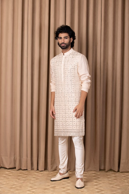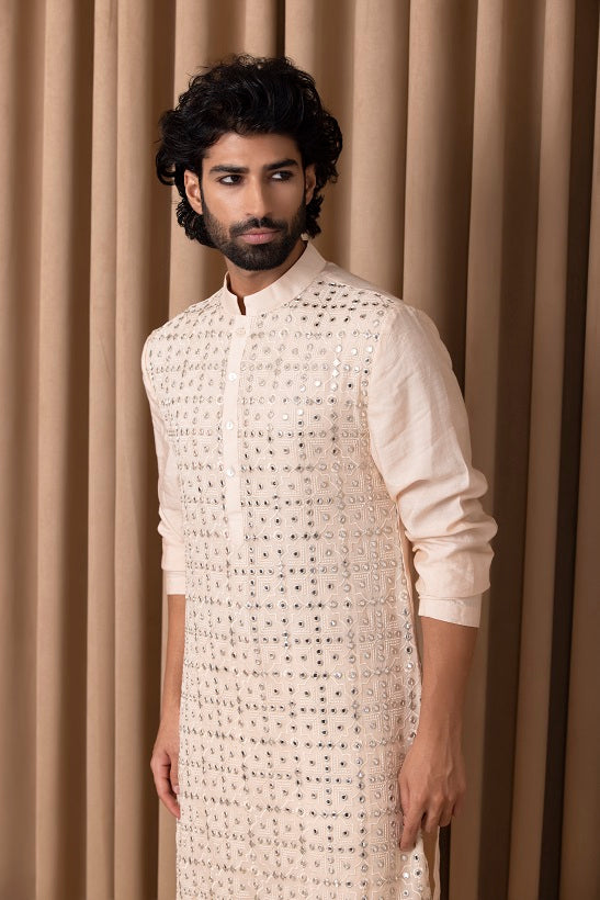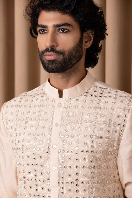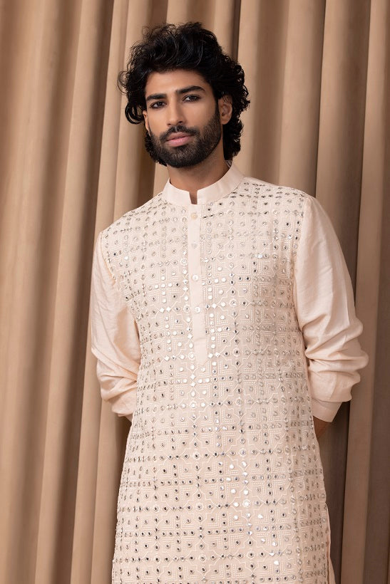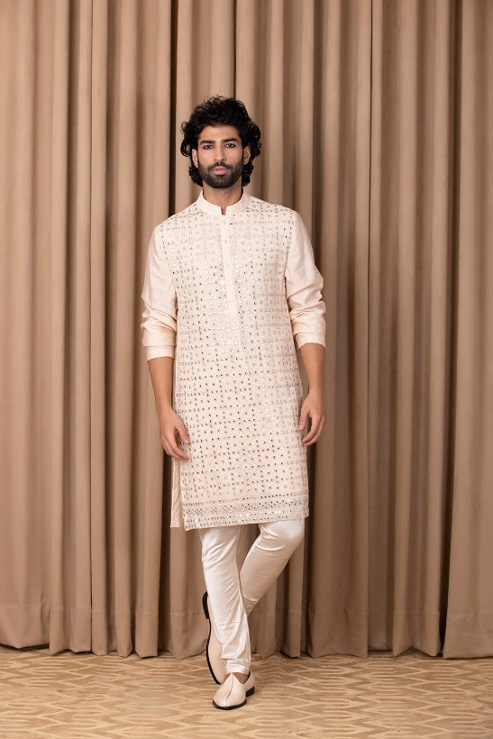 | Featuring a bespoke cotton silk kurta set in peach color with mirror work and machine embroidery on full front. Perfect for an outdoor occasion for the modern groom or groomsmen. This comes with an ivory classic churidaar |