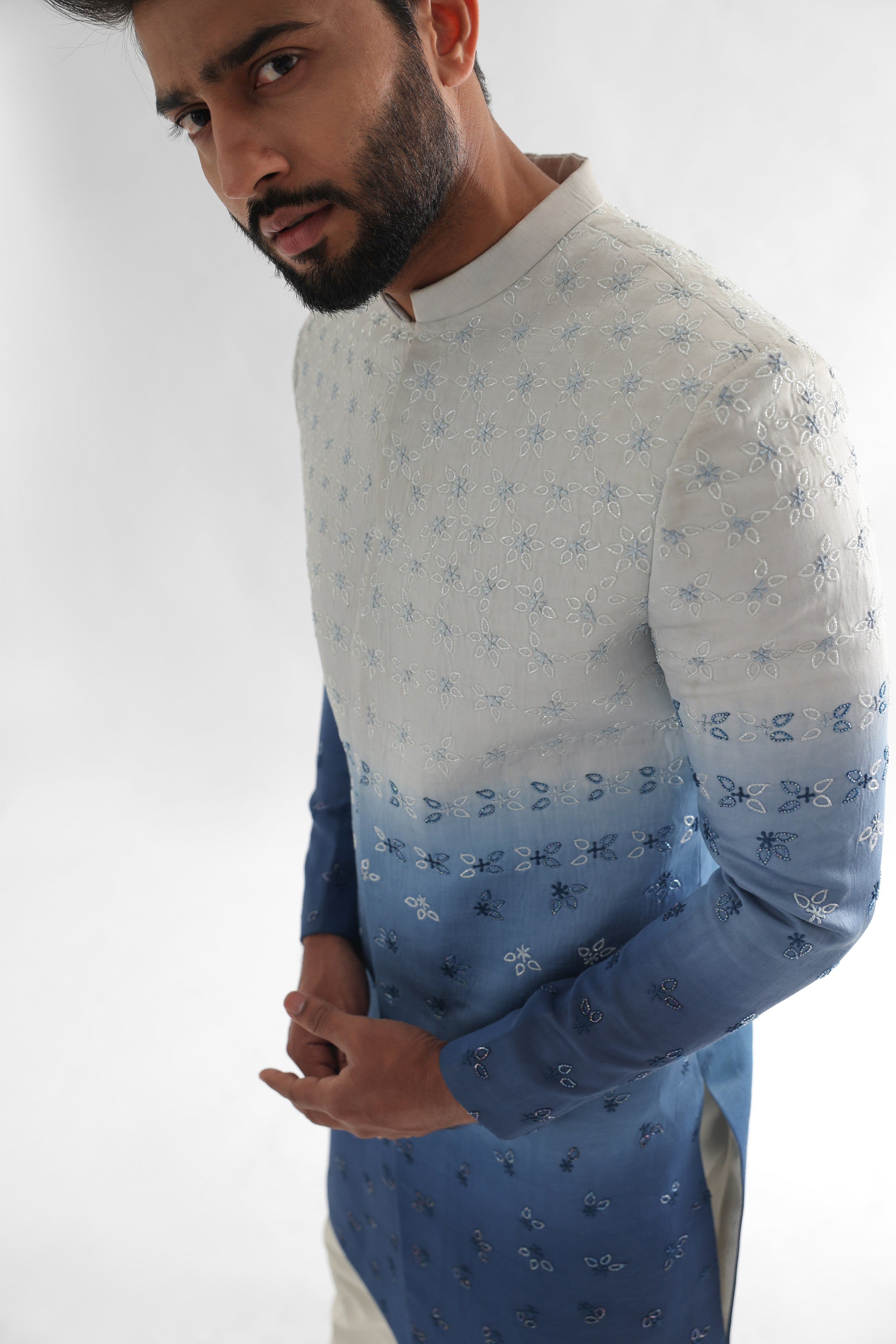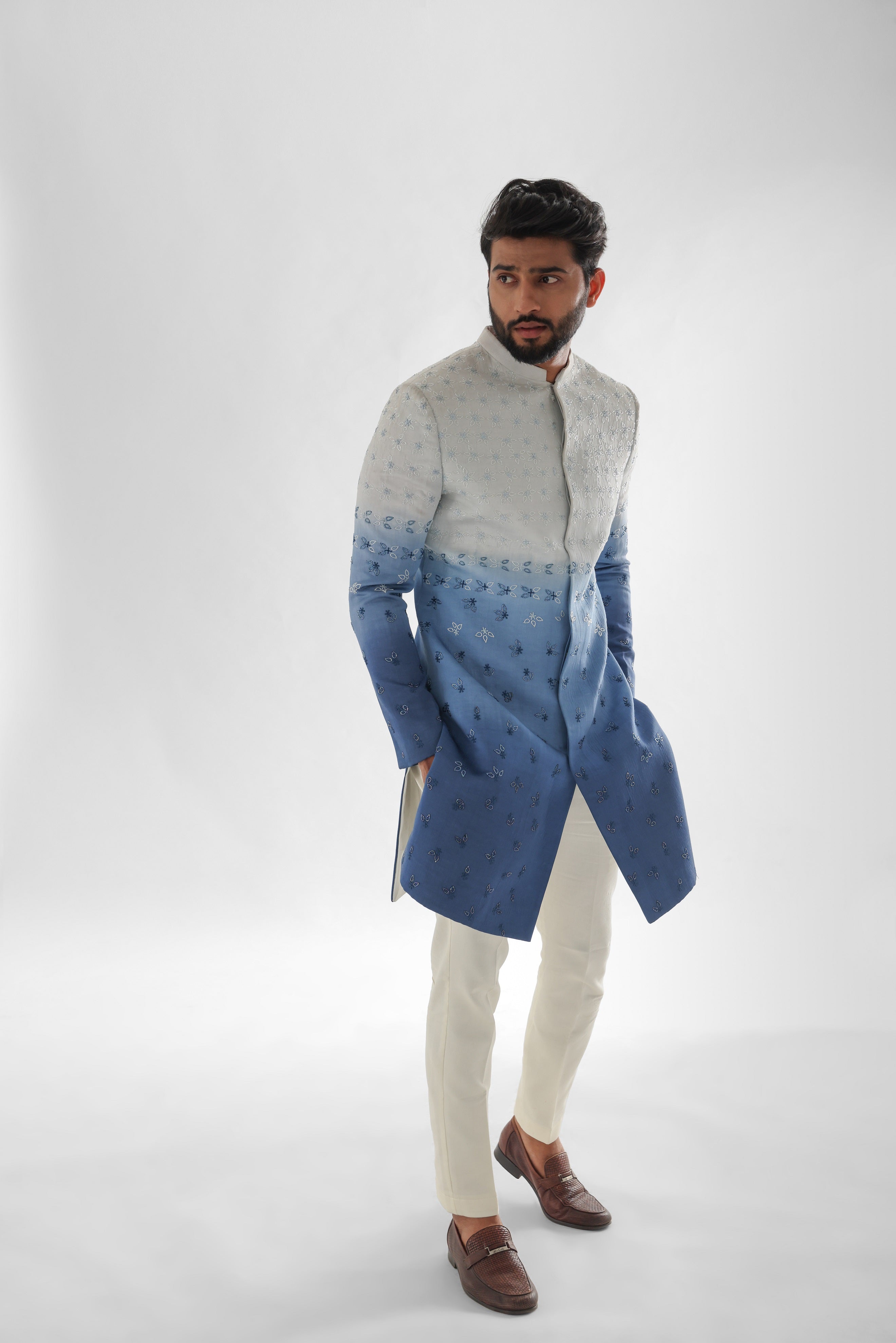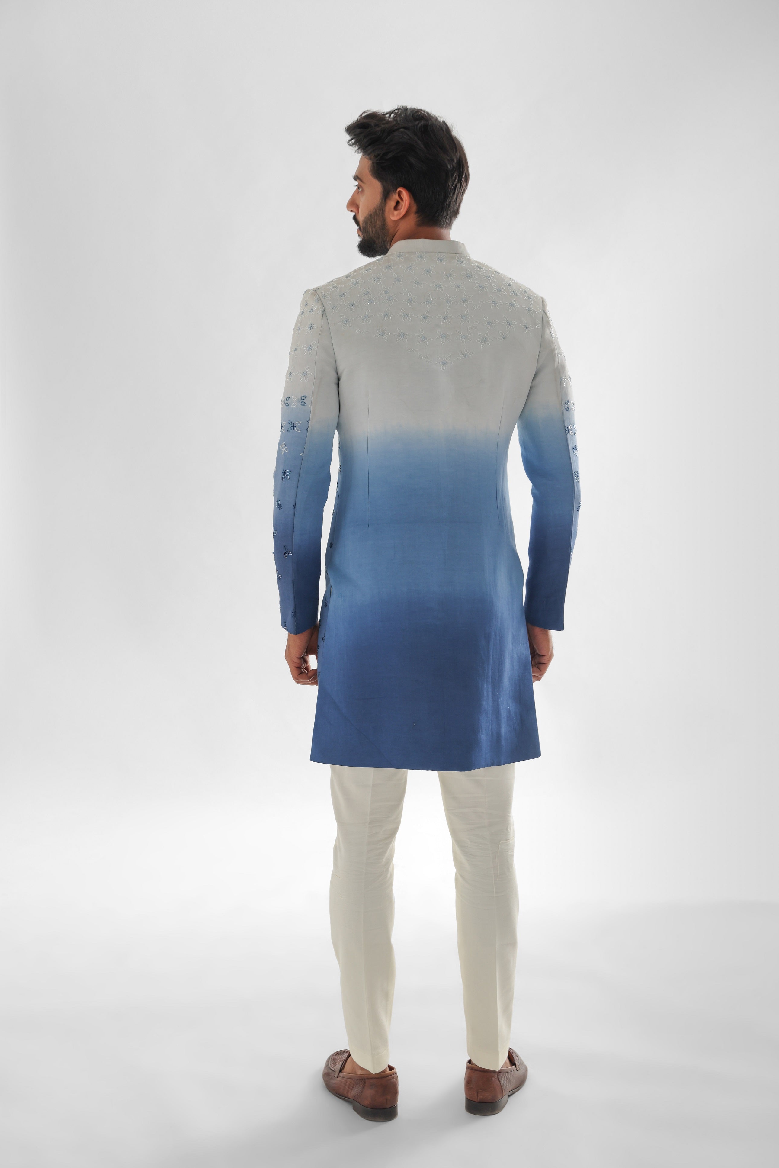 Sunset cream to prussian blue shaded achkan set