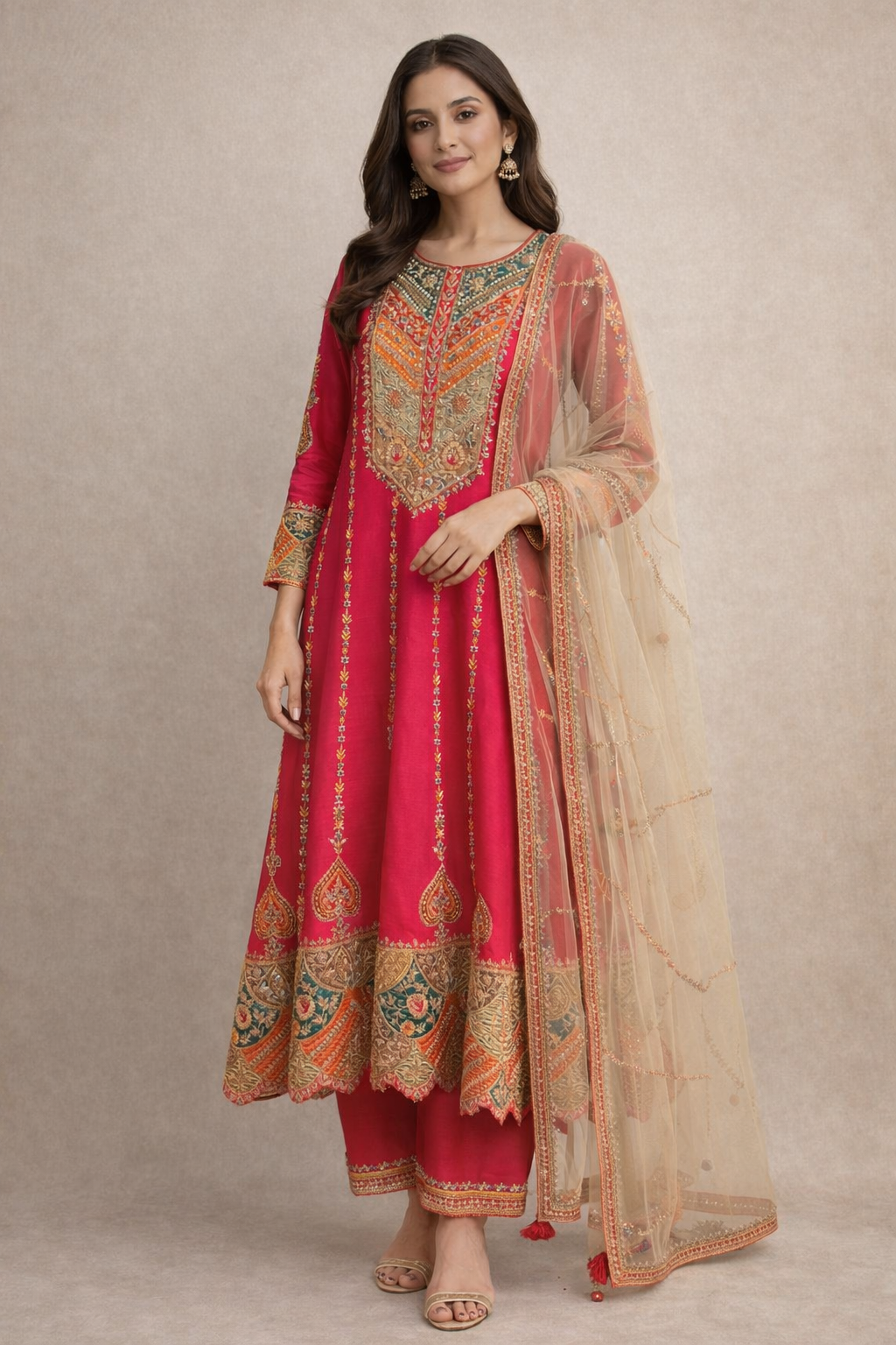Raw silk rani pink anarkali suit set